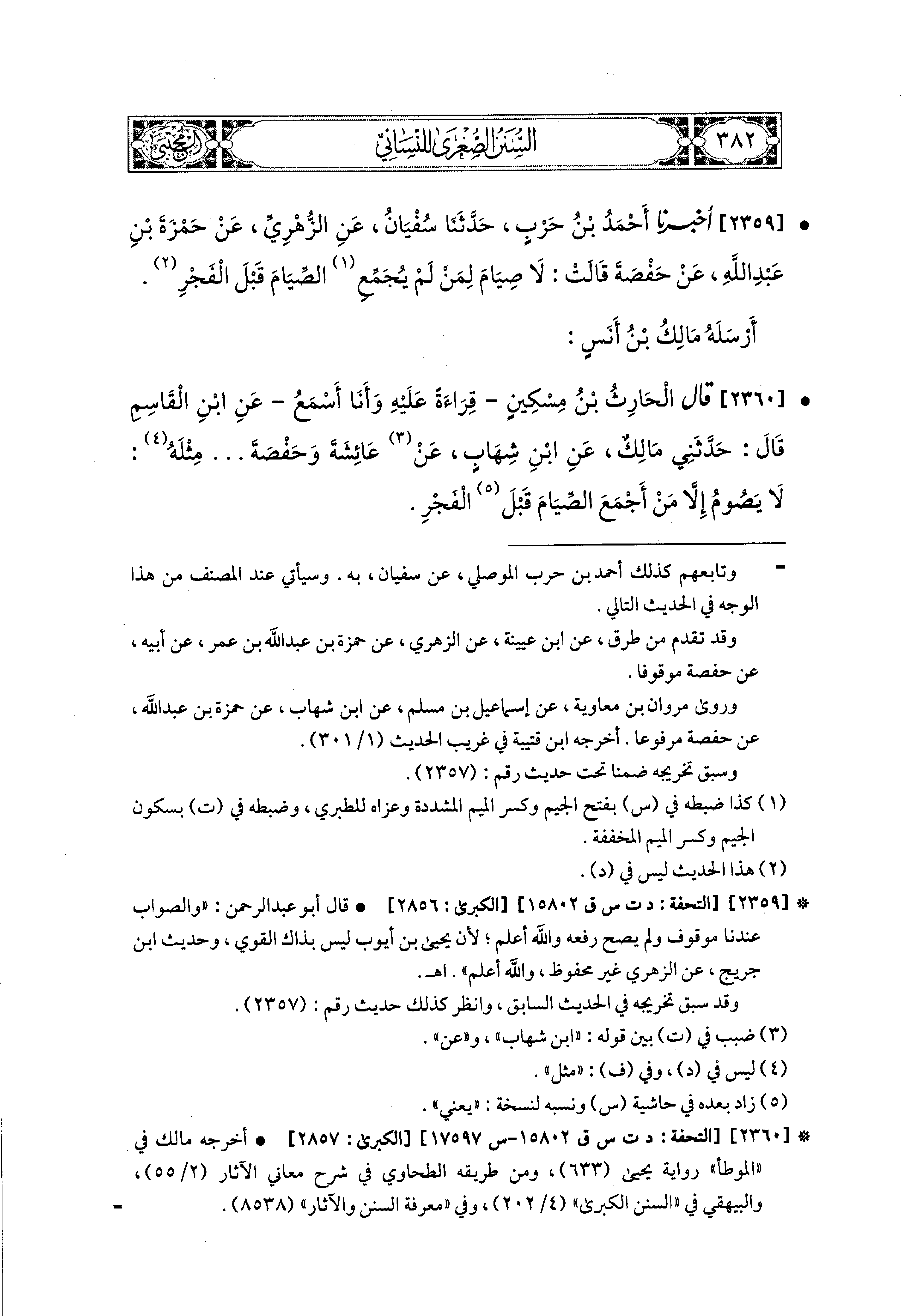2359- أَخبَرَنا أَحْمَدُ بْنُ حَرْبٍ، حَدثنا سُفيان، عَنِ الزُّهْرِيِّ، عَن حَمْزَةَ بْنِ عَبدِ اللهِ، عَن حَفْصَةَ، قَالَتْ: لاَ صِيَامَ لِمَنْ لَمْ يُجْمِعِ الصِّيَامَ قَبْلَ الفَجْرِ.