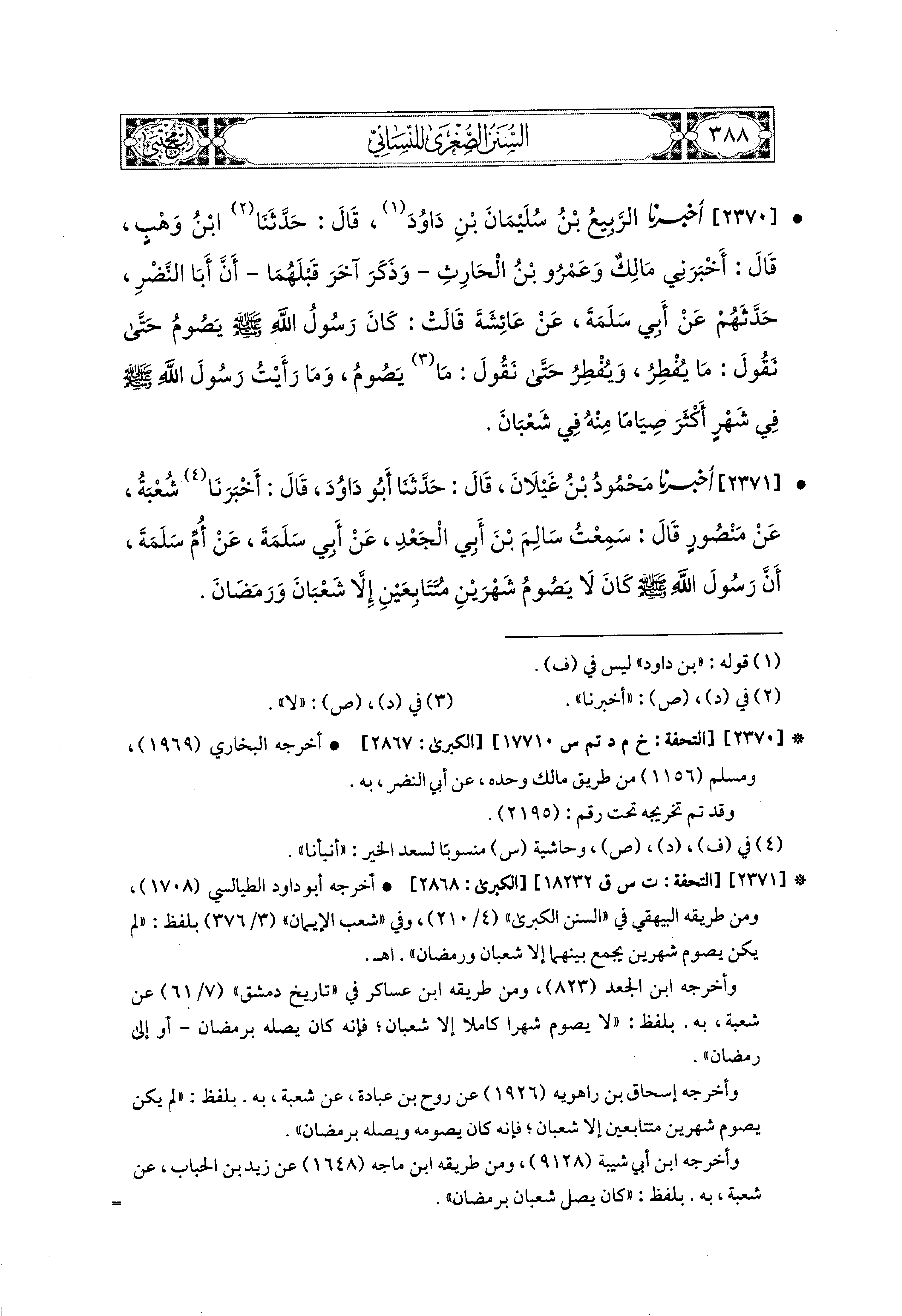 2370- أَخبَرَنا الرَّبِيعُ بْنُ سُلَيمَانَ بْنِ دَاوُدَ، قال: حَدثنا ابنُ وَهْبٍ، قَالَ: أَخبَرني مَالِكٌ، وَعَمْرُو بْنُ الحَارِثِ، وَذَكَرَ آخَرَ قَبْلَهُمَا، أَنَّ أَبَا النَّضْرِ، حَدَّثَهُمْ عَن أَبي سَلَمَةَ، عَن عَائِشَةَ، قَالَتْ: كَانَ رَسُولُ اللهِ صَلى الله عَليه وسَلم يَصُومُ حَتَّى نَقُولَ مَا يُفْطِرُ، وَيُفْطِرُ حَتَّى نَقُولَ مَا يَصُومُ، وَمَا رَأَيْتُ رَسُولَ اللهِ صَلى الله عَليه وسَلم فِي شَهْرٍ أَكْثَرَ صِيَامًا مِنْهُ فِي شَعْبَانَ.