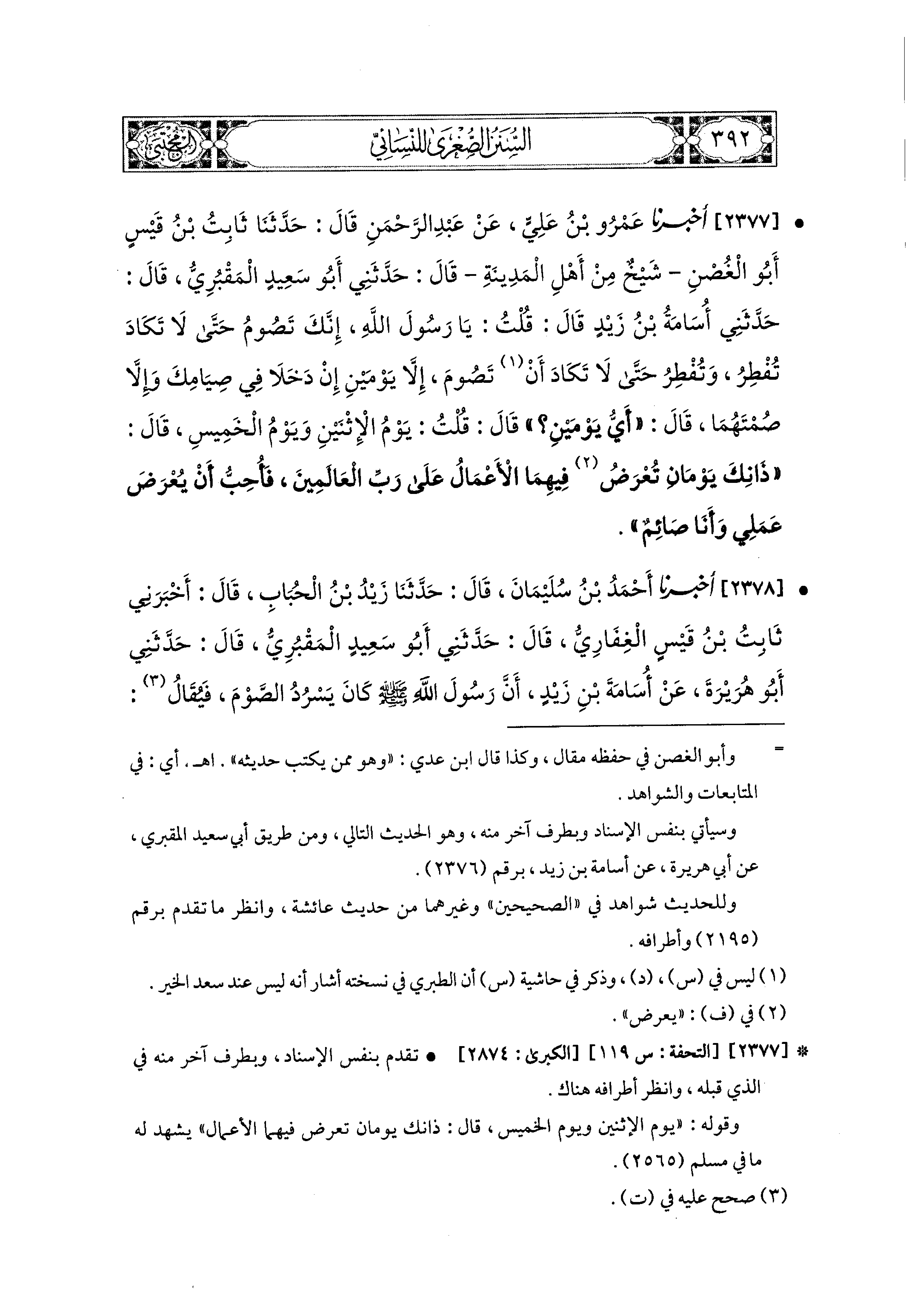 2377- أَخبَرَنا عَمْرُو بْنُ عَلِيٍّ، عَن عَبدِ الرَّحمَنِ، قال: حَدثنا ثَابِتُ بْنُ قَيْسٍ أَبو الغُصْنِ، شَيْخٌ مِنْ أَهْلِ المَدِينَةِ، قَالَ: حَدَّثَني أَبو سَعيدٍ المَقْبُرِيُّ، قَالَ: حَدَّثَني أُسَامَةُ بْنُ زَيْدٍ، قَالَ: قُلْتُ: يَا رَسُولَ اللهِ، إِنَّكَ تَصُومُ حَتَّى لاَ تَكَادَ تُفْطِرُ، وَتُفْطِرُ حَتَّى لاَ تَكَادَ أَنْ تَصُومَ، إِلاَّ يَوْمَيْنِ إِنْ دَخَلاَ فِي صِيَامِكَ وَإِلاَّ صُمْتَهُمَا، قَالَ: أَيُّ يَوْمَيْنِ؟ قال قُلْتُ: يَوْمَ الاِثْنَيْنِ وَيَوْمَ الخَميسِ، قَالَ: ذَانِكَ يَوْمَانِ تُعْرَضُ فِيهِمَا الأَعْمَالُ عَلَى رَبِّ العَالَمينَ، فَأُحِبُّ أَنْ يُعْرَضَ عَمَلِي وَأَنَا صَائِمٌ.