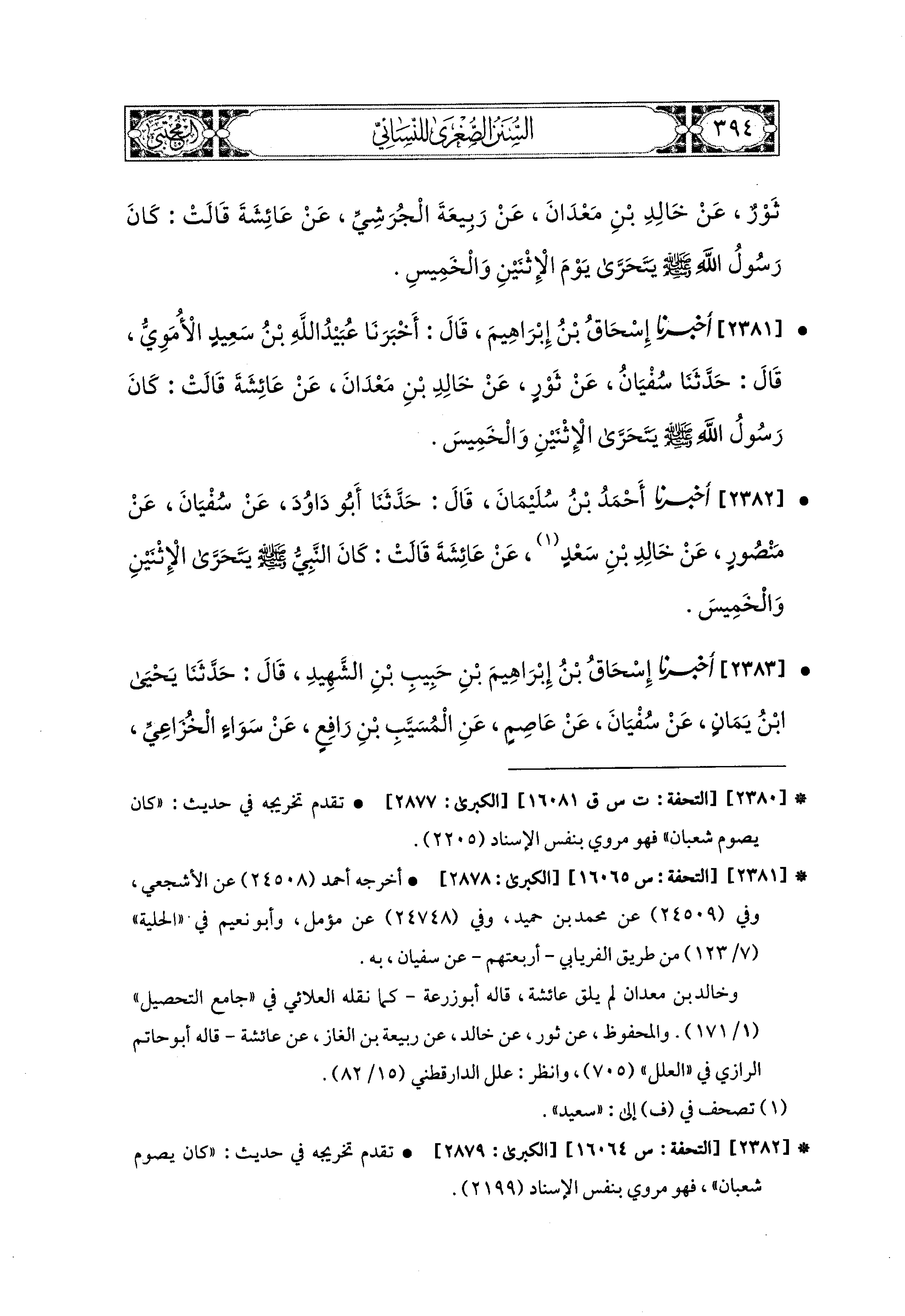 2382- أَخبَرَنا أَحْمَدُ بْنُ سُلَيمَانَ، قال: حَدثنا أَبو دَاوُدَ، عَن سُفيَانَ، عَن مَنْصُورٍ، عَن خَالِدِ بْنِ سَعْدٍ، عَن عَائِشَةَ، قَالَتْ: كَانَ النَّبيِّ صَلى الله عَليه وسَلم يَتَحَرَّى يَوْمَ الاِثْنَيْنِ وَالخَميسِ.