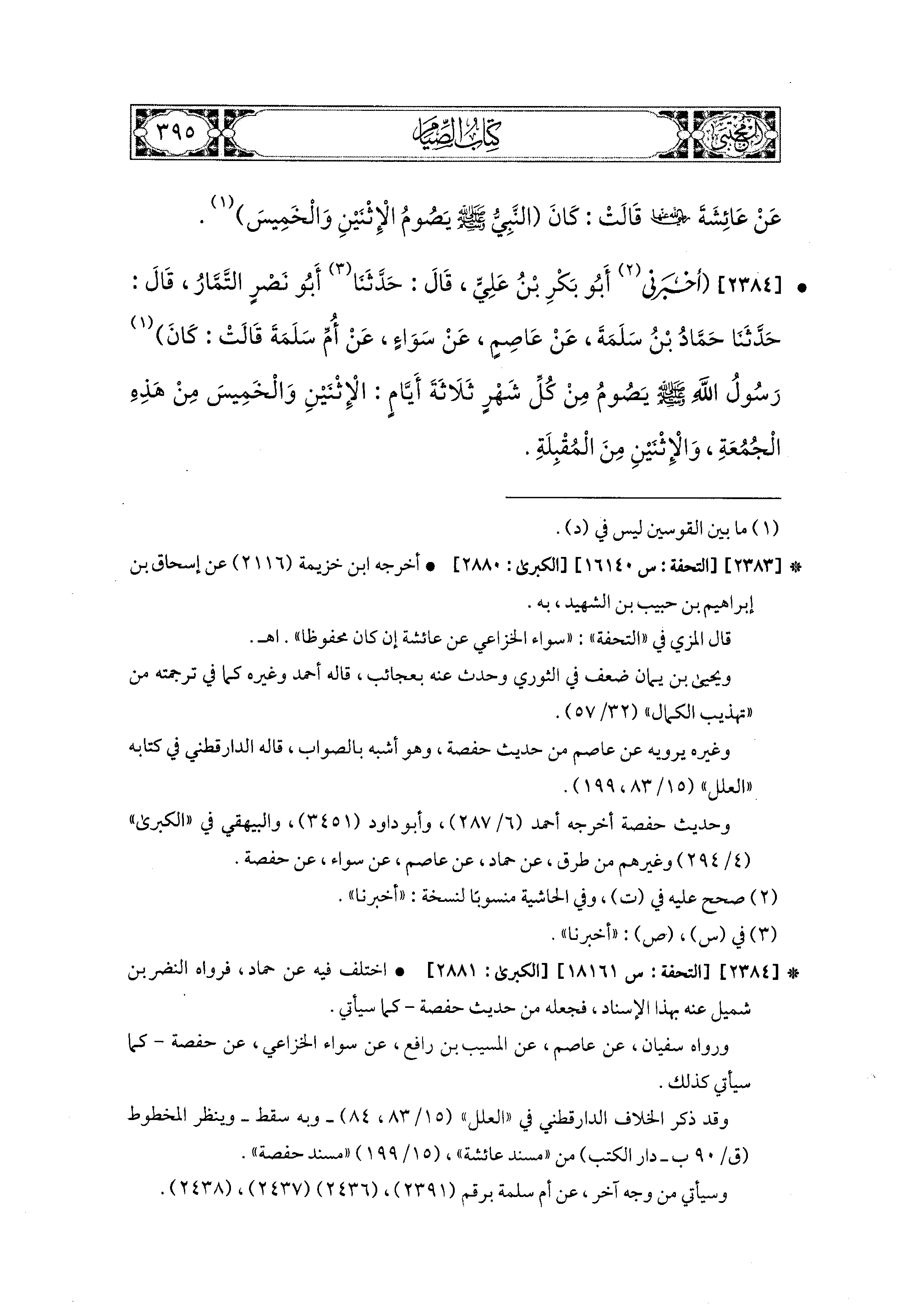 2384- أَخبَرني أَبو بَكْرِ بْنُ عَلِيٍّ، قال: حَدثنا أَبو نَصْرٍ التَّمَّارُ، قال: حَدثنا حَمَّادُ بْنُ سَلَمَةَ، عَن عَاصِمٍ، عَن سَوَاءٍ، عَن أُمِّ سَلَمَةَ، قَالَتْ: كَانَ رَسُولُ اللهِ صَلى الله عَليه وسَلم يَصُومُ مِنْ كُلِّ شَهْرٍ ثَلاَثَةَ أَيَّامٍ: الاِثْنَيْنِ وَالخَميسَ مِنْ هَذِهِ الجُمُعَةِ، وَالاِثْنَيْنِ مِنَ المُقْبِلَةِ.