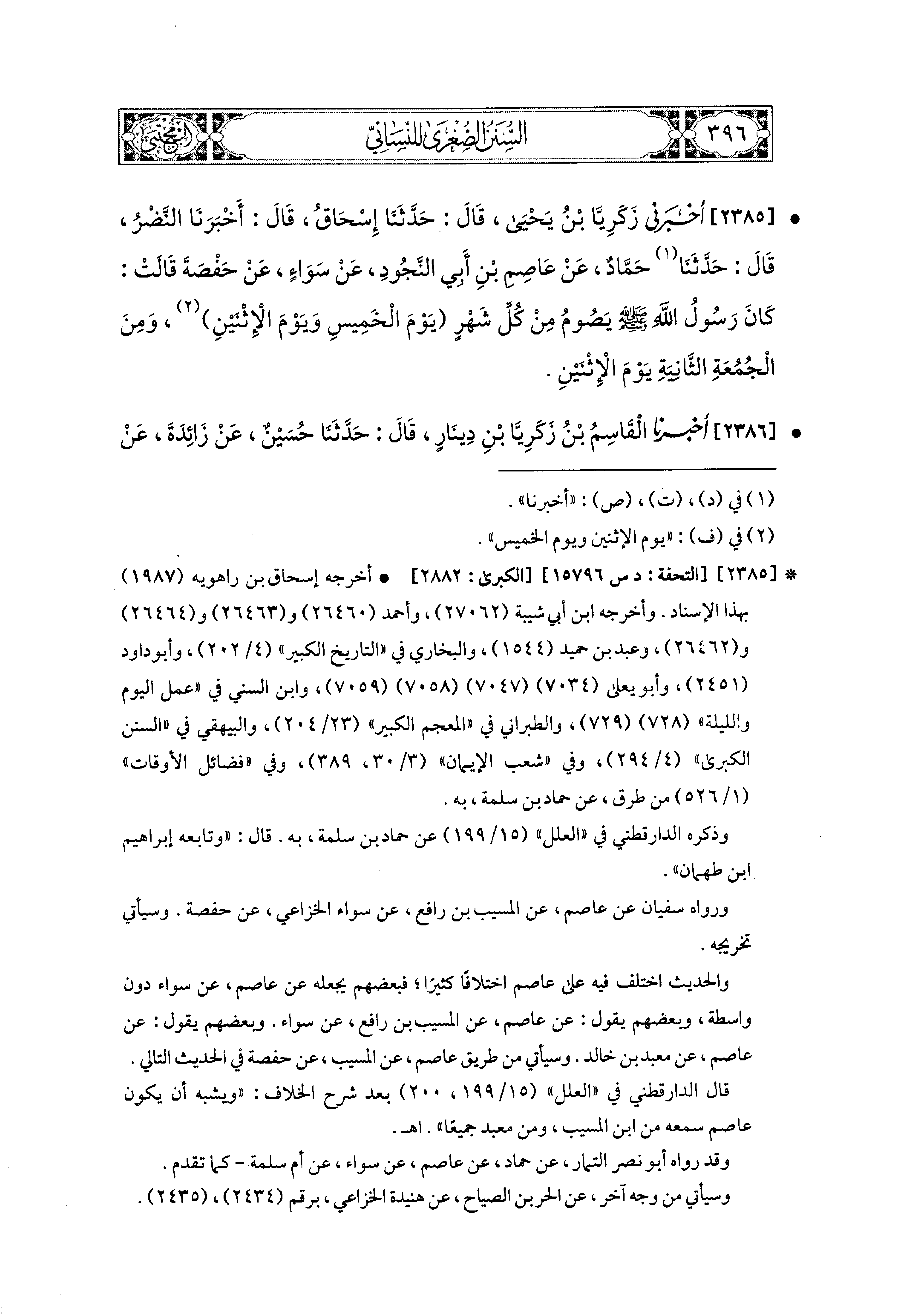 2385- أَخبَرني زَكَرِيَّا بْنُ يَحيَى، قال: حَدثنا إِسحَاقُ، قَالَ: أَخبَرنا النَّضْرُ، قَالَ: حَدثنا حَمَّادٌ، عَن عَاصِمِ بْنِ أَبي النَّجُودِ، عَن سَوَاءٍ، عَن حَفْصَةَ، قَالَتْ: كَانَ رَسُولُ اللهِ صَلى الله عَليه وسَلم يَصُومُ مِنْ كُلِّ شَهْرٍ يَوْمَ الخَميسِ، وَيَوْمَ الاِثْنَيْنِ، وَمِنَ الجُمُعَةِ الثَّانيَةِ يَوْمَ الاِثْنَيْنِ.
