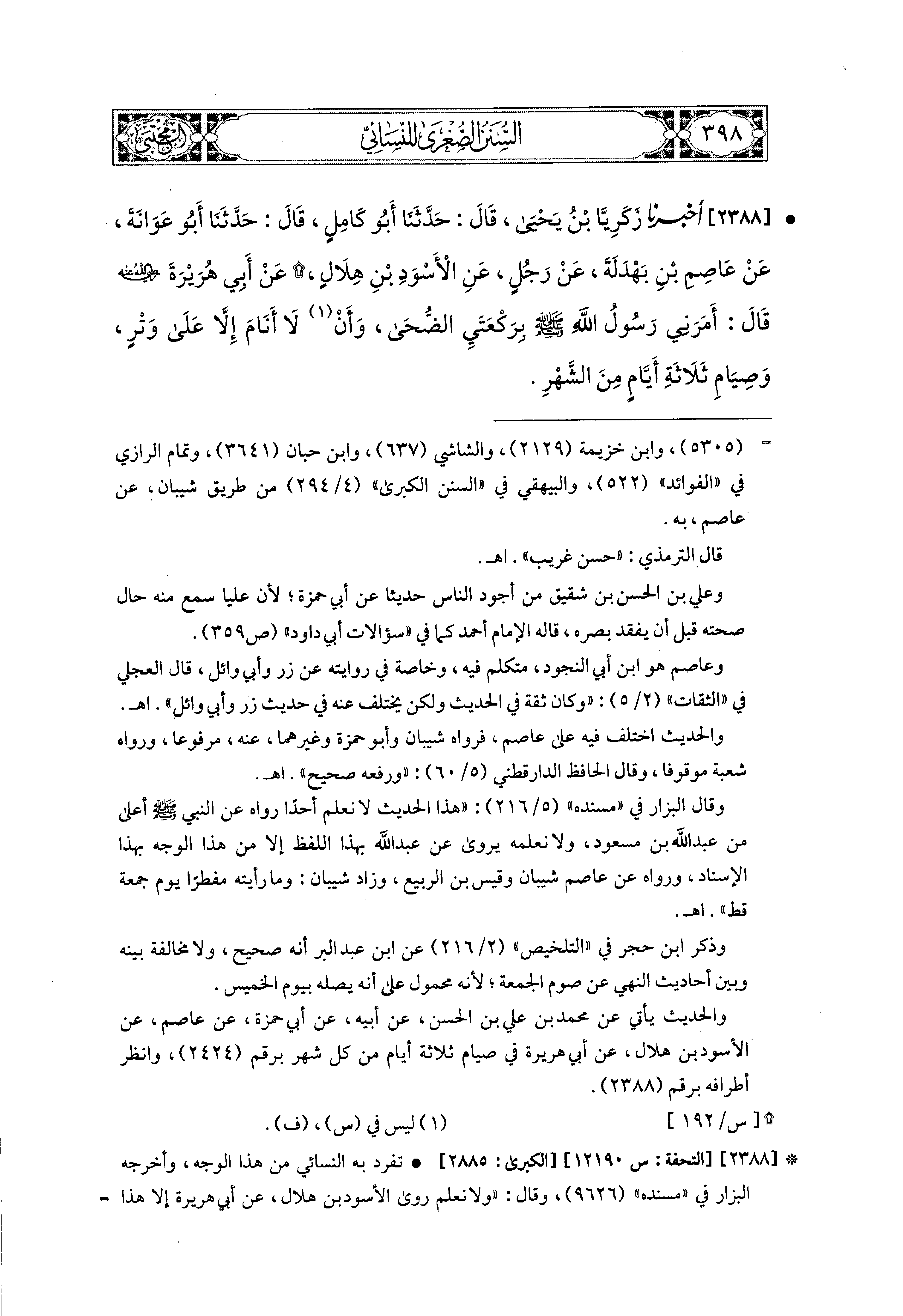 2388- أَخبَرَنا زَكَرِيَّا بْنُ يَحيَى، قال: حَدثنا أَبو كَامِلٍ، قال: حَدثنا أَبو عَوَانَةَ، عَن عَاصِمِ بْنِ بَهْدَلَةَ، عَن رَجُلٍ، عَنِ الأَسْوَدِ بْنِ هِلاَلٍ، عَن أَبي هُرَيرَةَ رَضِيَ اللهُ عَنْهُ، قَالَ: أَمَرَني رَسُولُ اللهِ صَلى الله عَليه وسَلم بِرَكْعَتَيِ الضُّحَى، وَأَنْ لاَ أَنَامَ إِلاَّ عَلَى وِتْرٍ، وَصِيَامِ ثَلاَثَةِ أَيَّامٍ مِنَ الشَّهْرِ.
