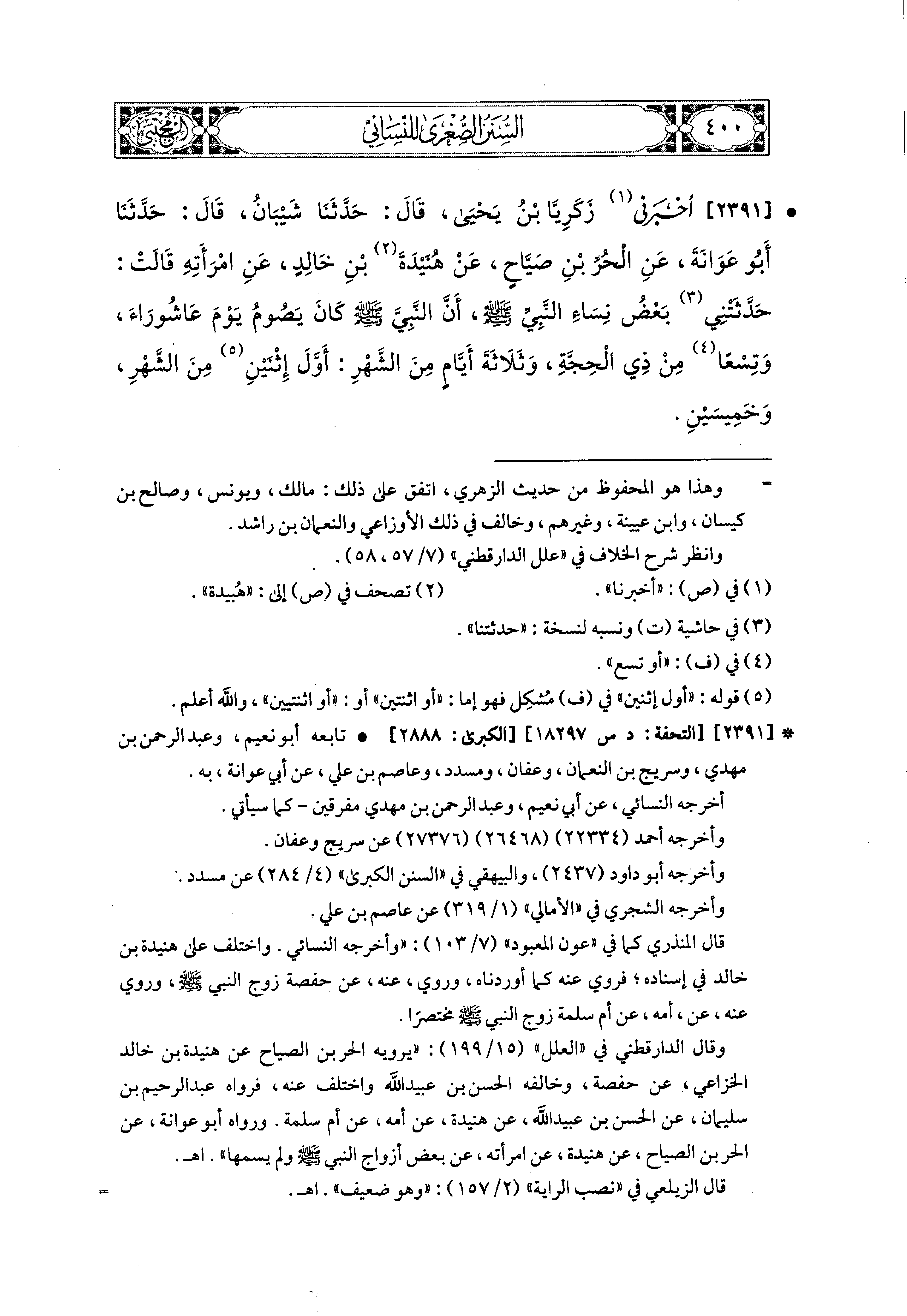 2391- أَخبَرني زَكَرِيَّا بْنُ يَحيَى، قال: حَدثنا شَيْبَانُ، قال: حَدثنا أَبو عَوَانَةَ، عَنِ الحُرِّ بْنِ صَيَّاحٍ، عَن هُنَيْدَةَ بْنِ خَالِدٍ، عَنِ امْرَأَتِهِ، قَالَتْ: حَدَّثَتْني بَعْضُ نِسَاءِ النَّبيِّ، صَلى الله عَليه وسَلم، أَنَّ النَّبيَّ صَلى الله عَليه وسَلم كَانَ يَصُومُ يَوْمَ عَاشُورَاءَ، وَتِسْعًا مِنْ ذِي الحِجَّةِ، وَثَلاَثَةَ أَيَّامٍ مِنَ الشَّهْرِ أَوَّلَ اثْنَيْنِ مِنَ الشَّهْرِ وَخَميسَيْنِ.