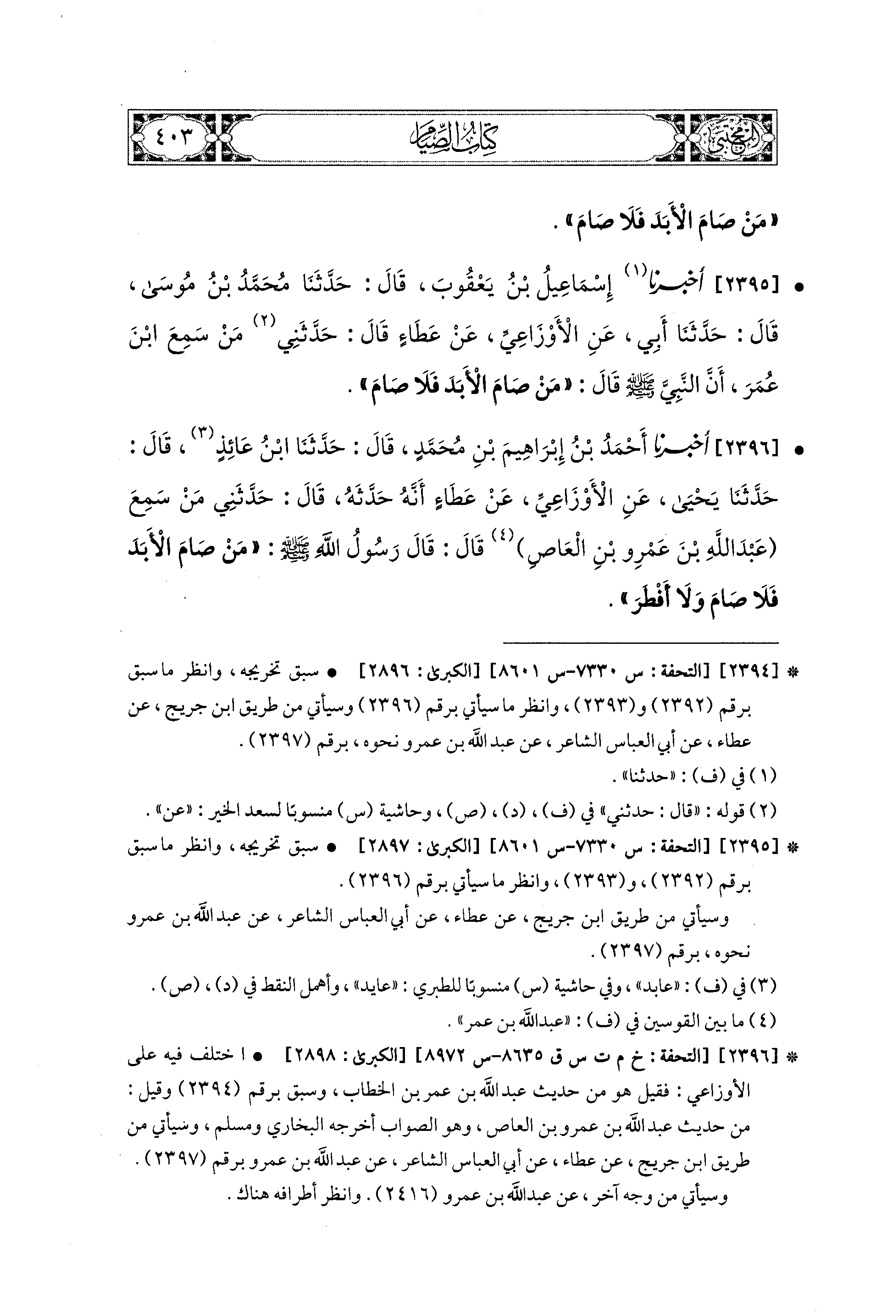 2396- أَخبَرَنا أَحْمَدُ بْنُ إِبراهِيمَ بْنِ مُحَمدٍ، قال: حَدثنا ابنُ عَائِذٍ، قال: حَدثنا يَحيَى، عَنِ الأَوْزَاعِيِّ، عَن عَطَاءٍ، أَنَّهُ حَدَّثَهُ، قَالَ: حَدَّثَني مَنْ سَمِعَ عَبدَ اللهِ بْنَ عَمْرِو بْنِ العَاصِ، قَالَ: قَالَ رَسُولُ اللهِ صَلى الله عَليه وسَلم: مَنْ صَامَ الأَبَدَ فَلاَ صَامَ، وَلاَ أَفْطَرَ.