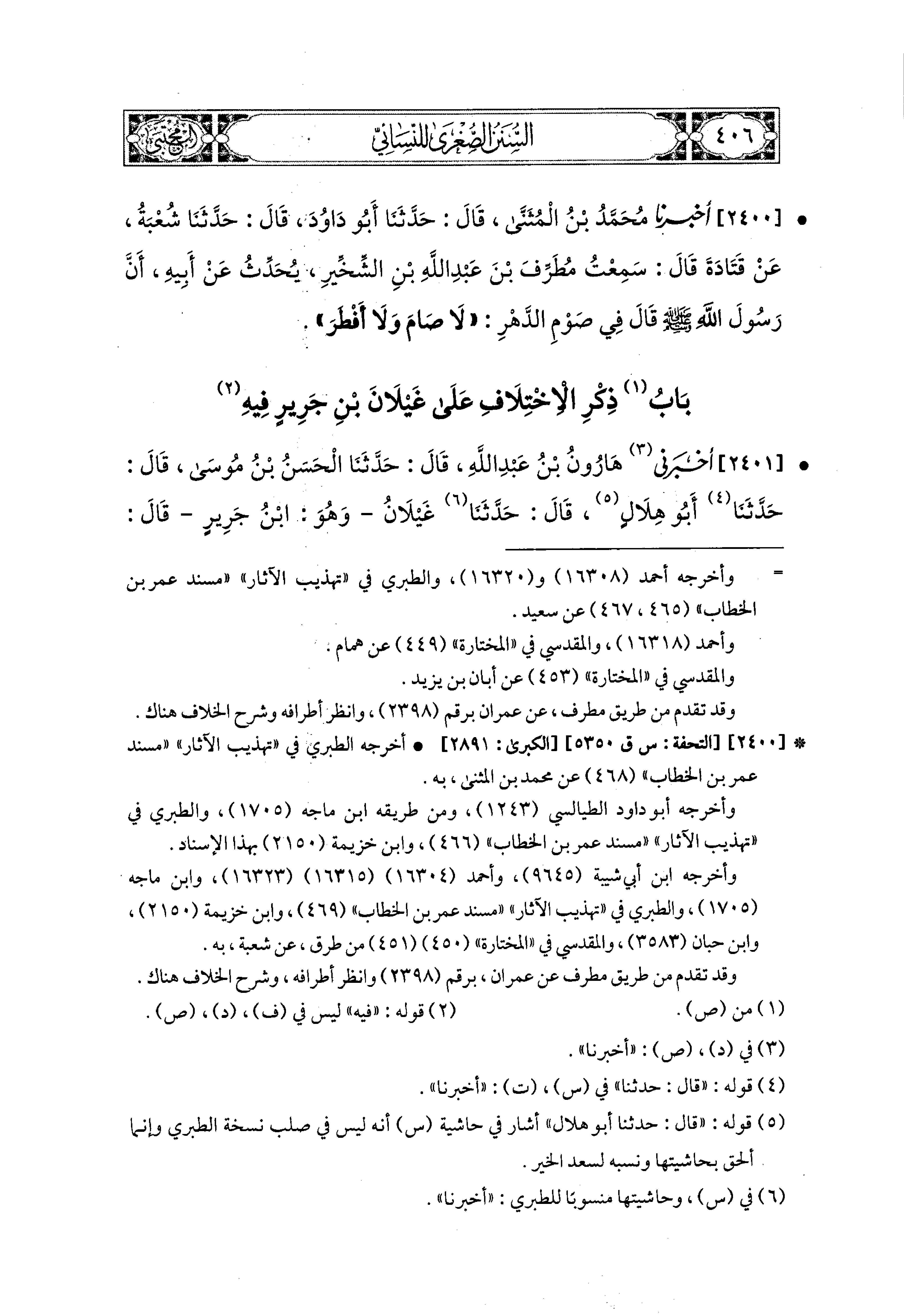 2400- أَخبَرَنا مُحَمد بْنُ المُثَنَّى، قال: حَدثنا أَبو دَاوُدَ، قال: حَدثنا شُعبَةُ، عَن قَتَادَةَ، قَالَ: سَمِعْتُ مُطَرِّفَ بْنَ عَبدِ اللهِ بْنِ الشِّخِّيرِ، يُحَدِّثُ عَن أَبيهِ، أَنَّ رَسُولَ اللهِ صَلى الله عَليه وسَلم قَالَ فِي صَوْمِ الدَّهْرِ: لاَ صَامَ وَلاَ أَفْطَرَ.