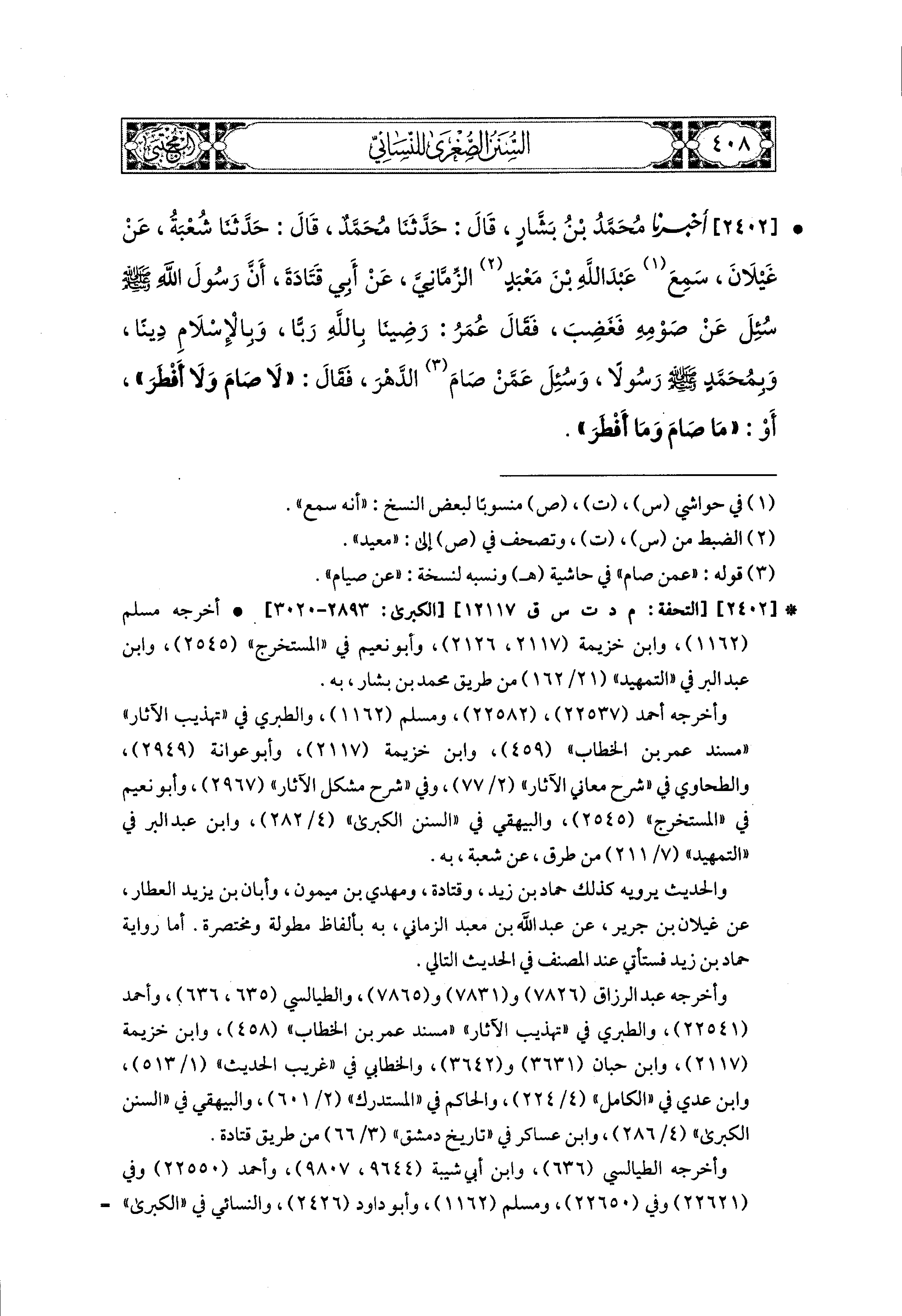 2402- أَخبَرَنا مُحَمد بْنُ بَشَّارٍ، قال: حَدثنا مُحَمدٌ، قال: حَدثنا شُعبَةُ، عَن غَيْلاَنَ، سَمِعَ عَبدَ اللهِ بْنَ مَعْبَدٍ الزِّمَّانيَّ، عَن أَبي قَتَادَةَ، أَنَّ رَسُولَ اللهِ صَلى الله عَليه وسَلم سُئِلَ عَن صَوْمِهِ فَغَضِبَ، فَقَالَ عُمَرُ: رَضِينَا بِالله رَبًّا، وَبِالإِسْلاَمِ دِينًا، وَبِمُحَمدٍ صَلى الله عَليه وسَلم رَسُولاً، وَسُئِلَ عَمَّنْ صَامَ الدَّهْرَ، فَقَالَ: لاَ صَامَ وَلاَ أَفْطَرَ، أَوْ مَا صَامَ وَمَا أَفْطَرَ.