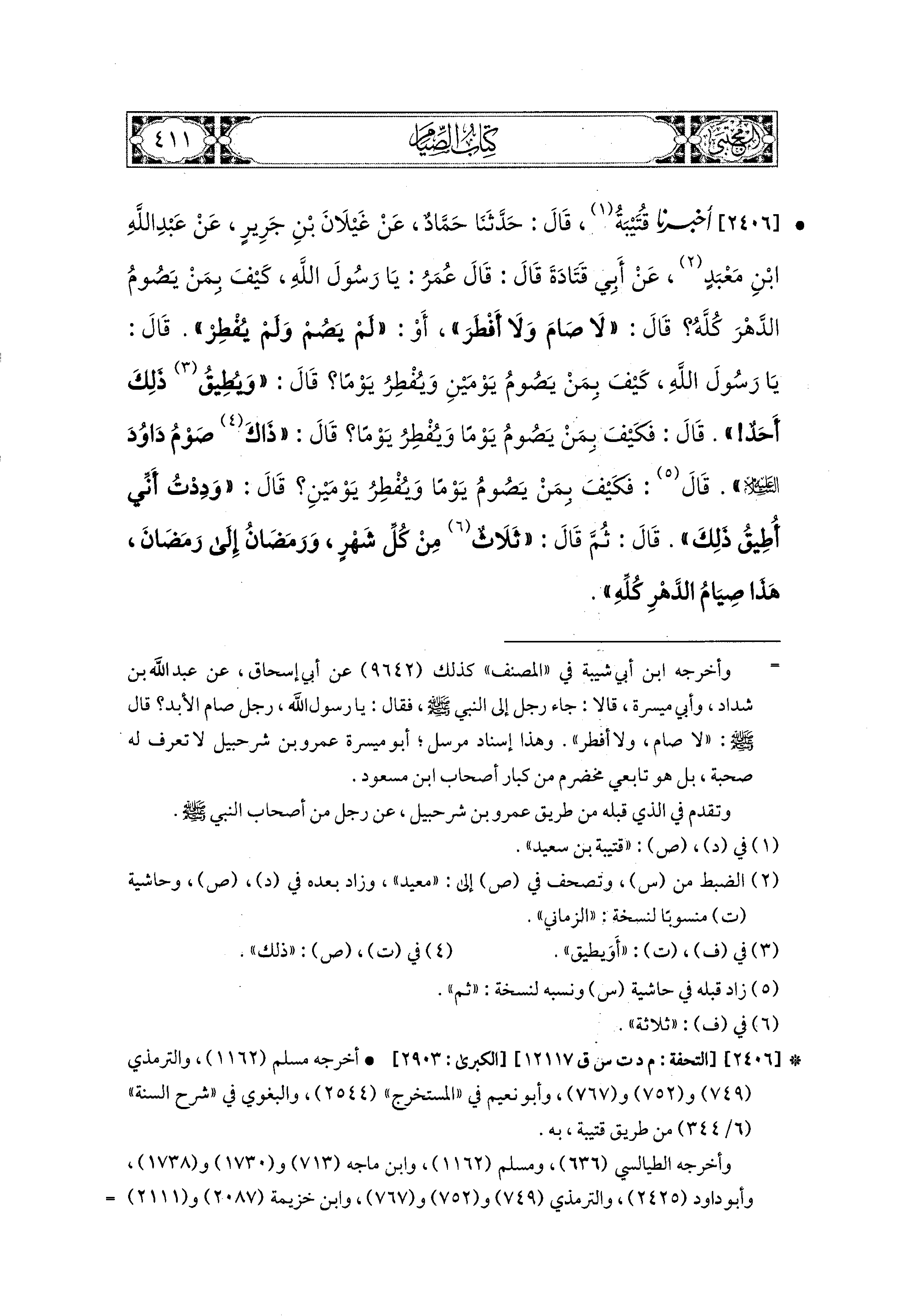 2406- أَخبَرَنا قُتَيبَةُ، قال: حَدثنا حَمَّادٌ، عَن غَيْلاَنَ بْنِ جَرِيرٍ، عَن عَبد اللهِ بن مَعْبَدٍ، عَن أَبي قَتَادَةَ، قَالَ قَالَ عُمَرُ: يَا رَسُولَ اللهِ، كَيْفَ بِمَنْ يَصُومُ الدَّهْرَ كُلَّهُ، قَالَ: لاَ صَامَ وَلاَ أَفْطَرَ، أَوْ لَمْ يَصُمْ وَلَمْ يُفْطِرْ، قَالَ: يَا رَسُولَ اللهِ، كَيْفَ بِمَنْ يَصُومُ يَوْمَيْنِ وَيُفْطِرُ يَوْمًا؟ قَالَ: ويُطِيقُ ذَلِكَ أَحَدٌ؟ قَالَ: فَكَيْفَ بِمَنْ يَصُومُ يَوْمًا وَيُفْطِرُ يَوْمًا؟ قَالَ: ذَاكَ صَوْمُ دَاوُدَ عَلَيهِ السَّلاَمُ، قَالَ: فَكَيْفَ بِمَنْ يَصُومُ يَوْمًا وَيُفْطِرُ يَوْمَيْنِ؟ قَالَ: وَدِدْتُ أَنِّي أُطِيقُ ذَلِكَ، قَالَ: ثُمَّ قَالَ: ثَلاَثٌ مِنْ كُلِّ شَهْرٍ، وَرَمَضَانُ إِلَى رَمَضَانَ، هَذَا صِيَامُ الدَّهْرِ كُلِّهِ.