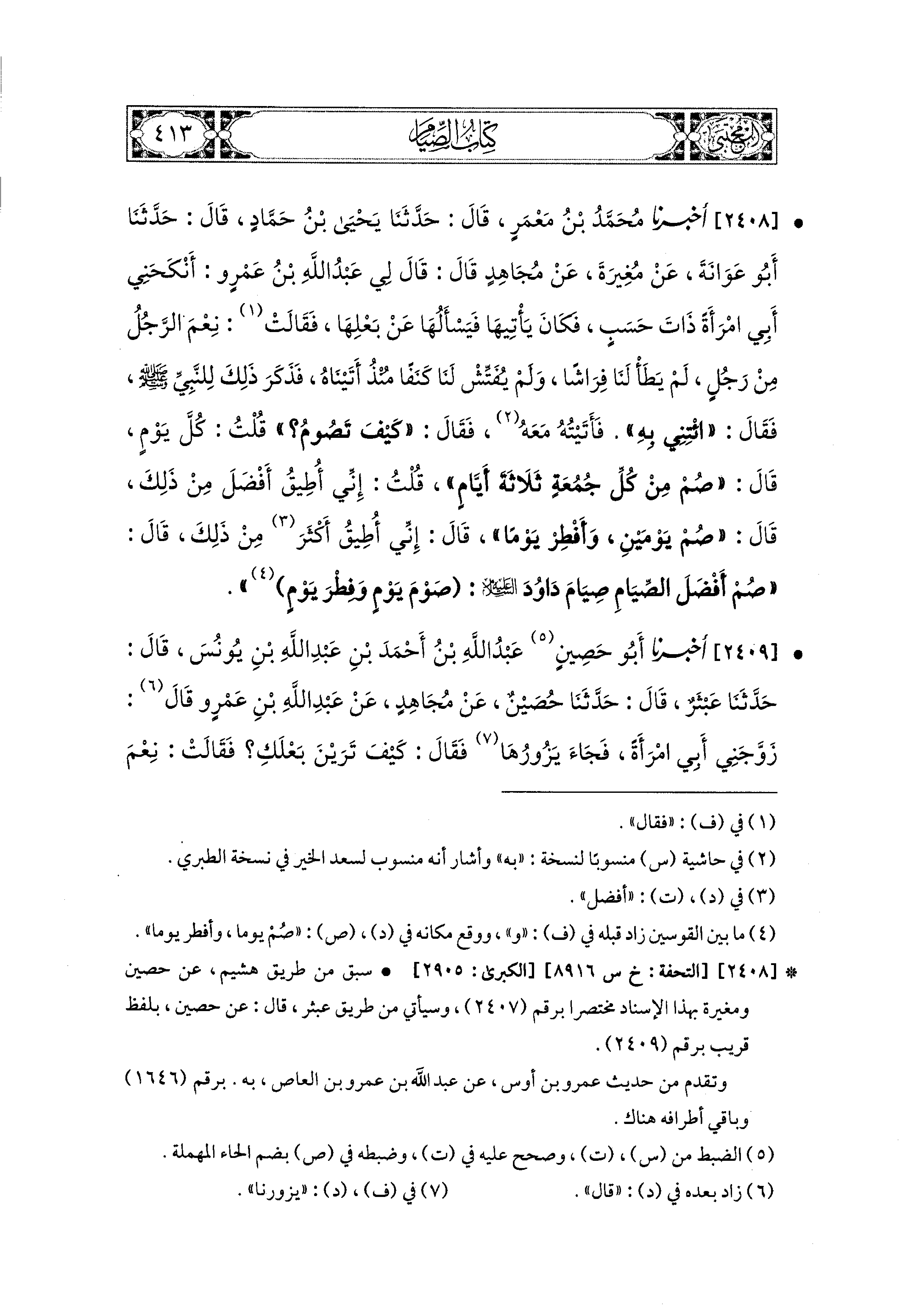 2408- أَخبَرَنا مُحَمد بْنُ مَعْمَرٍ، قال: حَدثنا يَحيَى بْنُ حَمَّادٍ، قال: حَدثنا أَبو عَوَانَةَ، عَن مُغِيرَةَ، عَن مُجَاهِدٍ، قَالَ: قَالَ لِي عَبدُ اللهِ بْنُ عَمْرٍو: أَنْكَحَني أَبي امْرَأَةً ذَاتَ حَسَبٍ، فَكَانَ يَأْتِيهَا فَيَسْأَلُهَا عَن بَعْلِهَا، فَقَالَتْ: نِعْمَ الرَّجُلُ مِنْ رَجُلٍ لَمْ يَطَأْ لَنَا فِرَاشًا، وَلَمْ يُفَتِّشْ لَنَا كَنَفًا مُنْذُ أَتَيْنَاهُ، فَذَكَرَ ذَلِكَ لِلنَّبِيِّ صَلى الله عَليه وسَلم، فَقَالَ: ائْتِني بِهِ، فَأَتَيْتُهُ مَعَهُ، فَقَالَ: كَيْفَ تَصُومُ؟ قُلْتُ: كُلَّ يَوْمٍ، قَالَ: صُمْ مِنْ كُلِّ جُمُعَةٍ ثَلاَثَةَ أَيَّامٍ، قُلْتُ: إِنِّي أُطِيقُ أَفْضَلَ مِنْ ذَلِكَ، قَالَ: صُمْ يَوْمَيْنِ وَأَفْطِرْ يَوْمًا، قَالَ: إِنِّي أُطِيقُ أَكثر مِنْ ذَلِكَ، قَالَ: صُمْ أَفْضَلَ الصِّيَامِ، صِيَامَ دَاوُدَ عَلَيهِ السَّلاَمُ، صَوْمُ يَوْمٍ وَفِطْرُ يَوْمٍ.