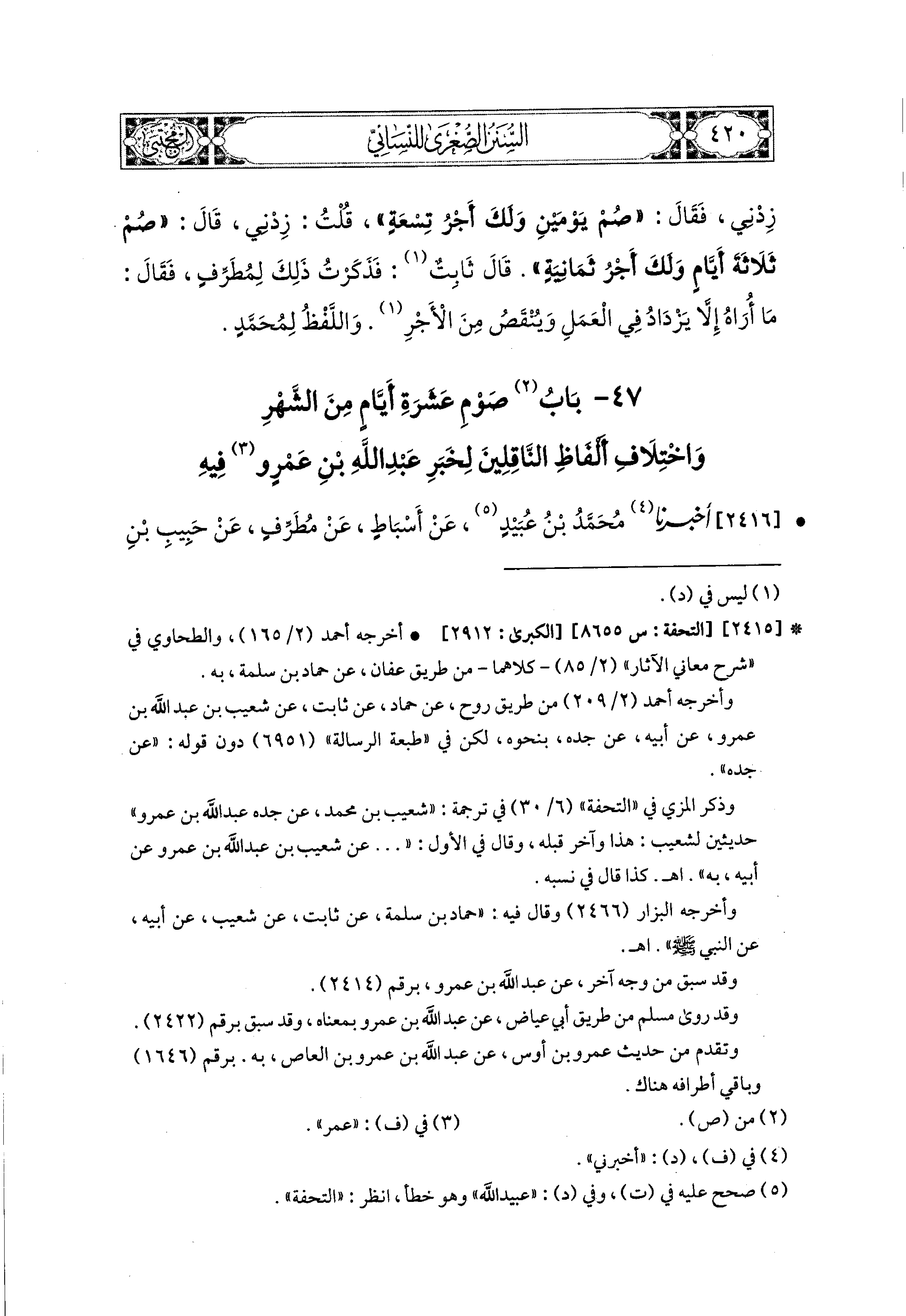 2416- أَخبَرَنا مُحَمد بْنُ عُبَيدٍ، عَن أَسْبَاطٍ، عَن مُطَرِّفٍ، عَن حَبِيبِ بْنِ أَبي ثَابِتٍ، عَن أَبي العَبَّاسِ، عَن عَبد اللهِ بن عَمْرٍو، قَالَ: قَالَ رَسُولُ اللهِ صَلى الله عَليه وسَلم: إِنَّهُ بَلَغَني أَنَّكَ تَقُومُ اللَّيلَ وَتَصُومُ النَّهَارَ، قُلْتُ: يَا رَسُولَ اللهِ، مَا أَرَدْتُ بِذَلِكَ إِلاَّ الخَيْرَ، قَالَ: لاَ صَامَ مَنْ صَامَ الأَبَدَ، وَلَكِنْ أَدُلُّكَ عَلَى صَوْمِ الدَّهْرِ، ثَلاَثَةُ أَيَّامٍ مِنَ الشَّهْرِ، قُلْتُ: يَا رَسُولَ اللهِ، إِنِّي أُطِيقُ أَكْثَرَ مِنْ ذَلِكَ، قَالَ: صُمْ خَمْسَةَ أَيَّامٍ، قُلْتُ: إِنِّي أُطِيقُ أَكْثَرَ مِنْ ذَلِكَ، قَالَ: فَصُمْ عَشْرًا، قُلْتُ: إِنِّي أُطِيقُ أَكْثَرَ مِنْ ذَلِكَ، قَالَ: صُمْ صَوْمَ دَاوُدَ عَلَيهِ السَّلاَمُ، كَانَ يَصُومُ يَوْمًا وَيُفْطِرُ يَوْمًا.