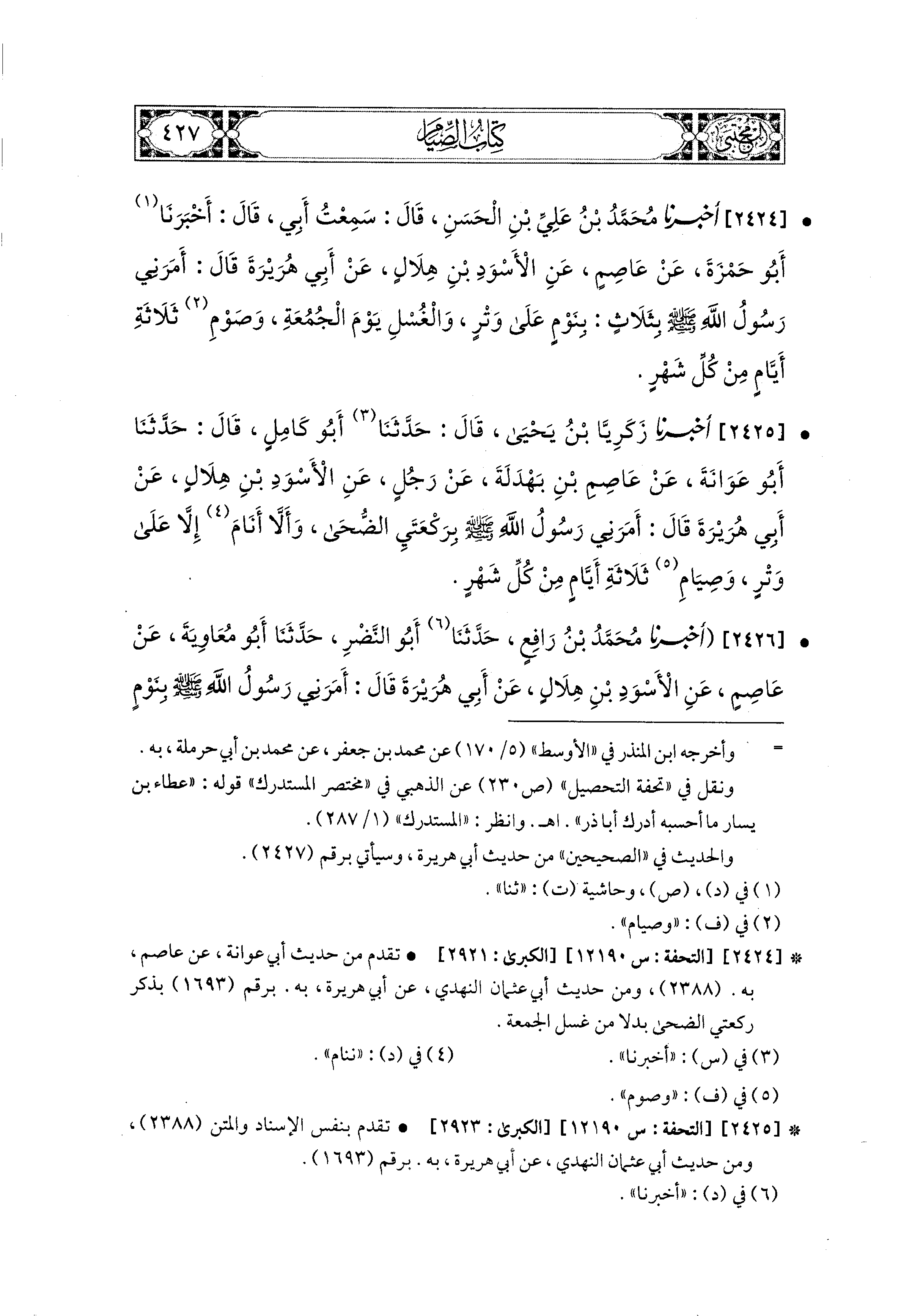 2425- أَخبَرَنا زَكَرِيَّا بْنُ يَحيَى، قال: حَدثنا أَبو كَامِلٍ، قال: حَدثنا أَبو عَوَانَةَ، عَن عَاصِمِ بْنِ بَهْدَلَةَ، عَن رَجُلٍ، عَنِ الأَسْوَدِ بْنِ هِلاَلٍ، عَن أَبي هُرَيرَةَ، قَالَ: أَمَرَني رَسُولُ اللهِ صَلى الله عَليه وسَلم بِرَكْعَتَيِ الضُّحَى، وَأَلاَ أَنَامَ إِلاَّ عَلَى وِتْرٍ، وَصِيَامِ ثَلاَثَةِ أَيَّامٍ مِنْ كُلِّ شَهْرٍ.