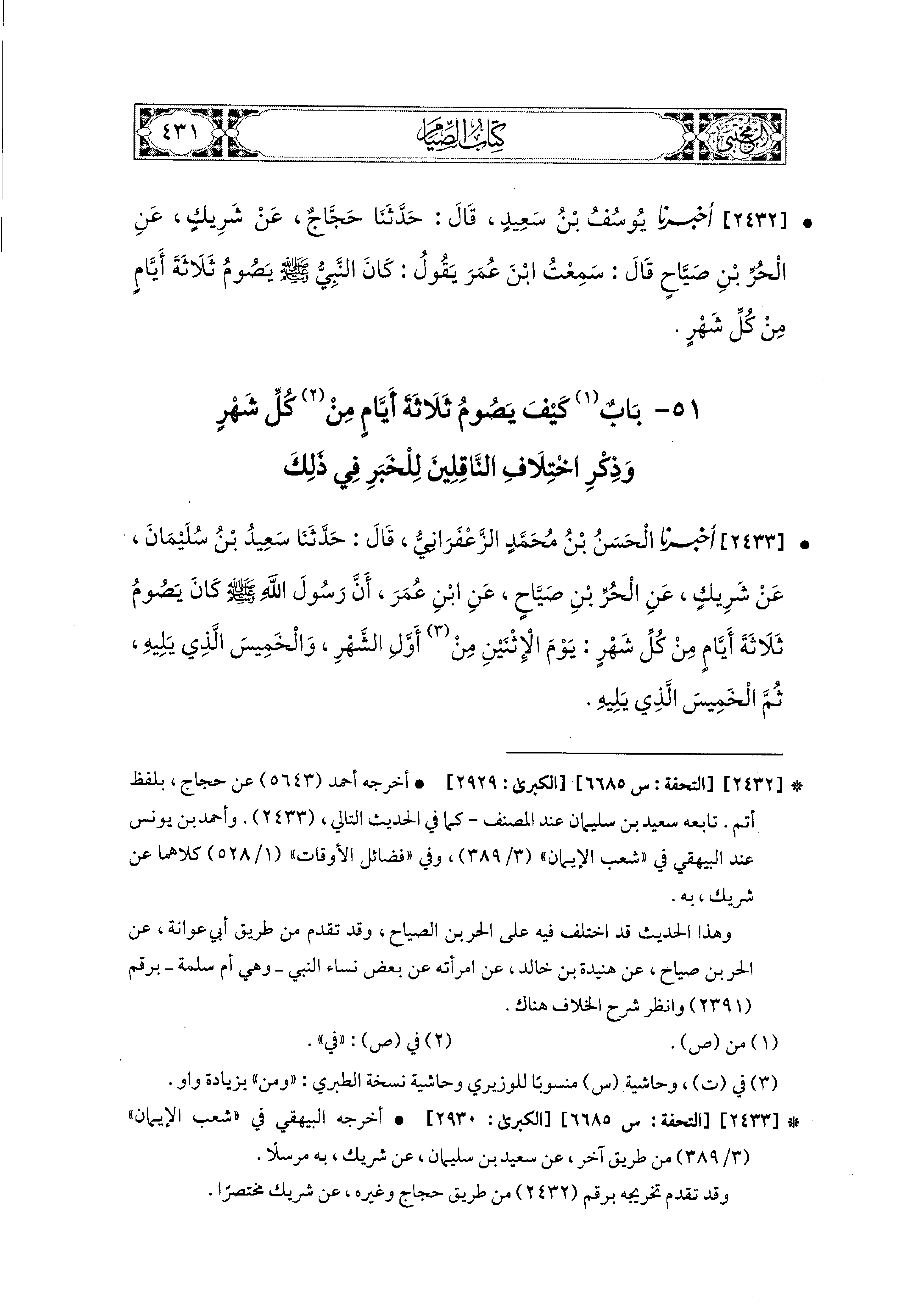2432- أَخبَرَنا يُوسُفُ بْنُ سَعيدٍ، قال: حَدثنا حَجَّاجٌ، عَن شَرِيكٍ، عَنِ الحُرِّ بْنِ صَيَّاحٍ، قَالَ: سَمِعْتُ ابنَ عُمَرَ، يَقُولُ: كَانَ النَّبيُّ صَلى الله عَليه وسَلم يَصُومُ ثَلاَثَةَ أَيَّامٍ مِنْ كُلِّ شَهْرٍ.