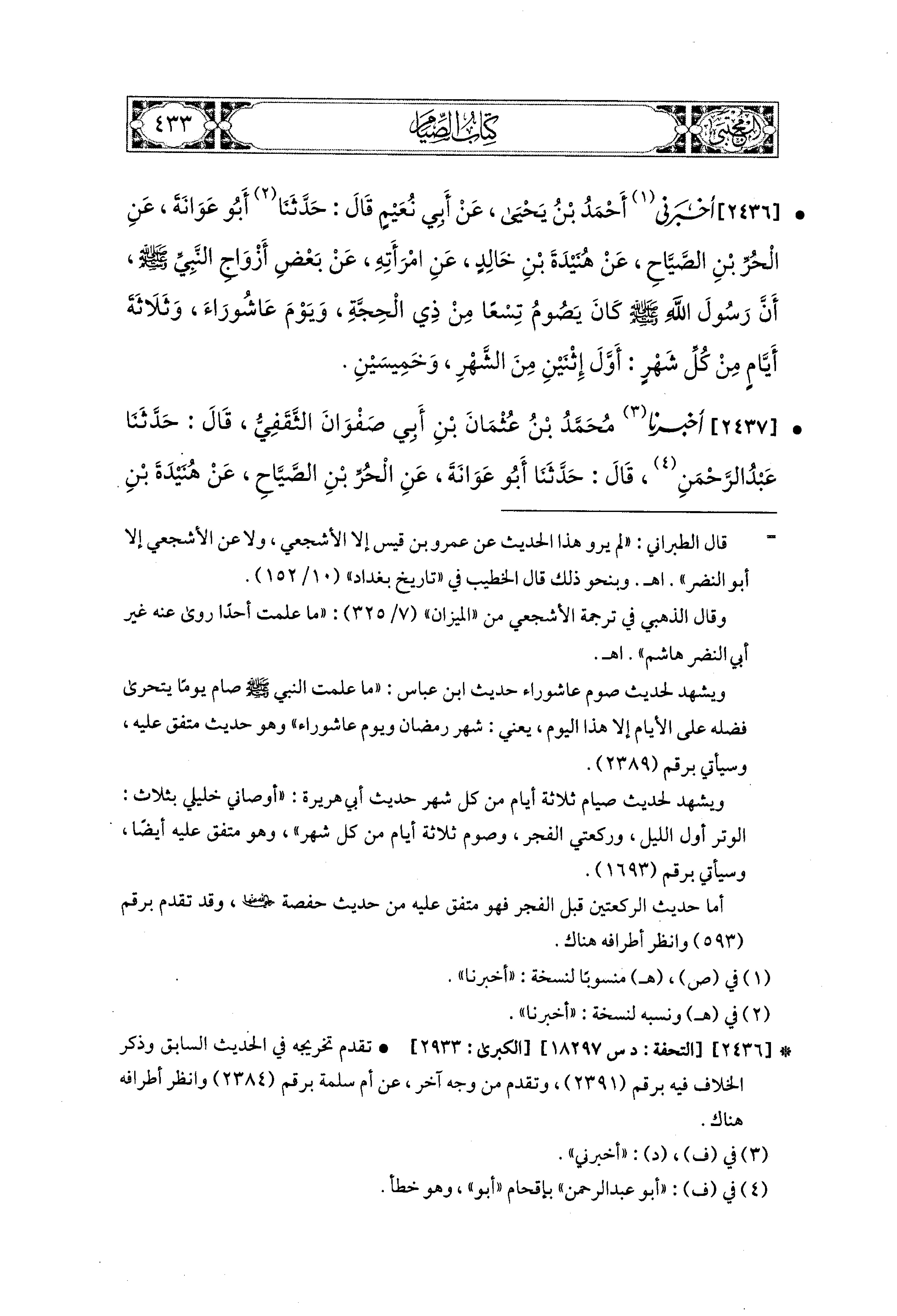 2436- أَخبَرني أَحْمَدُ بْنُ يَحيَى، عَن أَبي نُعَيْمٍ، قال: حَدثنا أَبو عَوَانَةَ، عَنِ الحُرِّ بْنِ الصَّيَّاحِ، عَن هُنَيْدَةَ بْنِ خَالِدٍ، عَنِ امْرَأَتِهِ، عَن بَعْضِ أَزْوَاجِ النَّبيِّ، صَلى الله عَليه وسَلم، أَنَّ رَسُولَ اللهِ صَلى الله عَليه وسَلم كَانَ يَصُومُ تِسْعًا مِنْ ذِي الحِجَّةِ، وَيَوْمَ عَاشُورَاءَ، وَثَلاَثَةَ أَيَّامٍ مِنْ كُلِّ شَهْرٍ، أَوَّلَ اثْنَيْنِ مِنَ الشَّهْرِ وَخَميسَيْنِ.