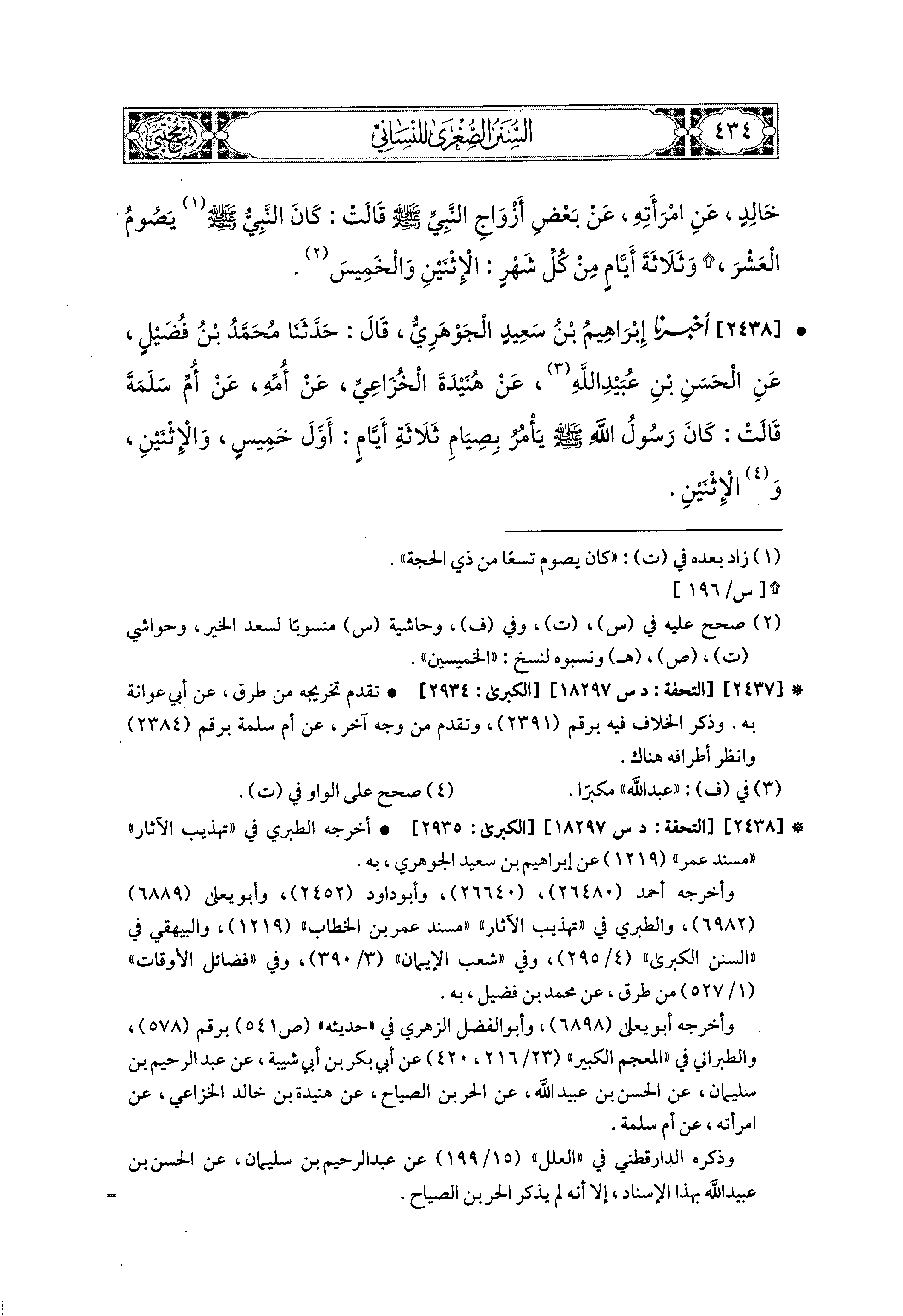 2438- أَخبَرَنا إِبراهِيمُ بْنُ سَعيدٍ الجَوْهَرِيُّ، قال: حَدثنا مُحَمدُ بْنُ فُضَيْلٍ، عَنِ الحَسَنِ بْنِ عُبَيدِ اللهِ، عَن هُنَيْدَةَ الخُزَاعِيِّ، عَن أُمِّهِ، عَن أُمِّ سَلَمَةَ، قَالَتْ: كَانَ رَسُولُ اللهِ صَلى الله عَليه وسَلم يَأْمُرُ بِصِيَامِ ثَلاَثَةِ أَيَّامٍ: أَوَّلِ خَميسٍ، وَالإثْنَيْنِ وَالإِثْنَيْنِ.