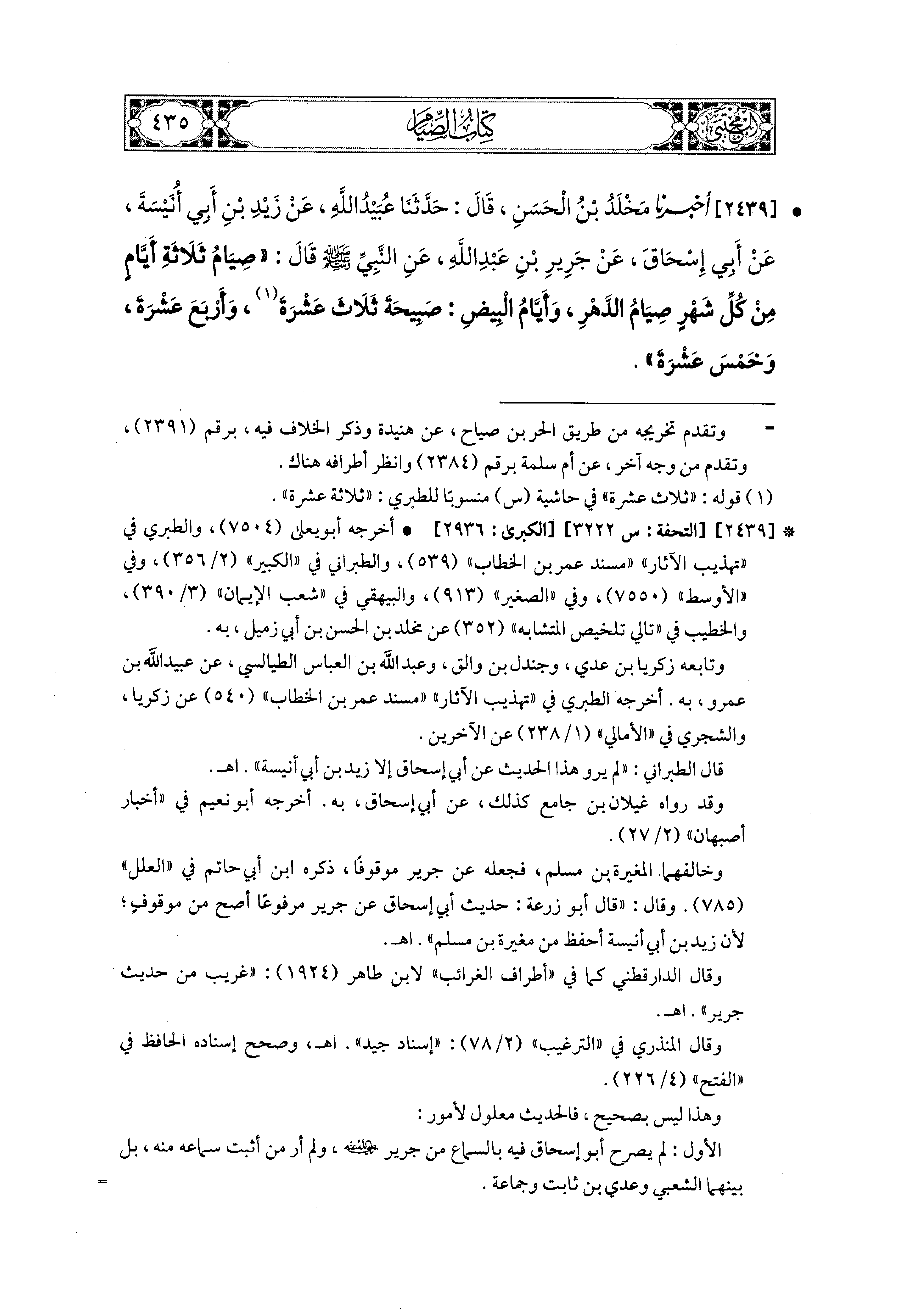2439- أَخبَرَنا مَخْلَدُ بْنُ الحَسَنِ، قال: حَدثنا عُبَيدُ اللهِ، عَن زَيْدِ بْنِ أَبي أُنَيْسَةَ، عَن أَبي إِسحَاقَ، عَن جَرِيرِ بْنِ عَبدِ اللهِ، عَنِ النَّبيِّ صَلى الله عَليه وسَلم قَالَ: صِيَامُ ثَلاَثَةِ أَيَّامٍ مِنْ كُلِّ شَهْرٍ صِيَامُ الدَّهْرِ، وَأَيَّامُ البِيضِ صَبِيحَةَ ثَلاَثَ عَشْرَةَ، وَأَرْبَعَ عَشْرَةَ، وَخَمْسَ عَشْرَةَ.