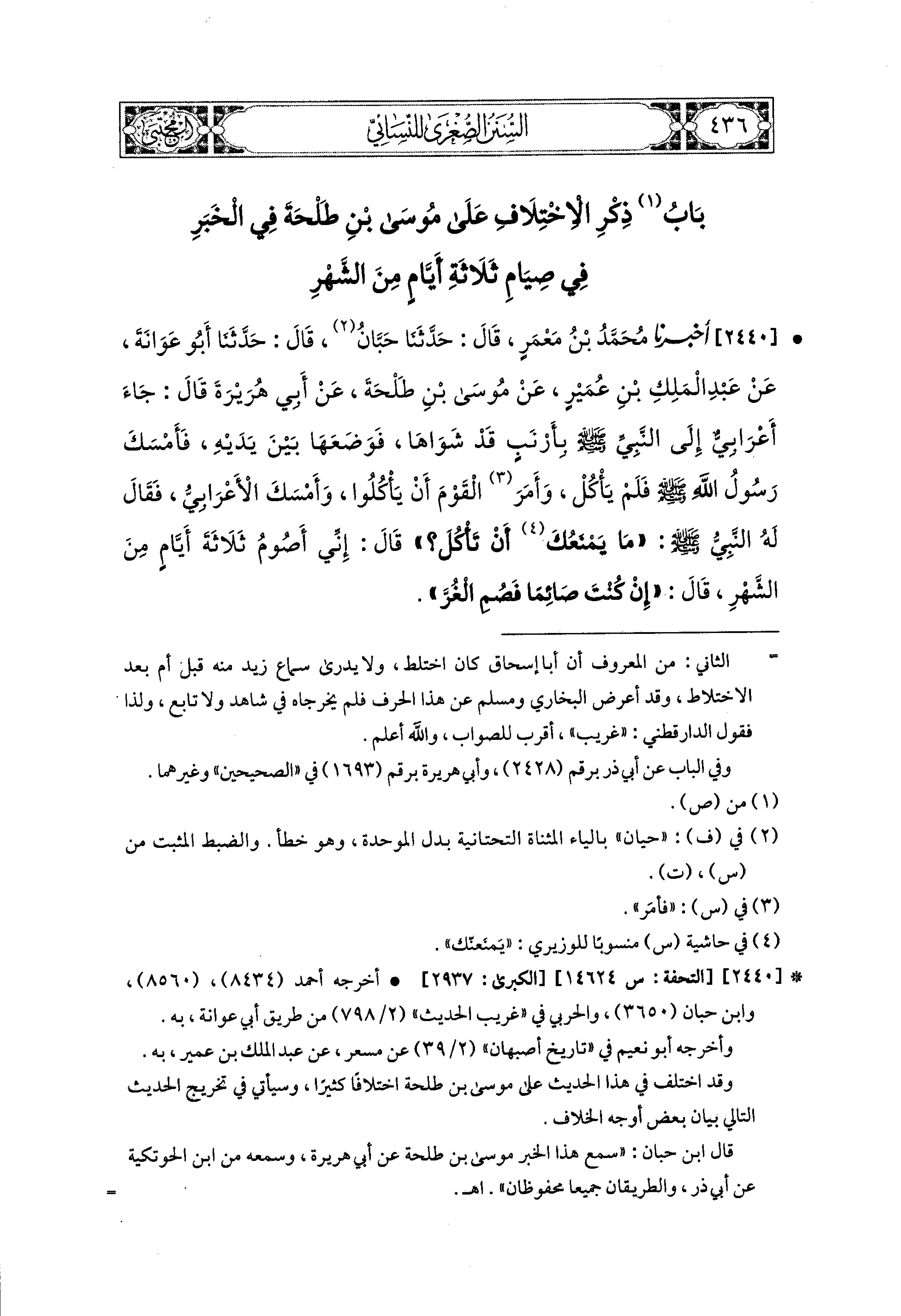 2440- أَخبَرَنا مُحَمد بْنُ مَعْمَرٍ، قال: حَدثنا حِبَّانُ، قال: حَدثنا أَبو عَوَانَةَ، عَن عَبدِ المَلِكِ بْنِ عُمَيْرٍ، عَن مُوسَى بْنِ طَلْحَةَ، عَن أَبي هُرَيرَةَ، قَالَ: جَاءَ أَعْرَابيٌّ إِلَى النَّبيِّ صَلى الله عَليه وسَلم بِأَرْنَبٍ قَدْ شَوَاهَا فَوَضَعَهَا بَيْنَ يَدَيْهِ، فَأَمْسَكَ رَسُولُ اللهِ صَلى الله عَليه وسَلم، فَلَمْ يَأْكُلْ، وَأَمَرَ القَوْمَ أَنْ يَأْكُلُوا، وَأَمْسَكَ الأَعْرَابيُّ، فَقَالَ لَهُ النَّبيُّ صَلى الله عَليه وسَلم: مَا يَمْنَعُكَ أَنْ تَأْكُلَ؟ قَالَ: إِنِّي أصوم ثَلاَثَةَ أَيَّامٍ مِنَ الشَّهْرِ، قَالَ: إِنْ كُنْتَ صَائِمًا فَصُمِ الغُرَّ.