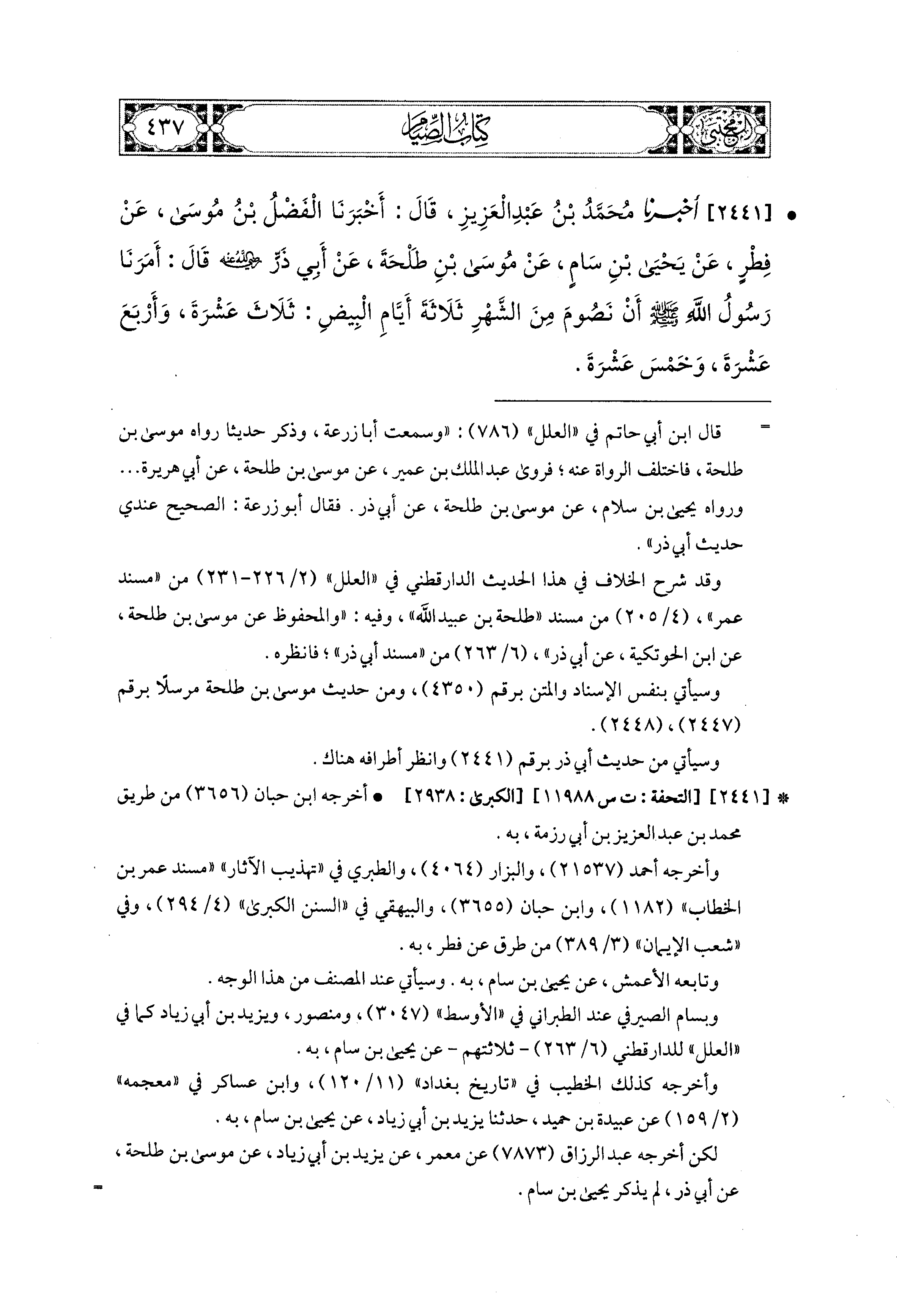 2441- أَخبَرَنا مُحَمد بْنُ عَبدِ العَزِيزِ، قَالَ: أَخبَرنا الفَضْلُ بْنُ مُوسَى، عَن فِطْرٍ، عَن يَحيَى بْنِ سَامٍ، عَن مُوسَى بْنِ طَلْحَةَ، عَن أَبي ذَرٍّ رَضِيَ اللهُ عَنْهُ، قَالَ: أَمَرَنَا رَسُولُ اللهِ صَلى الله عَليه وسَلم أَنْ نَصُومَ مِنَ الشَّهْرِ ثَلاَثَةَ أَيَّامِ البِيضِ: ثَلاَثَ عَشْرَةَ، وَأَرْبَعَ عَشْرَةَ، وَخَمْسَ عَشْرَةَ.
