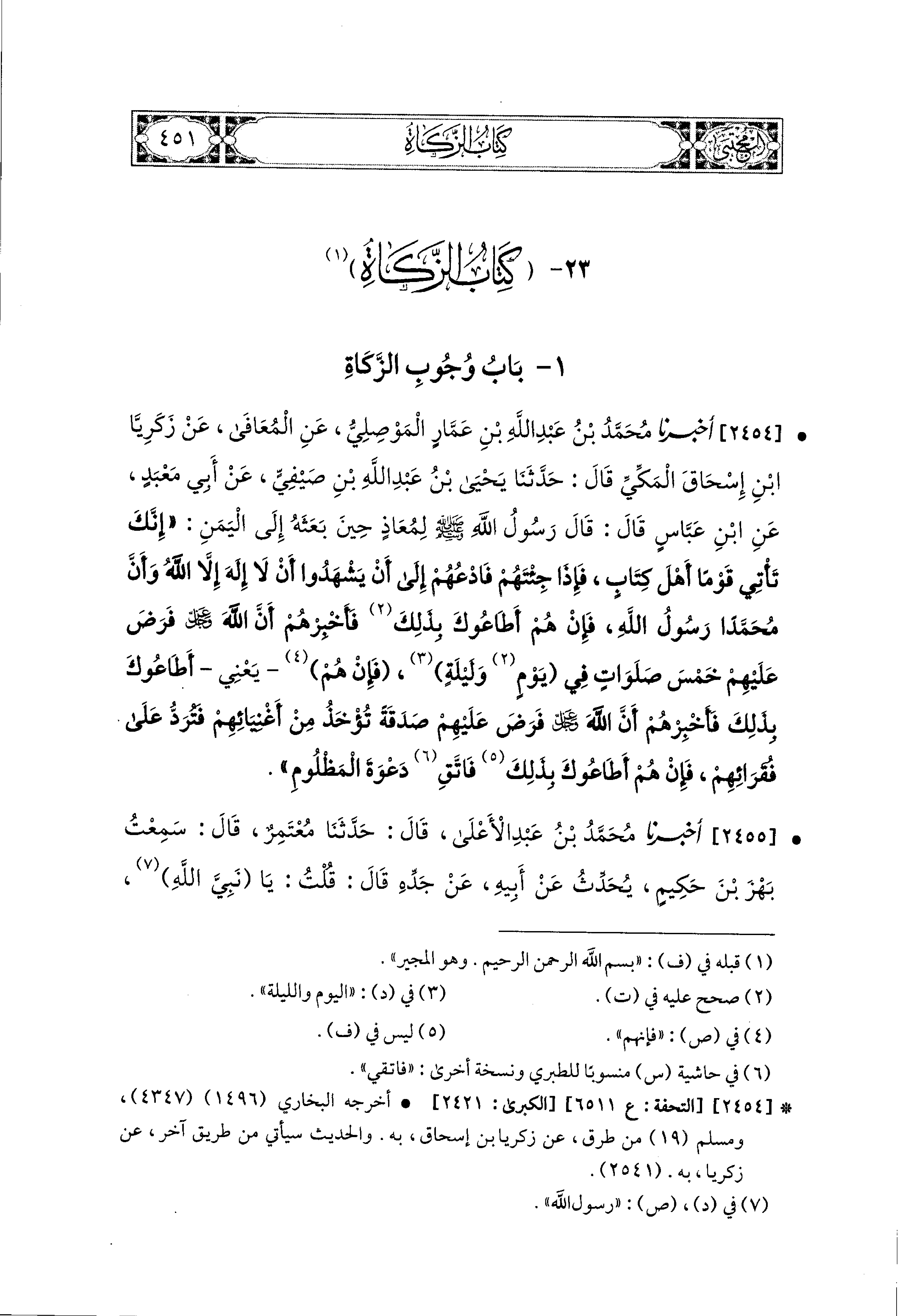 2454 - أَخبَرَنا مُحَمد بْنُ عَبدِ اللهِ بْنِ عَمَّارٍ المَوْصِلِيُّ، عَنِ المُعَافَى، عَن زَكَرِيَّا بْنِ إِسحَاقَ المَكِّيِّ، قال: حَدثنا يَحيَى بْنُ عَبدِ اللهِ بْنِ صَيْفِىٍّ، عَن أَبي مَعْبَدٍ، عَنِ ابنِ عَبَّاسٍ، قَالَ: قَالَ رَسُولُ اللهِ صَلى الله عَليه وسَلم لِمُعَاذٍ حِينَ بَعَثَهُ إِلَى اليَمَنِ: إِنَّكَ تَأْتِي قَوْمًا أَهْلَ كِتَابٍ، فَإِذَا جِئْتَهُمْ فَادْعُهُمْ إِلَى أَنْ يَشْهَدُوا أَنْ لاَ إِلَهَ إِلاَّ اللهُ، وَأَنَّ مُحَمدًا رَسُولُ اللهِ، فَإِنْ هُمْ أَطَاعُوكَ بِذَلِكَ، فَأَخْبِرْهُمْ أَنَّ اللهَ عَزَّ وَجَلَّ فَرَضَ عَلَيهِمْ خَمْسَ صَلَوَاتٍ فِي يَوْمٍ وَلَيْلَةٍ، فَإِنْ هُمْ، يَعْني، أَطَاعُوكَ بِذَلِكَ، فَأَخْبِرْهُمْ أَنَّ اللهَ عَزَّ وَجَلَّ فَرَضَ عَلَيهِمْ صَدَقَةً تُؤْخَذُ مِنْ أَغْنيَائِهِمْ فَتُرَدُّ عَلَى فُقَرَائِهِمْ، فَإِنْ هُمْ أَطَاعُوكَ بِذَلِكَ، فَاتَّقِ دَعْوَةَ المَظْلُومِ.