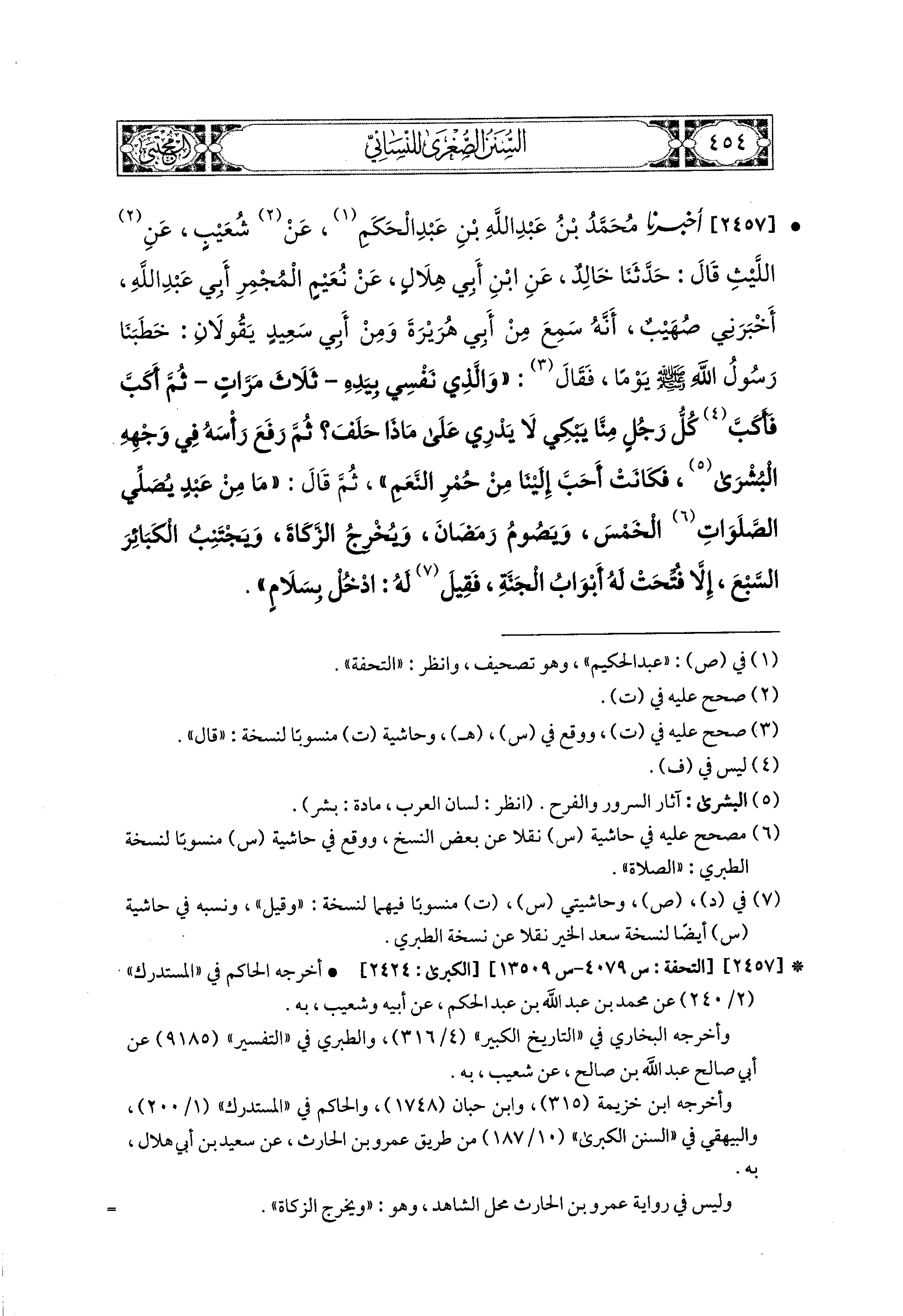 2457- أَخبَرَنا مُحَمد بْنُ عَبدِ اللهِ بْنِ عَبدِ الحَكَمِ، عَن شُعَيبٍ، عَنِ اللَّيْثِ، قَالَ: حَدَّثنا خَالِدٌ، عَنِ ابنِ أَبي هِلاَلٍ، عَن نُعَيْمٍ المُجْمِرِ أَبي عَبدِ اللهِ، أَخبَرني صُهَيْبٌ، أَنَّهُ سَمِعَ مِنْ أَبي هُرَيرَةَ، وَمِنْ أَبي سَعيدٍ، يَقُولاَنِ: خَطَبَنَا رَسُولُ اللهِ صَلى الله عَليه وسَلم يَوْمًا، فَقَالَ: وَالَّذِي نَفْسِي بِيَدِهِ ثَلاَثَ مَرَّاتٍ، ثُمَّ أَكَبَّ، فَأَكَبَّ كُلُّ رَجُلٍ مِنَّا يَبْكِي لاَ يَدْرِي عَلَى مَاذَا حَلَفَ، ثُمَّ رَفَعَ رَأْسَهُ فِي وَجْهِهِ البُشْرَى، فَكَانَتْ أَحَبَّ إِلَيْنَا مِنْ حُمْرِ النَّعَمِ، ثُمَّ قَالَ: مَا مِنْ عَبدٍ يُصَلِّي الصَّلَوَاتِ الخَمْسَ، وَيَصُومُ رَمَضَانَ، وَيُخْرِجُ الزَّكَاةَ، وَيَجْتَنِبُ الكَبَائِرَ السَّبْعَ، إِلاَّ فُتِّحَتْ لَهُ أَبْوَابُ الجَنَّةِ، فَقِيلَ لَهُ: ادْخُلْ بِسَلاَمٍ.
