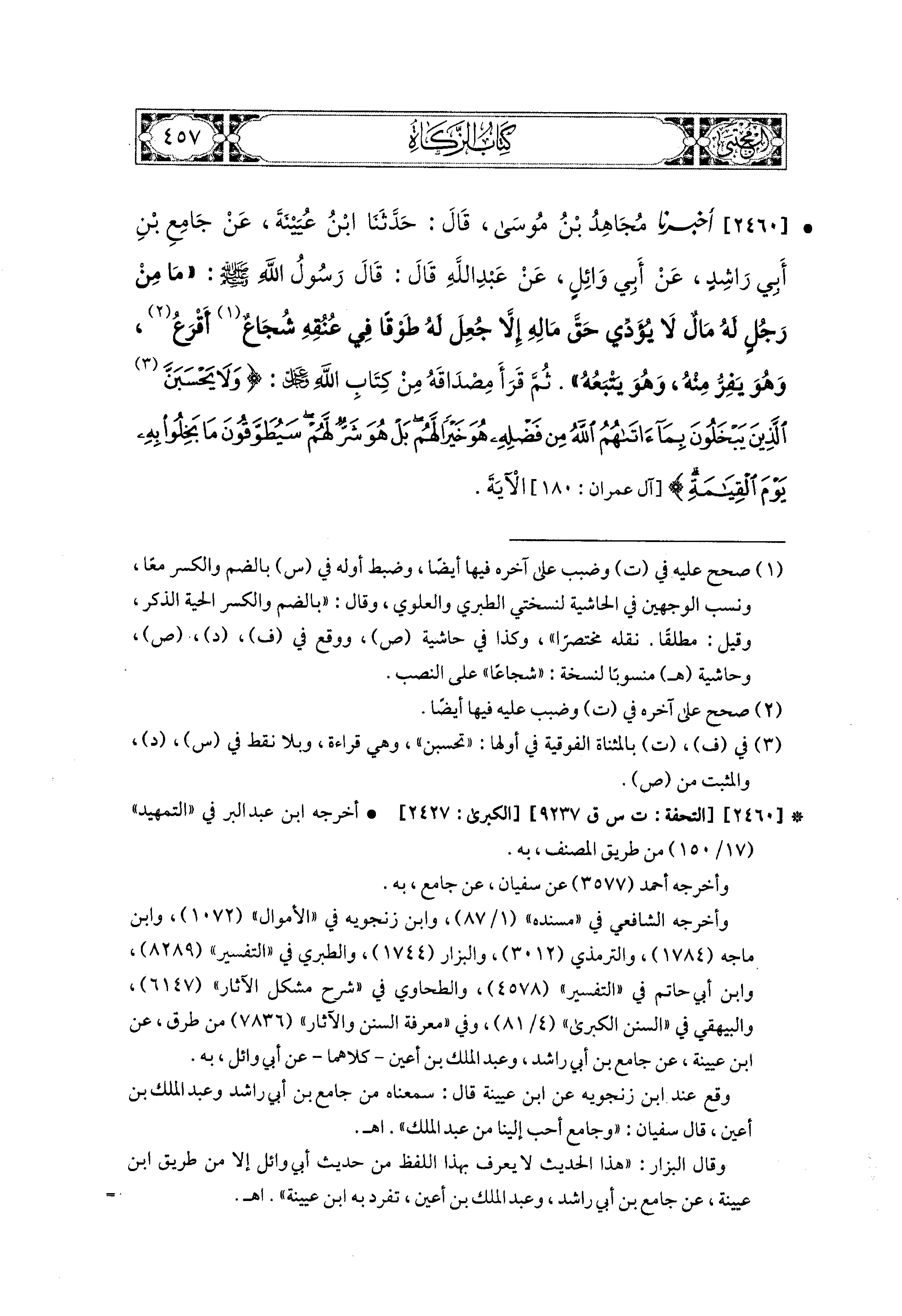2460 - أَخبَرَنا مُجَاهِدُ بْنُ مُوسَى، قال: حَدثنا ابنُ عُيَيْنَةَ، عَن جَامِعِ بْنِ أَبي رَاشِدٍ، عَن أَبي وَائِلٍ، عَن عَبدِ اللهِ، قَالَ: قَالَ رَسُولُ اللهِ صَلى الله عَليه وسَلم: مَا مِنْ رَجُلٍ لَهُ مَالٌ لاَ يُؤَدِّي حَقَّ مَالِهِ إِلاَّ جُعِلَ لَهُ طَوْقًا فِي عُنُقِهِ، شُجَاعٌ أَقْرَعُ وَهُوَ يَفِرُّ مِنْهُ وَهُوَ يَتْبَعُهُ، ثُمَّ قَرَأَ مِصْدَاقَهُ مِنْ كِتَابِ اللهِ عَزَّ وَجَلَّ: {وَلاَ يَحْسَبَنَّ الَّذِينَ يَبْخَلُونَ بِمَا آتَاهُمُ اللهُ مِنْ فَضْلِهِ هُوَ خَيْرًا لَهُمْ بَلْ هُوَ شَرٌّ لَهُمْ سَيُطَوَّقُونَ مَا بَخِلُوا بِهِ يَوْمَ القِيَامَةِ} الآيَةَ.