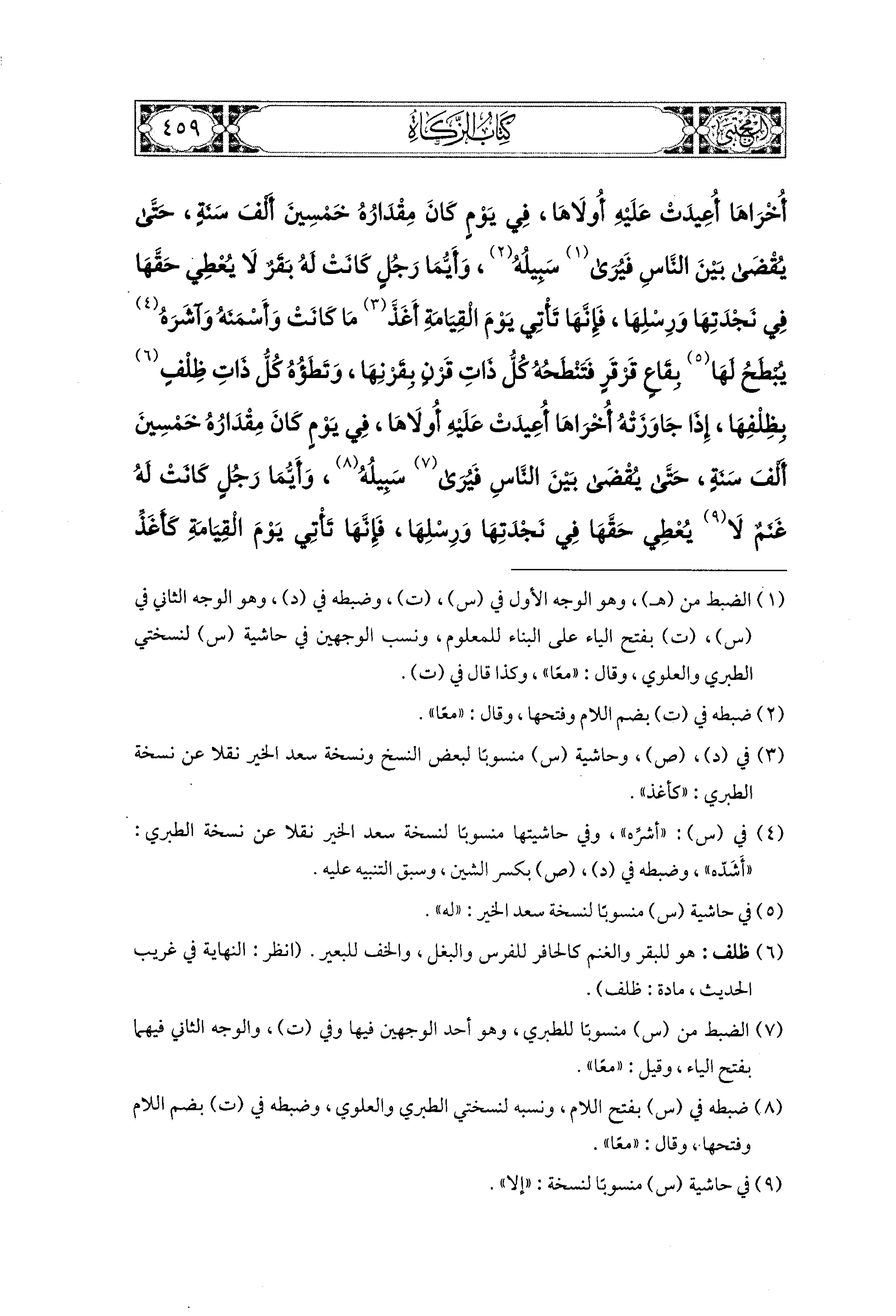 فَإِنَّهَا تَأْتِي يَوْمَ القِيَامَةِ أَغَذَّ مَا كَانَتْ وَأَسْمَنَهُ وَآشَرَهُ، يُبْطَحُ لَهَا بِقَاعٍ قَرْقَرٍ، فَتَنْطَحُهُ كُلُّ ذَاتِ قَرْنٍ بِقَرْنِهَا، وَتَطَؤُهُ كُلُّ ذَاتِ ظِلْفٍ بِظِلْفِهَا، إِذَا جَاوَزَتْهُ أُخْرَاهَا أُعيدَتْ عَلَيهِ أُولاَهَا فِي يَوْمٍ كَانَ مِقْدَارُهُ خَمْسِينَ أَلْفَ سَنَةٍ، حَتَّى يُقْضَى بَيْنَ النَّاسِ فَيَرَى سَبِيلَهُ، وَأَيُّمَا رَجُلٍ كَانَتْ لَهُ غَنَمٌ لاَ يُعْطِي حَقَّهَا فِي نَجْدَتِهَا وَرِسْلِهَا، فَإِنَّهَا تَأْتِي يَوْمَ القِيَامَةِ كَأَغَذِّ مَا كَانَتْ وَأَكْثَرِهِ وَأَسْمَنِهِ وَآشَرِهِ، ثُمَّ يُبْطَحُ لَهَا بِقَاعٍ قَرْقَرٍ فَتَطَؤُهُ كُلُّ ذَاتِ ظِلْفٍ بِظِلْفِهَا، وَتَنْطَحُهُ كُلُّ ذَاتِ قَرْنٍ بِقَرْنِهَا، لَيْسَ فِيهَا عَقْصَاءُ وَلاَ عَضْبَاءُ، إِذَا جَاوَزَتْهُ أُخْرَاهَا أُعيدَتْ عَلَيهِ أُولاَهَا فِي يَوْمٍ كَانَ مِقْدَارُهُ خَمْسِينَ أَلْفَ سَنَةٍ، حَتَّى يُقْضَى بَيْنَ النَّاسِ فَيَرَى سَبِيلَهُ.