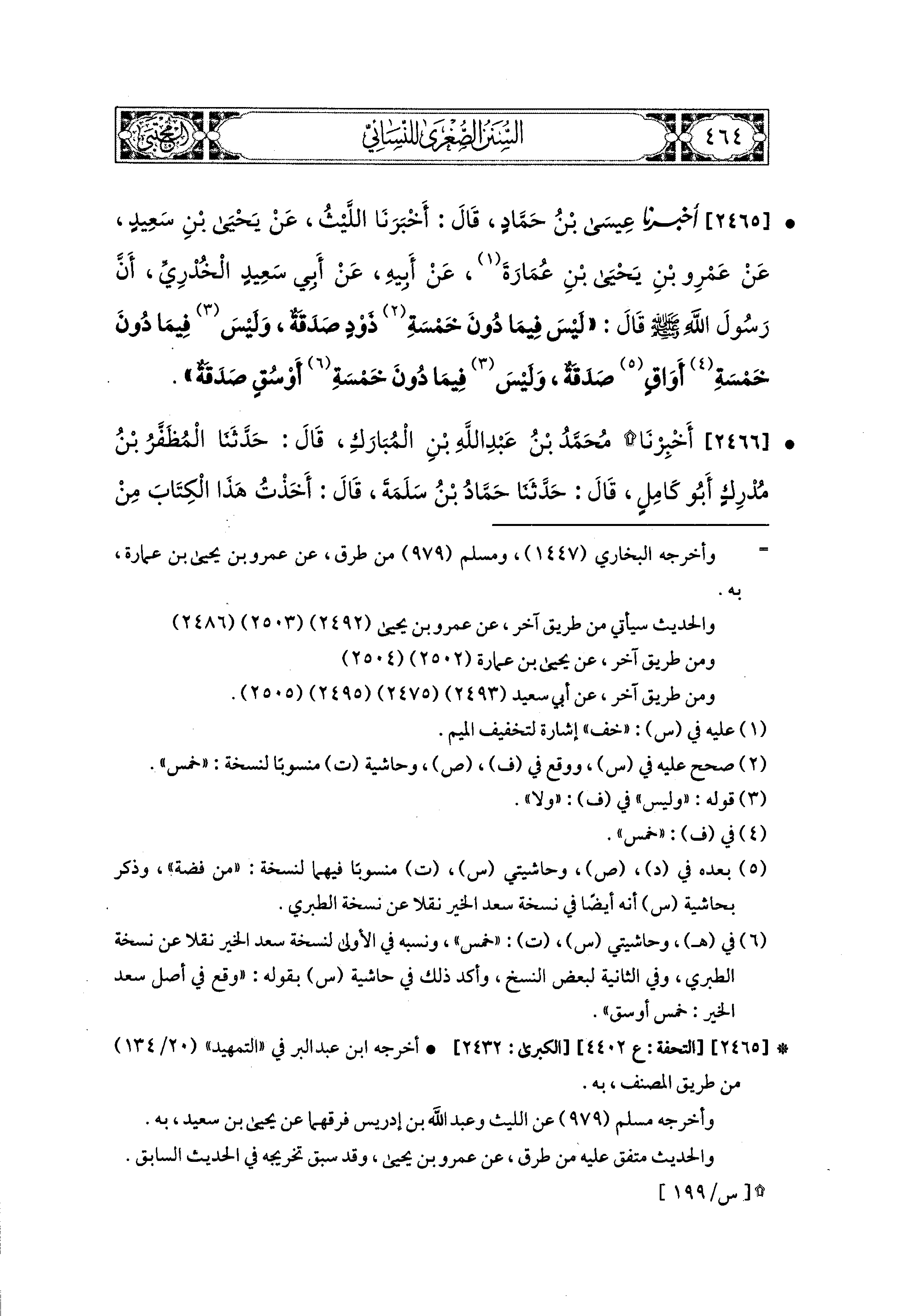2465- أَخبَرَنا عِيسَى بْنُ حَمَّادٍ، قَالَ: أَخبَرنا اللَّيْثُ، عَن يَحيَى بْنِ سَعيدٍ، عَن عَمْرِو بْنِ يَحيَى بْنِ عُمَارَةَ، عَن أَبيهِ، عَن أَبي سَعيدٍ الخُدْرِيِّ، أَنَّ رَسُولَ اللهِ صَلى الله عَليه وسَلم قَالَ: لَيْسَ فِيمَا دُونَ خَمْسَةِ ذَوْدٍ صَدَقَةٌ، وَلَيْسَ فِيمَا دُونَ خَمْسَةِ أَوَاقٍ صَدَقَةٌ، وَلَيْسَ فِيمَا دُونَ خَمْسَةِ أَوْسُقٍ صَدَقَةٌ.