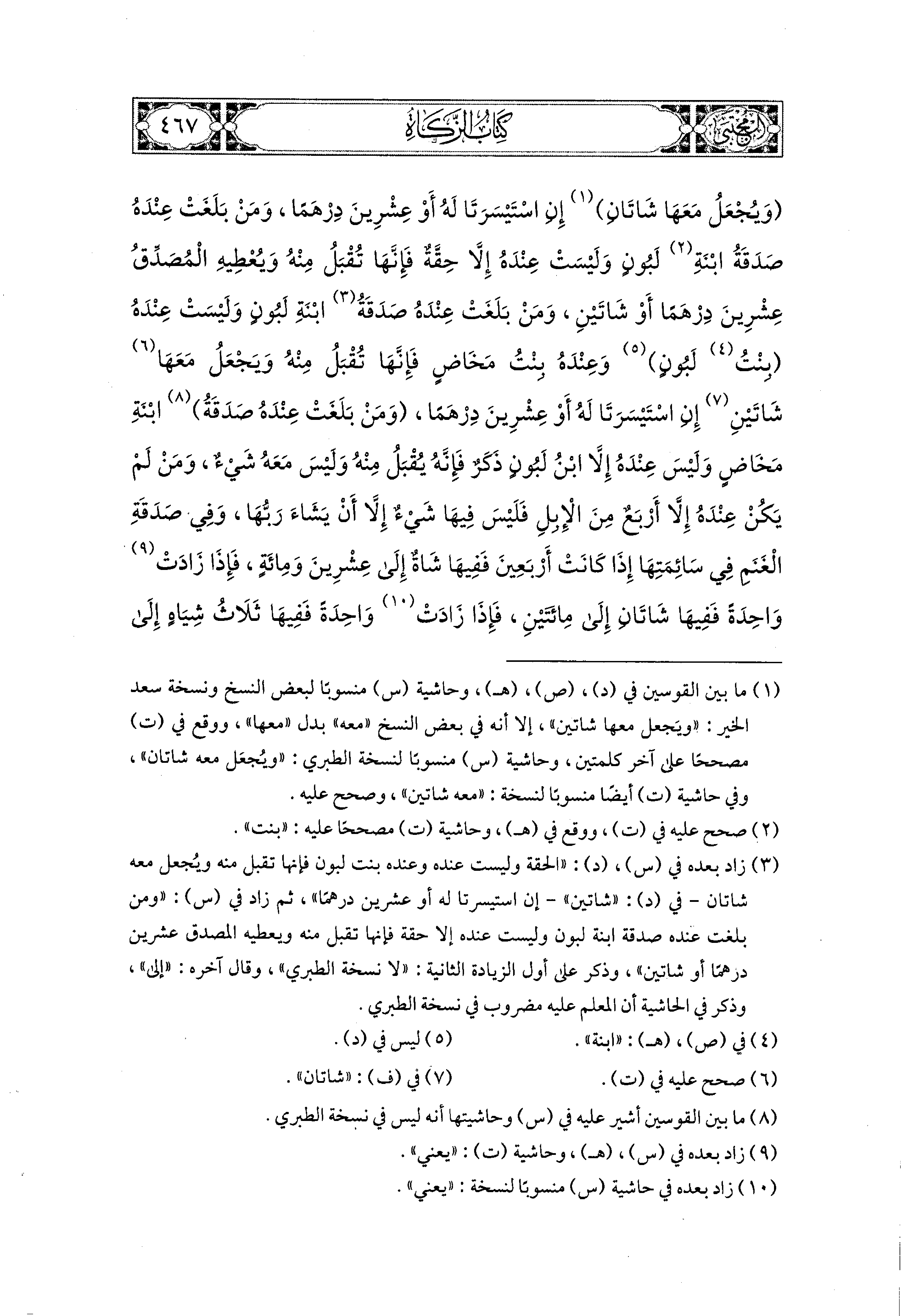 وَمَنْ بَلَغَتْ عِنْدَهُ صَدَقَةُ ابنَةِ لَبُونٍ وَلَيْسَتْ عِنْدَهُ بِنْتُ لَبُونٍ وَعِنْدَهُ بِنْتُ مَخَاضٍ، فَإِنَّهَا تُقْبَلُ مِنْهُ وَيَجْعَلُ مَعَهَا شَاتَيْنِ إِنِ اسْتَيْسَرَتَا لَهُ، أَوْ عِشْرِينَ دِرْهَمَا، وَمَنْ بَلَغَتْ عِنْدَهُ صَدَقَةُ ابنَةِ مَخَاضٍ وَلَيْسَ عِنْدَهُ إِلاَّ ابنُ لَبُونٍ ذَكَرٌ، فَإِنَّهُ يُقْبَلُ مِنْهُ وَلَيْسَ مَعَهُ شَيْءٌ، وَمَنْ لَمْ يَكُنْ عِنْدَهُ إِلاَّ أَرْبَعٌ مِنَ الإِبِلِ فَلَيْسَ فِيهَا شَيْءٌ إِلاَّ أَنْ يَشَاءَ رَبُّهَا، وَفِي صَدَقَةِ الغَنَمِ فِي سَائِمَتِهَا إِذَا كَانَتْ أَرْبَعِينَ فَفِيهَا شَاةٌ إِلَى عِشْرِينَ وَمِئَةٍ، فَإِذَا زَادَتْ وَاحِدَةٌ فَفِيهَا شَاتَانِ إِلَى مِئَتَيْنِ، فَإِذَا زَادَتْ وَاحِدَةٌ فَفِيهَا ثَلاَثُ شِيَاهٍ إِلَى ثَلاَثِمِئَةٍ، فَإِذَا زَادَتْ فَفِي كُلِّ مِئَةٍ شَاةٌ، وَلاَ يُؤْخَذُ فِي الصَّدَقَةِ هَرِمَةٌ وَلاَ ذَاتُ عَوَارٍ وَلاَ تَيْسُ الغَنَمِ إِلاَّ أَنْ يَشَاءَ المُصَّدِّقُ، وَلاَ يُجْمَعُ بَيْنَ مُتَفَرِّقٍ، وَلاَ يُفَرَّقُ بَيْنَ مُجْتَمِعٍ خَشْيَةَ الصَّدَقَةِ، وَمَا كَانَ مِنْ خَلِيطَيْنِ فَإِنَّهُمَا يَتَرَاجَعَانِ بَيْنَهُمَا بِالسَّوِيَّةِ، فَإِذَا كَانَتْ سَائِمَةُ الرَّجُلِ نَاقِصَةً مِنْ أَرْبَعِينَ شَاةٌ وَاحِدَةٌ فَلَيْسَ فِيهَا شَيْءٌ إِلاَّ أَنْ يَشَاءَ رَبُّهَا، وَفِي الرِّقَةِ رُبْعُ العُشْرِ، فَإِنْ لَمْ تَكُنْ إِلاَّ تِسْعِينَ وَمِئَةَ دِرْهَمٍ فَلَيْسَ فِيهَا شَيْءٌ إِلاَّ أَنْ يَشَاءَ رَبُّهَا.
