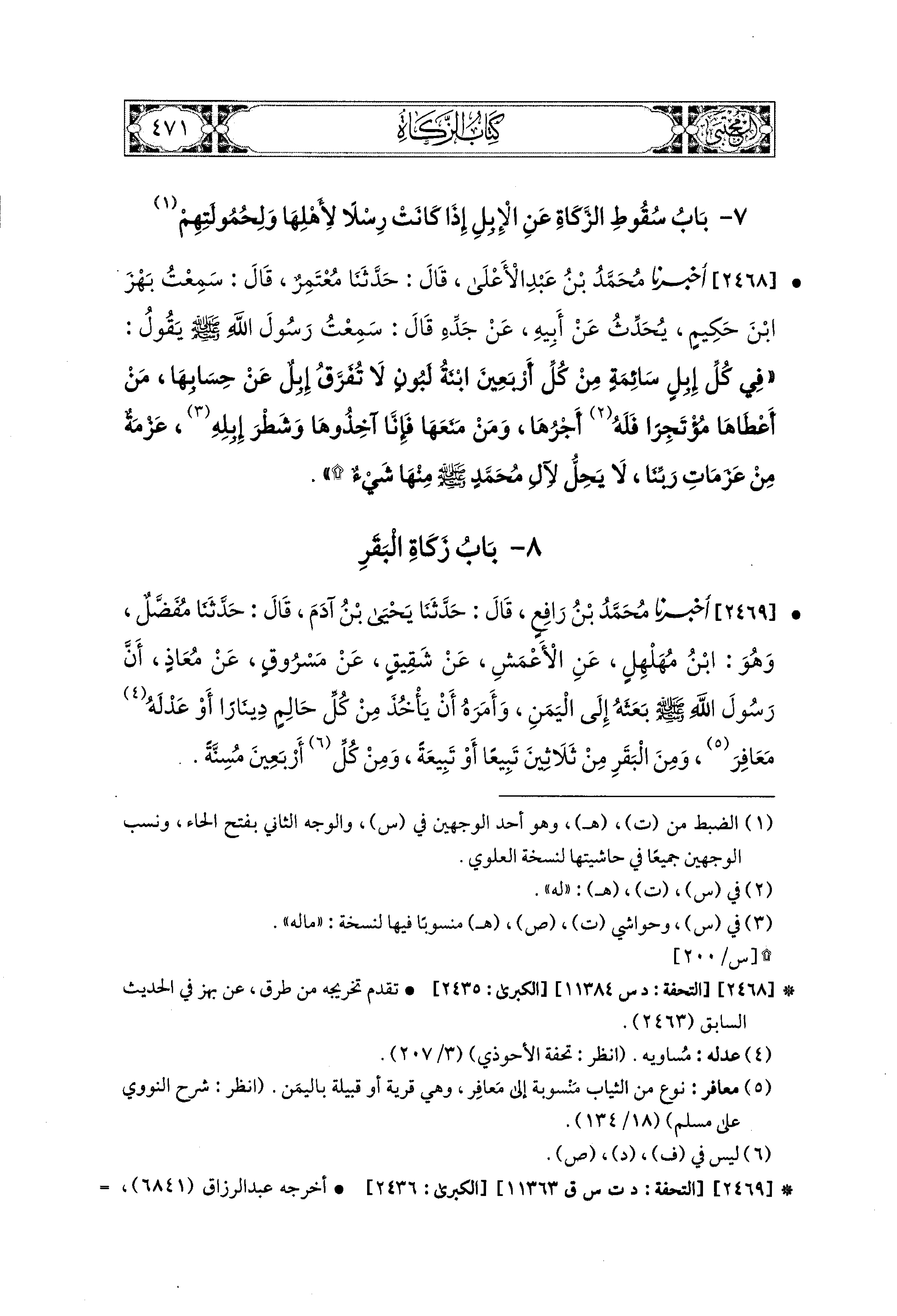 2468- أَخبَرَنا مُحَمد بن عَبدِ الأَعلَى، قال: حَدثنا مُعْتَمِرٌ، قَالَ: سَمِعْتُ بَهْزَ بْنَ حَكِيمٍ، يُحَدِّثُ عَن أَبيهِ، عَن جَدِّهِ، قَالَ: سَمِعْتُ رَسُولَ اللهِ صَلى الله عَليه وسَلم، يَقُولُ: فِي كُلِّ إِبِلٍ سَائِمَةٍ مِنْ كُلِّ أَرْبَعِينَ ابنَةُ لَبُونٍ، لاَ تُفَرَّقُ إِبِلٌ عَن حِسَابِهَا، مَنْ أَعْطَاهَا مُؤْتَجِرًا فلَهُ أَجْرُهَا، وَمَنْ مَنَعَهَا فَإِنَّا آخِذُوهَا، وَشَطْرَ إِبِلِهِ عَزْمَةً مِنْ عَزَمَاتِ رَبِّنَا، لاَ يَحِلُّ لآلِ مُحَمدٍ صَلى الله عَليه وسَلم مِنْهَا شَيْءٌ.