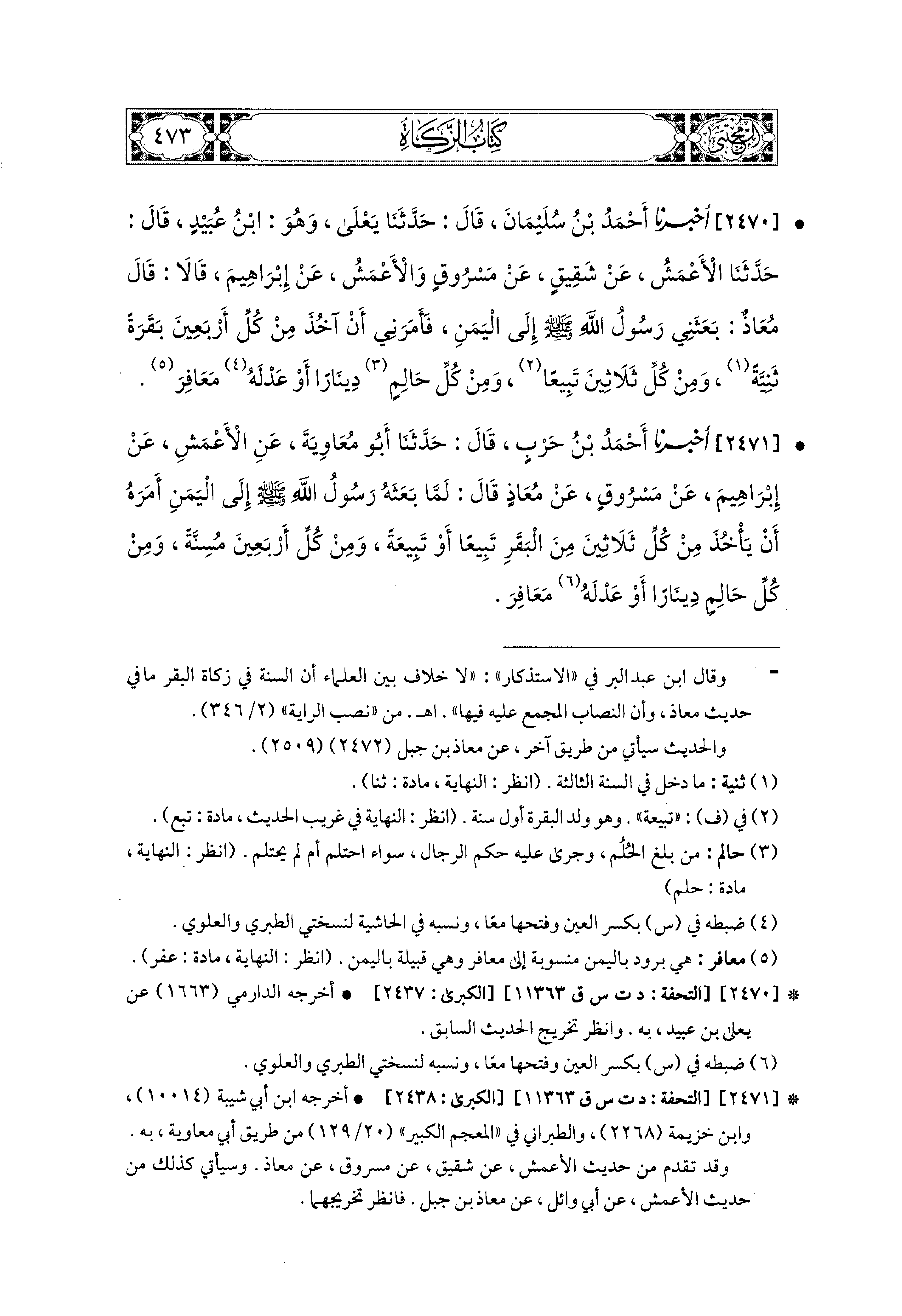2471- أَخبَرَنا أَحْمَدُ بْنُ حَرْبٍ، قال: حَدثنا أَبو مُعَاوِيَةَ، عَنِ الأَعْمَشِ، عَن إِبراهِيمَ، عَن مَسْرُوقٍ، عَن مُعَاذٍ، قَالَ: لَمَّا بَعَثَهُ رَسُولُ اللهِ صَلى الله عَليه وسَلم إِلَى اليَمَنِ أَمَرَهُ أَنْ يَأْخُذَ مِنْ كُلِّ ثَلاَثِينَ مِنَ البَقَرِ تَبِيعًا، أَوْ تَبِيعَةً، وَمِنْ كُلِّ أَرْبَعِينَ مُسِنَّةً، وَمِنْ كُلِّ حَالِمٍ دِينَارًا، أَوْ عِدْلَهُ مَعَافِرَ.
