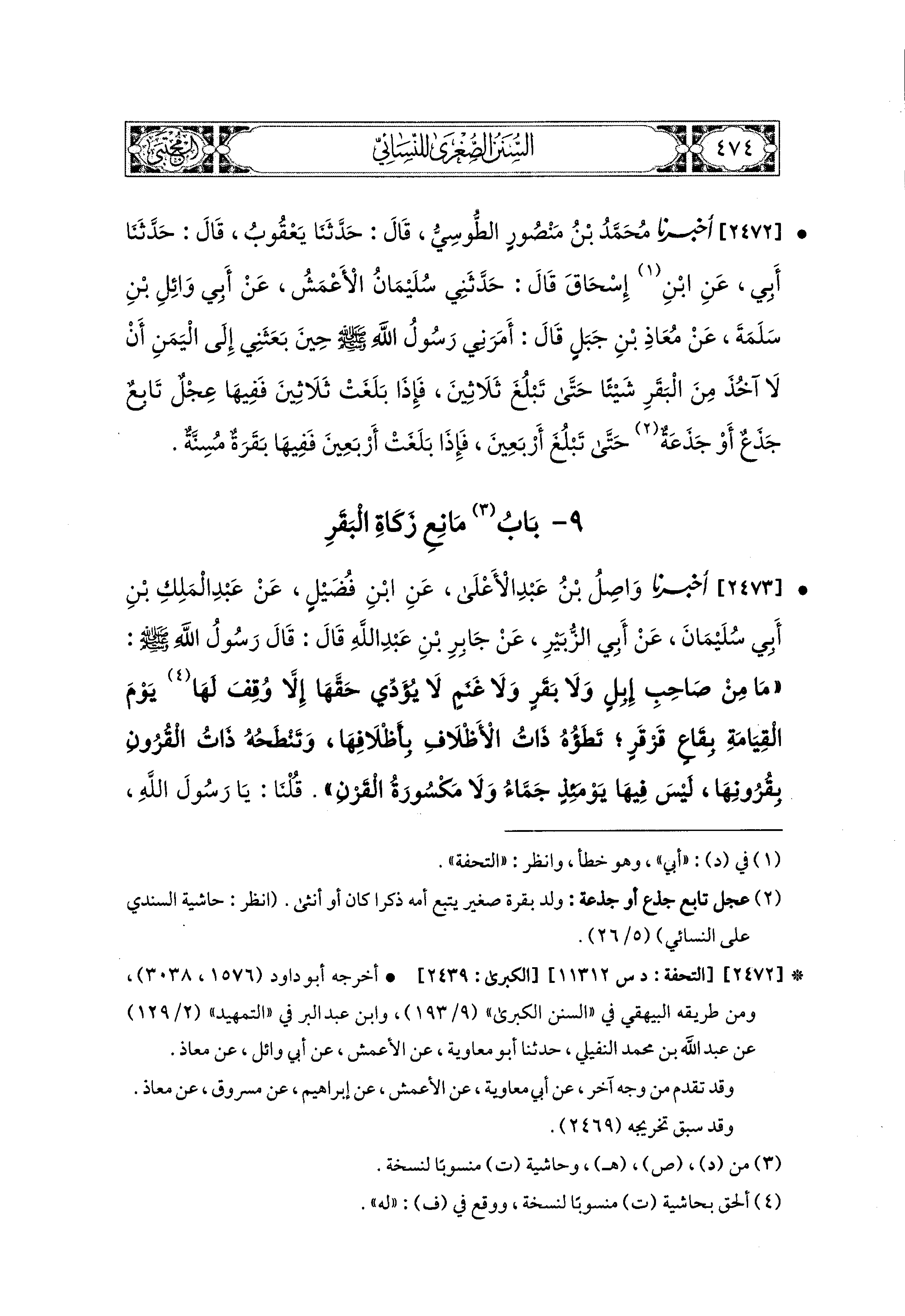 2472- أَخبَرَنا مُحَمد بْنُ مَنْصُورٍ الطُّوسِيُّ، قال: حَدثنا يَعقُوبُ، قال: حَدثنا أَبي، عَنِ ابنِ إِسحَاقَ، قَالَ: حَدَّثَني سُلَيمَانُ الأَعْمَشُ، عَن أَبي وَائِلِ بْنِ سَلَمَةَ، عَن مُعَاذِ بْنِ جَبَلٍ، قَالَ: أَمَرَني رَسُولُ اللهِ صَلى الله عَليه وسَلم حِينَ بَعَثَني إِلَى اليَمَنِ أَنْ لاَ آخُذَ مِنَ البَقَرِ شَيْئًا حَتَّى تَبْلُغَ ثَلاَثِينَ، فَإِذَا بَلَغَتْ ثَلاَثِينَ فَفِيهَا عِجْلٌ تَابِعٌ جَذَعٌ، أَوْ جَذَعَةٌ حَتَّى تَبْلُغَ أَرْبَعِينَ، فَإِذَا بَلَغَتْ أَرْبَعِينَ فَفِيهَا بَقَرَةٌ مُسِنَّةٌ.