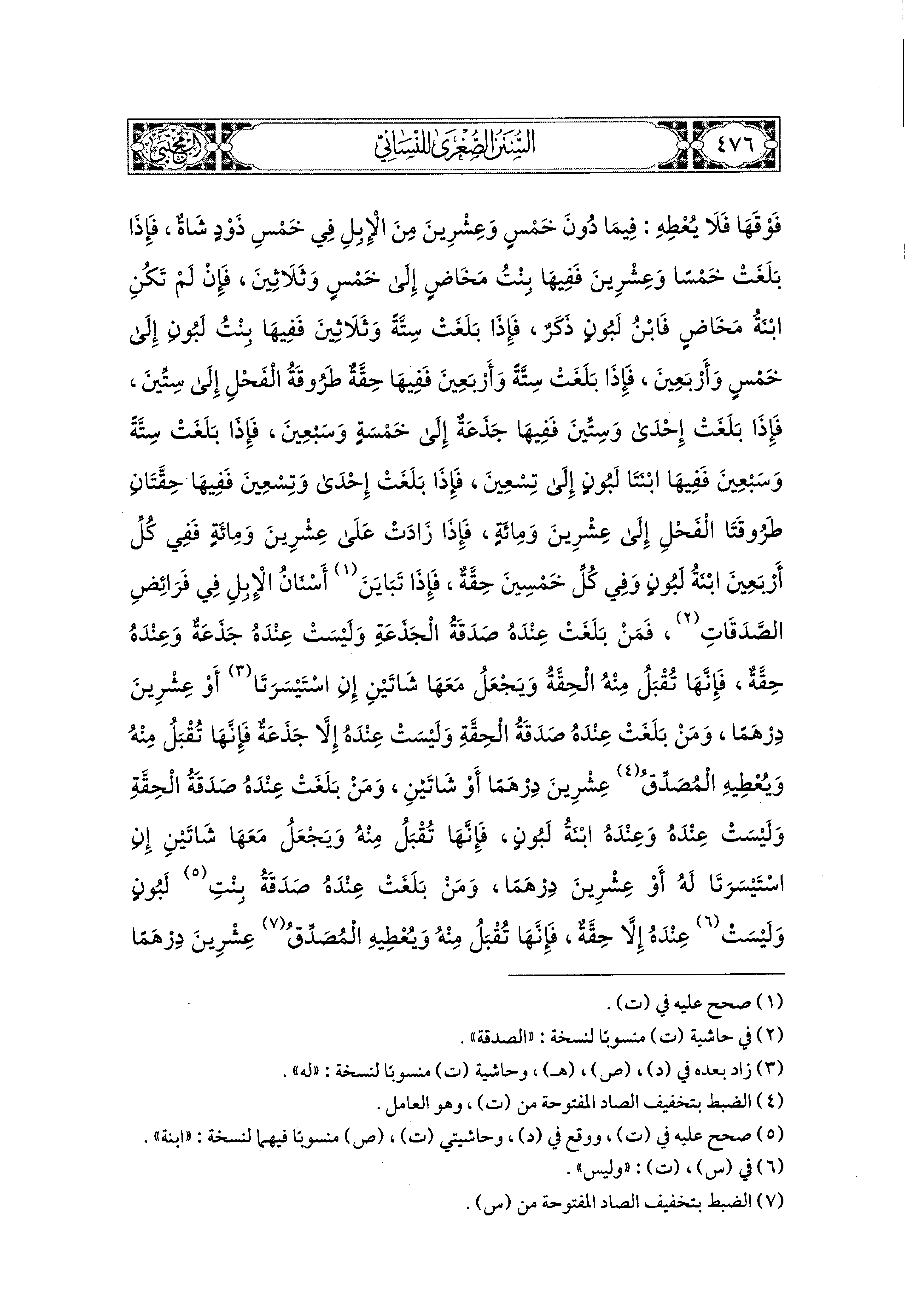 وَمَنْ بَلَغَتْ عِنْدَهُ صَدَقَةُ بِنْتِ لَبُونٍ وَلَيْسَتْ عِنْدَهُ إِلاَّ حِقَّةٌ، فَإِنَّهَا تُقْبَلُ مِنْهُ وَيُعْطِيهِ المُصَّدِّقُ عِشْرِينَ دِرْهَمًا، أَوْ شَاتَيْنِ، وَمَنْ بَلَغَتْ عِنْدَهُ صَدَقَةُ بِنْتِ لَبُونٍ وَلَيْسَتْ عِنْدَهُ بِنْتُ لَبُونٍ وَعِنْدَهُ بِنْتُ مَخَاضٍ، فَإِنَّهَا تُقْبَلُ مِنْهُ وَيَجْعَلُ مَعَهَا شَاتَيْنِ إِنِ اسْتَيْسَرَتَا لَهُ، أَوْ عِشْرِينَ دِرْهَمًا، وَمَنْ بَلَغَتْ عِنْدَهُ صَدَقَةُ ابنَةِ مَخَاضٍ وَلَيْسَتْ عِنْدَهُ إِلاَّ ابنُ لَبُونٍ ذَكَرٌ فَإِنَّهُ يُقْبَلُ مِنْهُ وَلَيْسَ مَعَهُ شَيْءٌ، وَمَنْ لَمْ يَكُنْ عِنْدَهُ إِلاَّ أَرْبَعَةٌ مِنَ الإِبِلِ فَلَيْسَ فِيهَا شَيْءٌ إِلاَّ أَنْ يَشَاءَ رَبُّهَا، وَفِي صَدَقَةِ الغَنَمِ فِي سَائِمَتِهَا إِذَا كَانَتْ أَرْبَعِينَ فَفِيهَا شَاةٌ إِلَى عِشْرِينَ وَمِئَةٍ، فَإِذَا زَادَتْ وَاحِدَةً فَفِيهَا شَاتَانِ إِلَى مِئَتَيْنِ، فَإِذَا زَادَتْ وَاحِدَةٌ فَفِيهَا ثَلاَثُ شِيَاهٍ إِلَى ثَلاَثِ مِئَةٍ، فَإِذَا زَادَتْ وَاحِدَةٌ فَفِي كُلِّ مِئَةٍ شَاةٌ، وَلاَ تُؤْخَذُ فِي الصَّدَقَةِ هَرِمَةٌ وَلاَ ذَاتُ عَوَارٍ وَلاَ تَيْسُ الغَنَمِ إِلاَّ أَنْ يَشَاءَ المُصَّدِّقُ، وَلاَ يُجْمَعُ بَيْنَ مُتَفَرِّقٍ، وَلاَ يُفَرَّقُ بَيْنَ مُجْتَمِعٍ خَشْيَةَ الصَّدَقَةِ، وَمَا كَانَ مِنْ خَلِيطَيْنِ فَإِنَّهُمَا يَتَرَاجَعَانِ بَيْنَهُمَا بِالسَّوِيَّةِ، وَإِذَا كَانَتْ سَائِمَةُ الرَّجُلِ نَاقِصَةً مِنْ أَرْبَعِينَ شَاةٌ وَاحِدَةٌ فَلَيْسَ فِيهَا شَيْءٌ إِلاَّ أَنْ يَشَاءَ رَبُّهَا، وَفِي الرِّقَةِ رُبْعُ العُشْرِ، فَإِنْ لَمْ يَكُنِ المَالُ إِلاَّ تِسْعِينَ وَمِئَةً فَلَيْسَ فِيهِ شَيْءٌ إِلاَّ أَنْ يَشَاءَ رَبُّهَا.