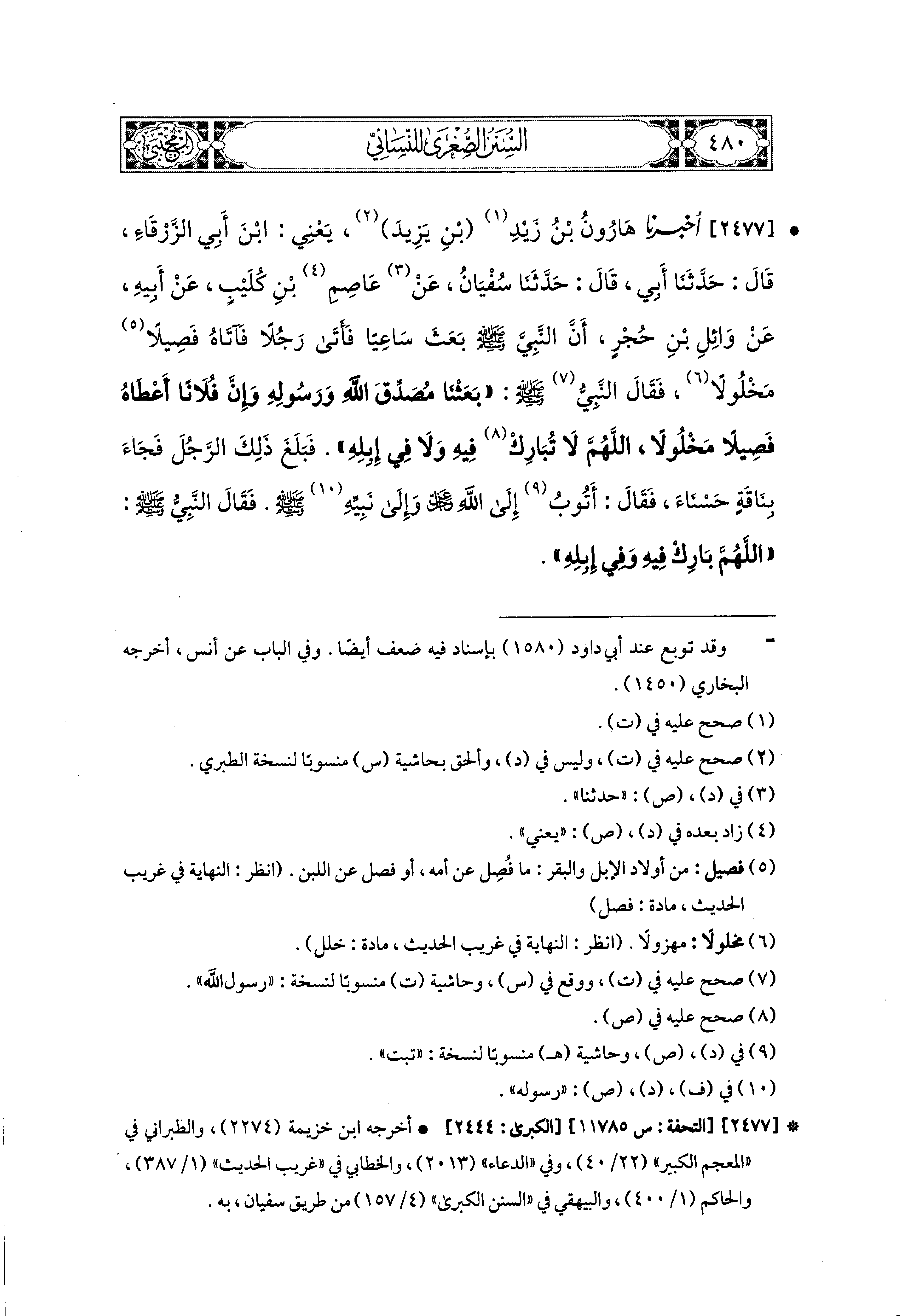 2477- أَخبَرَنا هَارُونُ بْنُ زَيْدِ بْنِ يَزِيدَ، يَعْني ابنَ أَبي الزَّرْقَاءِ، قال: حَدثنا أَبي، قال: حَدثنا سُفيَانُ، عَن عَاصِمِ بْنِ كُلَيْبٍ، عَن أَبيهِ، عَن وَائِلِ بْنِ حُجْرٍ؛ أَنَّ النَّبيَّ صَلى الله عَليه وسَلم بَعَثَ سَاعِيًا فَأَتَى رَجُلاً فَآتَاهُ فَصِيلاً مَخْلُولاً، فَقَالَ النَّبيُّ صَلى الله عَليه وسَلم: بَعَثْنَا مُصَدِّقَ اللهِ وَرَسُولِهِ، وَإِنَّ فُلاَنًا أَعْطَاهُ فَصِيلاً مَخْلُولاً، اللهُمَّ لاَ تُبَارِكْ فِيهِ وَلاَ فِي إِبِلِهِ، فَبَلَغَ ذَلِكَ الرَّجُلَ فَجَاءَ بِنَاقَةٍ حَسْنَاءَ، فَقَالَ: أَتُوبُ إِلَى اللهِ عَزَّ وَجَلَّ وَإِلَى نَبِيِّهِ صَلى الله عَليه وسَلم، فَقَالَ النَّبيُّ صَلى الله عَليه وسَلم: اللهُمَّ بَارِكْ فِيهِ وَفِي إِبِلِهِ.