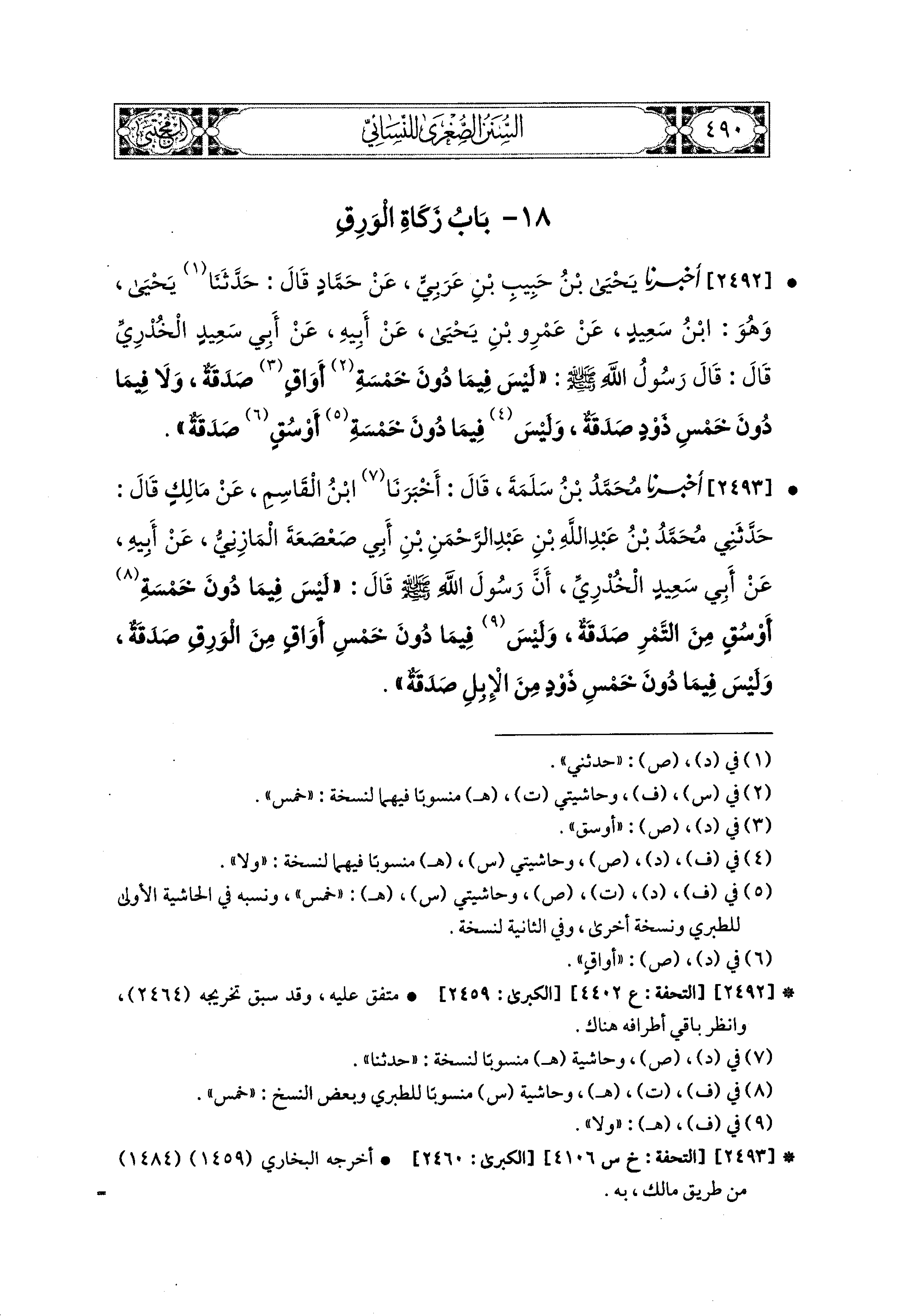 2492- أَخبَرَنا يَحيَى بْنُ حَبِيبِ بْنِ عَرَبِيٍّ، عَن حَمَّادٍ، قال: حَدثنا يَحيَى، وَهُوَ ابنُ سَعيدٍ، عَن عَمْرِو بْنِ يَحيَى، عَن أَبيهِ، عَن أَبي سَعيدٍ الخُدْرِيِّ، قَالَ: قَالَ رَسُولُ اللهِ صَلى الله عَليه وسَلم: لَيْسَ فِيمَا دُونَ خَمْسَةِ أَوَاقٍ صَدَقَةٌ، وَلاَ فِيمَا دُونَ خَمْسِ ذَوْدٍ صَدَقَةٌ، وَلَيْسَ فِيمَا دُونَ خَمْسة أَوْسُقٍ صَدَقَةٌ.
