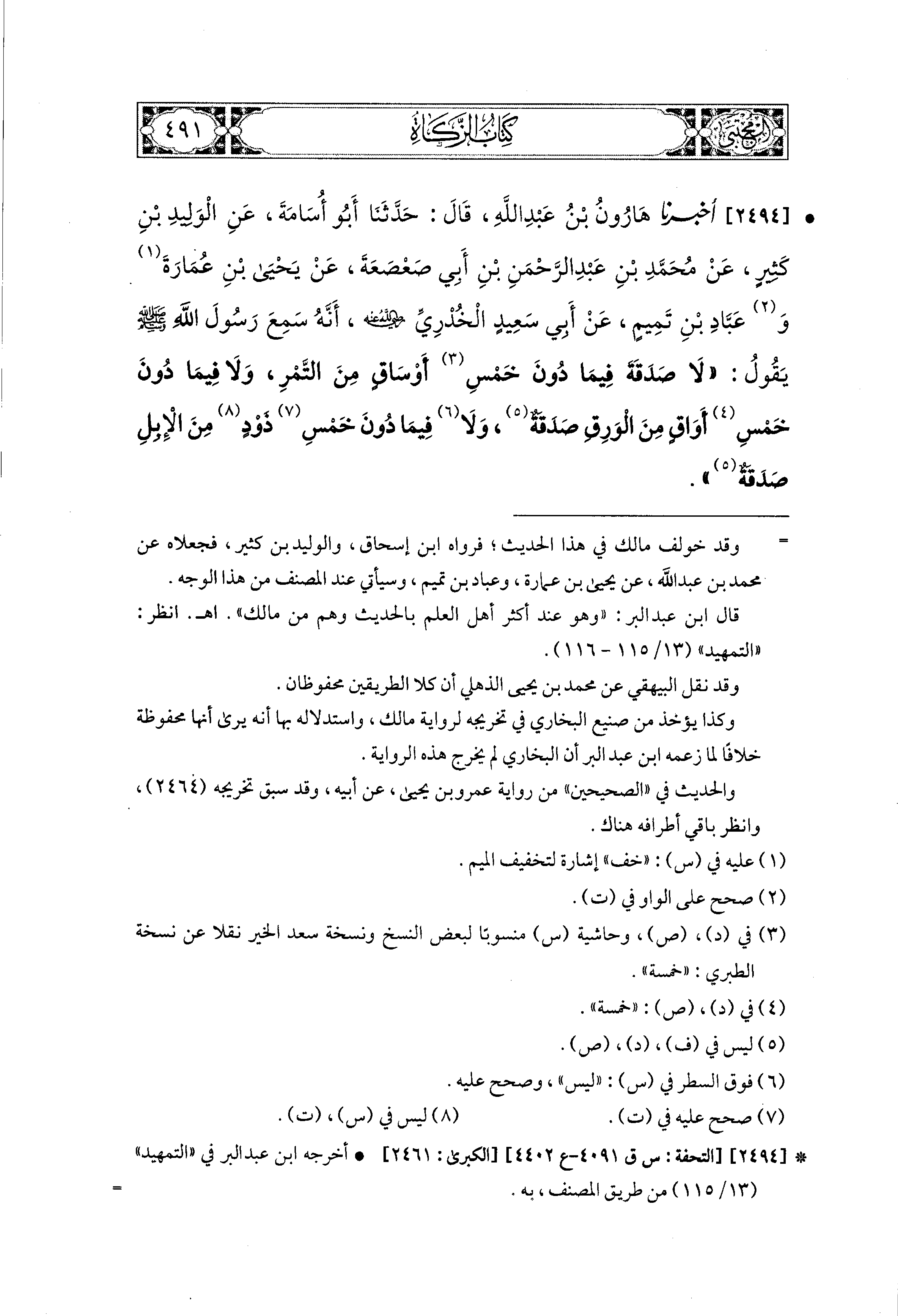 2494- أَخبَرَنا هَارُونُ بْنُ عَبدِ اللهِ، قال: حَدثنا أَبو أُسَامَةَ، عَنِ الوَلِيدِ بْنِ كَثِيرٍ، عَن مُحَمدِ بْنِ عَبدِ الرَّحمَنِ بْنِ أَبي صَعْصَعَةَ، عَن يَحيَى بْنِ عُمَارَةَ، وَعَبَّادِ بْنِ تَميمٍ، عَن أَبي سَعيدٍ الخُدْرِيِّ رَضِيَ اللهُ عَنْهُ، أَنَّهُ سَمِعَ رَسُولَ اللهِ صَلى الله عَليه وسَلم، يَقُولُ: لاَ صَدَقَةَ فِيمَا دُونَ خَمْسِ أَوْسَاقٍ مِنَ التَّمْرِ، وَلاَ فِيمَا دُونَ خَمْسِ أَوَاقٍ مِنَ الوَرِقِ صَدَقَةٌ، وَلاَ فِيمَا دُونَ خَمْسِ ذَوْدٍ مِنَ الإِبِلِ صَدَقَةٌ.
