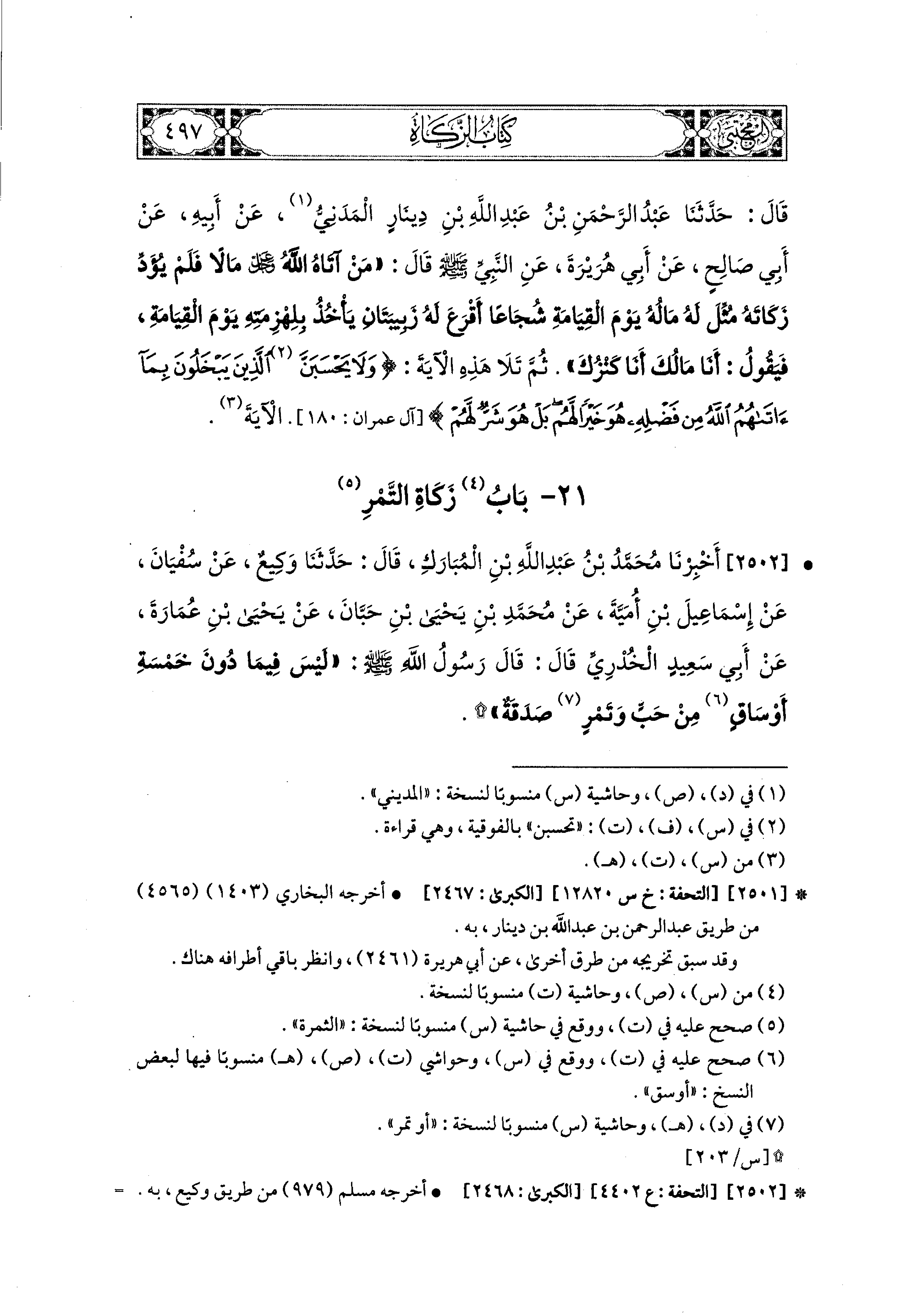 2502- أَخبَرَنا مُحَمد بْنُ عَبدِ اللهِ بْنِ المُبَارَكِ، قال: حَدثنا وَكِيعٌ، عَن سُفيَانَ، عَن إِسماعِيلَ بْنِ أُمَيَّةَ، عَن مُحَمدِ بْنِ يَحيَى بْنِ حَبَّانَ، عَن يَحيَى بْنِ عُمَارَةَ، عَن أَبي سَعيدٍ الخُدْرِيِّ، قَالَ: قَالَ رَسُولُ اللهِ صَلى الله عَليه وسَلم: لَيْسَ فِيمَا دُونَ خَمْسَةِ أَوْسَاقٍ مِنْ حَبٍّ، وتَمْرٍ صَدَقَةٌ.