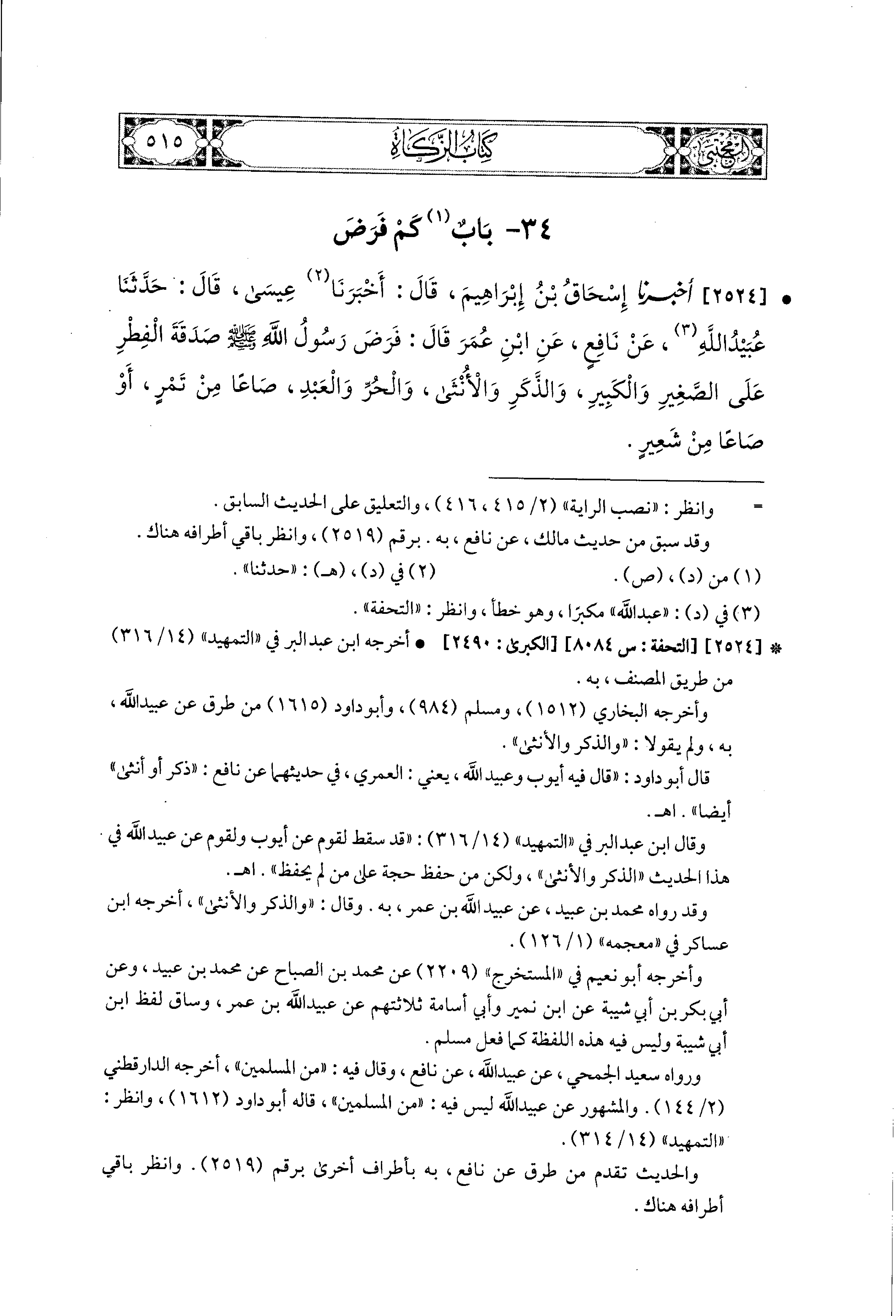 2524- أَخبَرَنا إِسحَاقُ بْنُ إِبراهِيمَ، قَالَ: أَخبَرنا عِيسَى، قال: حَدثنا عُبَيدُ اللهِ، عَن نَافِعٍ، عَنِ ابنِ عُمَرَ، قَالَ: فَرَضَ رَسُولُ اللهِ صَلى الله عَليه وسَلم صَدَقَةَ الفِطْرِ عَلَى الصَّغِيرِ وَالكَبِيرِ، وَالذَّكَرِ وَالأُنْثَى، وَالحُرِّ وَالعَبدِ صَاعًا مِنْ تَمْرٍ، أَوْ صَاعًا مِنْ شَعِيرٍ.