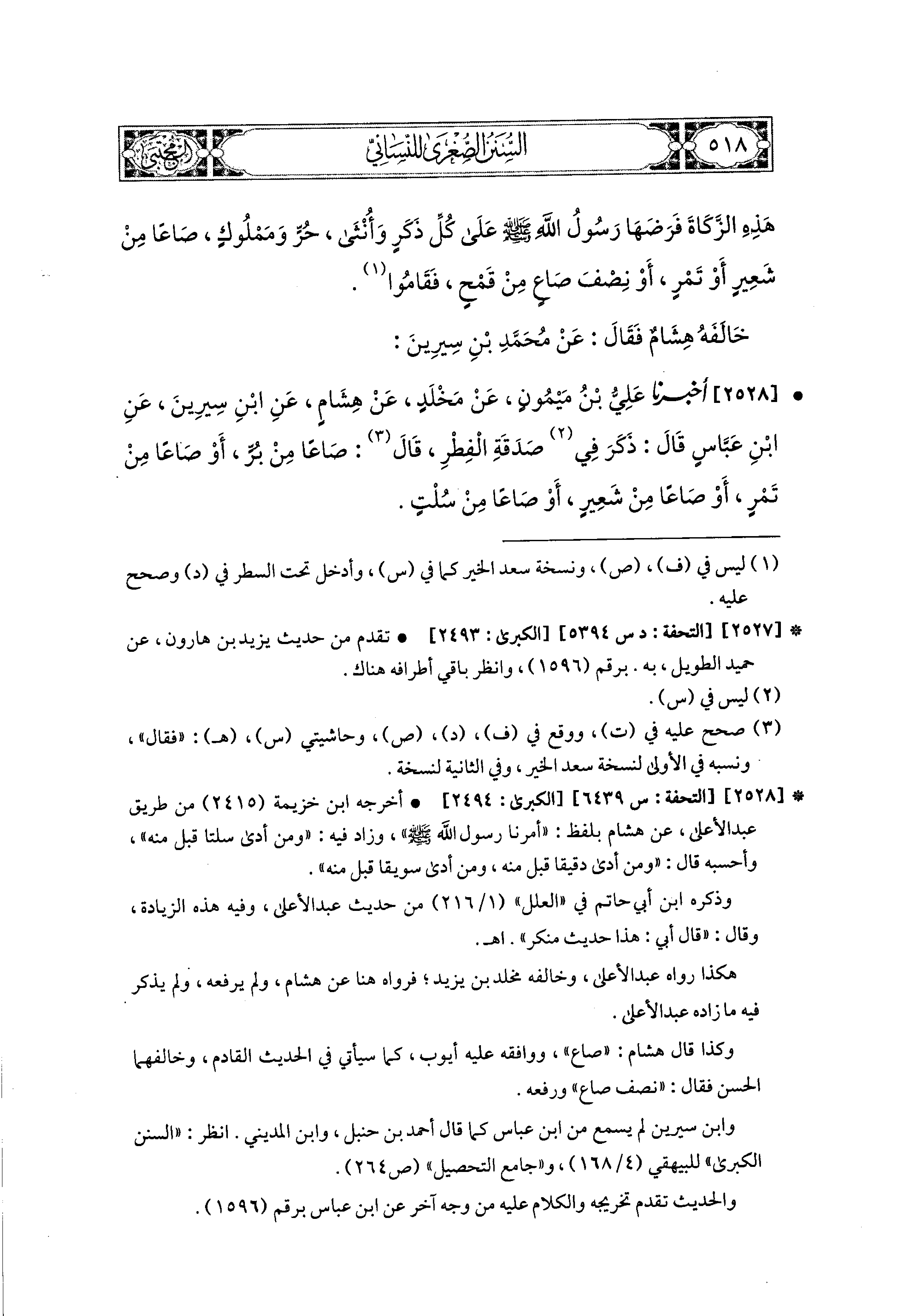 2528- أَخبَرَنا عَلِيُّ بْنُ مَيْمُونٍ، عَن مَخْلَدٍ، عَن هِشَامٍ، عَنِ ابنِ سِيرِينَ، عَنِ ابنِ عَبَّاسٍ، قَالَ: ذَكَرَ فِي صَدَقَةِ الفِطْرِ، قَالَ: صَاعًا مِنْ بُرٍّ، أَوْ صَاعًا مِنْ تَمْرِ، أَوْ صَاعًا مِنْ شَعِيرٍ، أَوْ صَاعًا مِنْ سُلْتٍ.