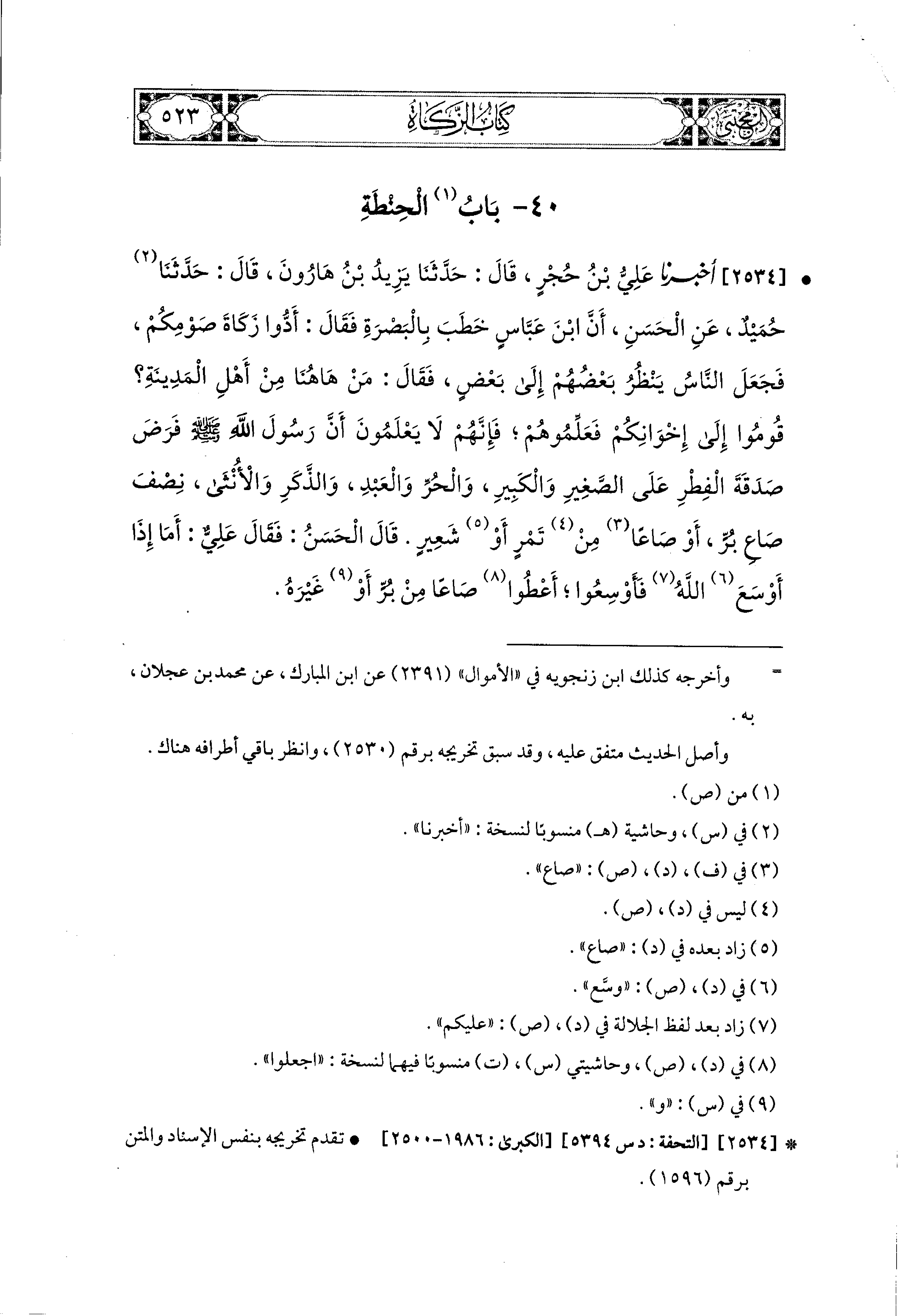 2534- أَخبَرَنا عَلِيُّ بْنُ حُجْرٍ، قال: حَدثنا يَزِيدُ بْنُ هَارُونَ، قال: حَدثنا حُمَيدٌ، عَنِ الحَسَنِ، أَنَّ ابنَ عَبَّاسٍ، خَطَبَ بِالبَصْرَةِ فَقَالَ: أَدُّوا زَكَاةَ صَوْمِكُمْ، فَجَعَلَ النَّاسُ يَنْظُرُ بَعْضُهُمْ إِلَى بَعْضٍ، فَقَالَ: مَنْ هَاهُنَا مِنْ أَهْلِ المَدِينَةِ قُومُوا إِلَى إِخْوَانِكُمْ فَعَلِّمُوهُمْ، فَإِنَّهُمْ لاَ يَعْلَمُونَ أَنَّ رَسُولَ اللهِ صَلى الله عَليه وسَلم فَرَضَ صَدَقَةَ الفِطْرِ عَلَى الصَّغِيرِ وَالكَبِيرِ، وَالحُرِّ وَالعَبدِ، وَالذَّكَرِ وَالأُنْثَى نِصْفَ صَاعِ بُرٍّ، أَوْ صَاعًا مِنْ تَمْرٍ، أَوْ شَعِيرٍ، قَالَ الحَسَنُ: فَقَالَ عَلِيٌّ: أَمَّا إِذَا أَوْسَعَ اللهُ فَأَوْسِعُوا أَعْطُوا صَاعًا مِنْ بُرٍّ، أَوْ غَيْرِهِ.