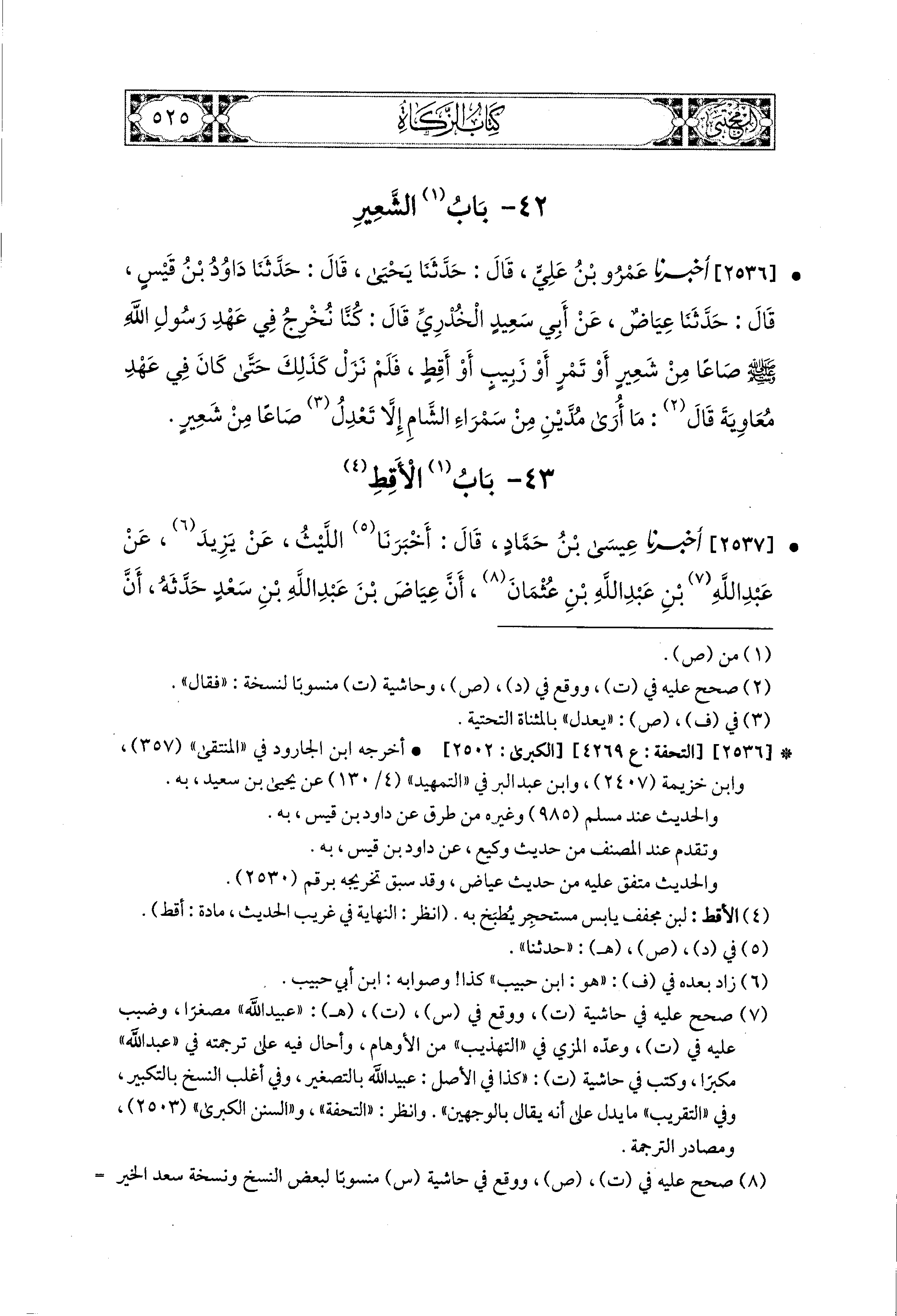 2536- أَخبَرَنا عَمْرُو بْنُ عَلِيٍّ، قال: حَدثنا يَحيَى، قال: حَدثنا دَاوُدُ بْنُ قَيْسٍ، قال: حَدثنا عِيَاضٌ، عَن أَبي سَعيدٍ الخُدْرِيِّ، قَالَ: كُنَّا نُخْرِجُ فِي عَهْدِ رَسُولِ اللهِ صَلى الله عَليه وسَلم صَاعًا مِنْ شَعِيرٍ، أَوْ تَمْرٍ، أَوْ زَبِيبٍ، أَوْ أَقِطٍ، فَلَمْ نَزَلْ كَذَلِكَ حَتَّى كَانَ فِي عَهْدِ مُعَاوِيَةَ، قَالَ: مَا أَرَى مُدَّيْنِ مِنْ سَمْرَاءِ الشَّامِ إِلاَّ تَعْدِلُ صَاعًا مِنْ شَعِيرٍ.