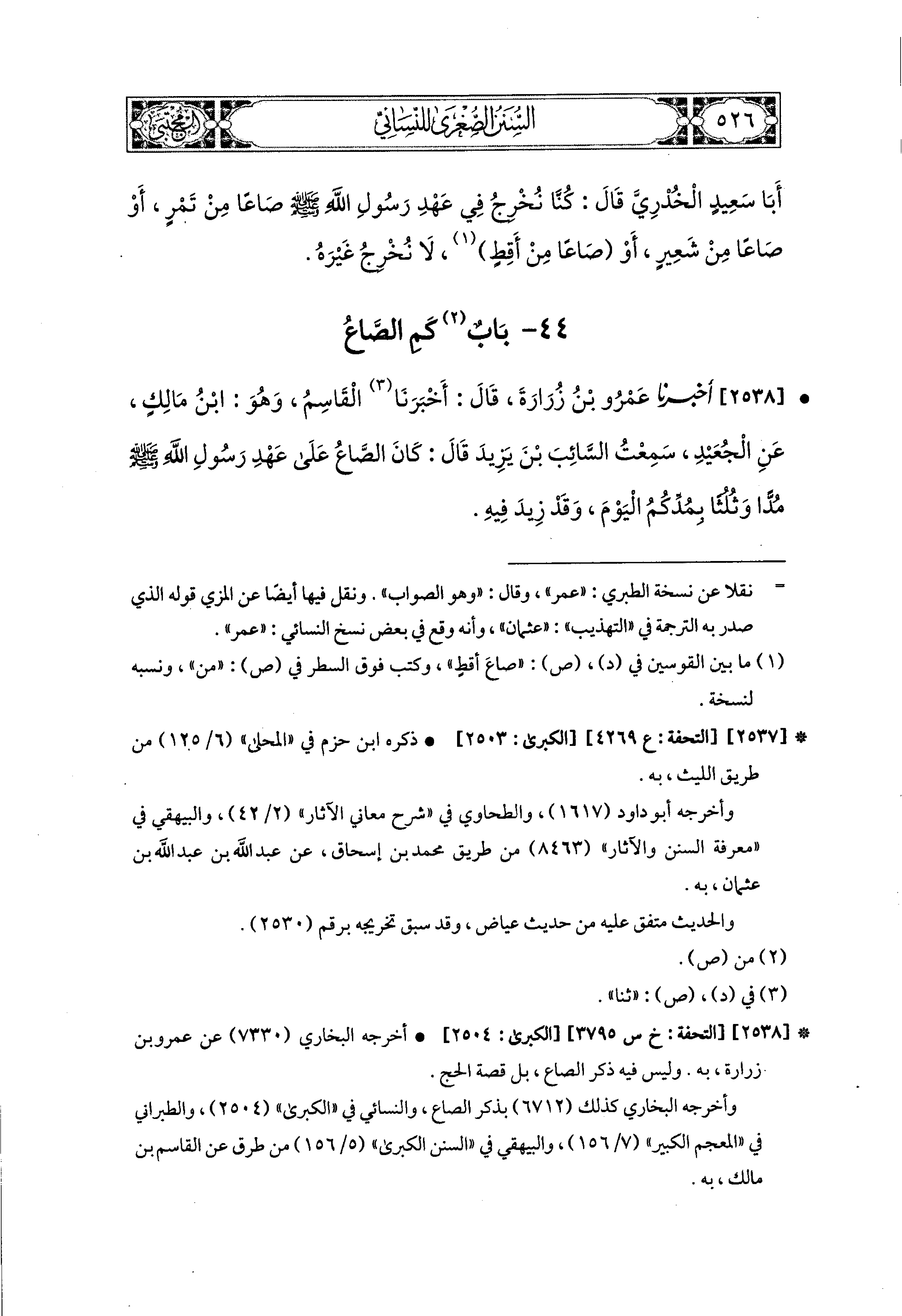 2538- أَخبَرَنا عَمْرُو بْنُ زُرَارَةَ، قَالَ: أَخبَرنا القَاسِمُ، وَهُوَ ابنُ مَالِكٍ، عَنِ الجُعَيْدِ، سَمِعْتُ السَّائِبَ بْنَ يَزِيدَ، قَالَ: كَانَ الصَّاعُ عَلَى عَهْدِ رَسُولِ اللهِ صَلى الله عَليه وسَلم مُدًّا وَثُلُثًا بِمُدِّكُمُ اليَوْمَ وَقَدْ زِيدَ فِيهِ.