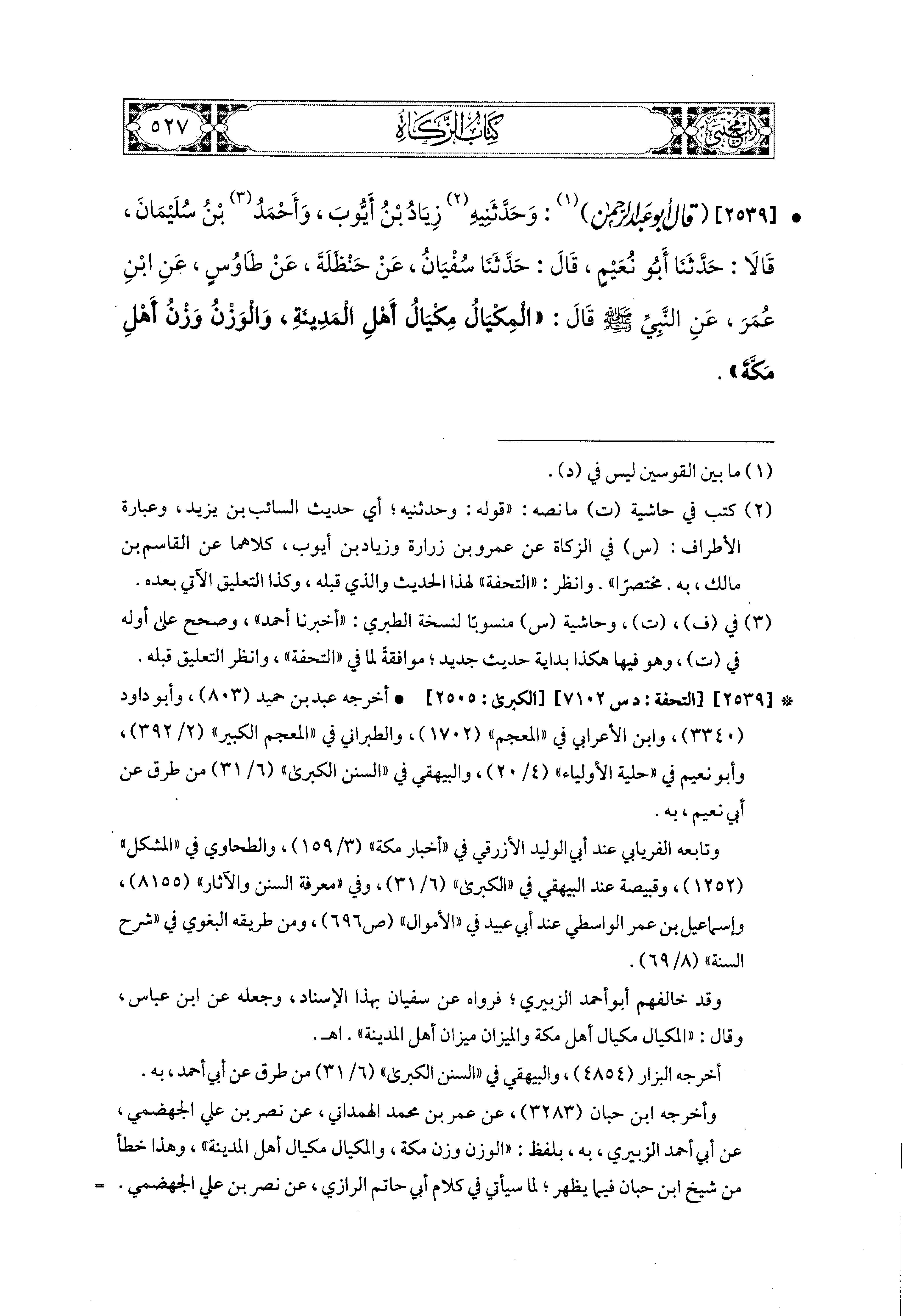 2539- قَالَ أَبو عَبدِ الرَّحمَنِ: وَحَدَّثَنيهِ زِيَادُ بْنُ أَيُّوبَ وَأَحْمَدُ بْنُ سُلَيمَانَ، قَالا حَدَّثَنَا أَبو نُعَيْمٍ، قال: حَدثنا سُفيَانُ، عَن حَنْظَلَةَ، عَن طَاوُوسٍ، عَنِ ابنِ عُمَرَ، عَنِ النَّبيِّ صَلى الله عَليه وسَلم قَالَ: المِكْيَالُ مِكْيَالُ أَهْلِ المَدِينَةِ وَالوَزْنُ وَزْنُ أَهْلِ مَكَّةَ.