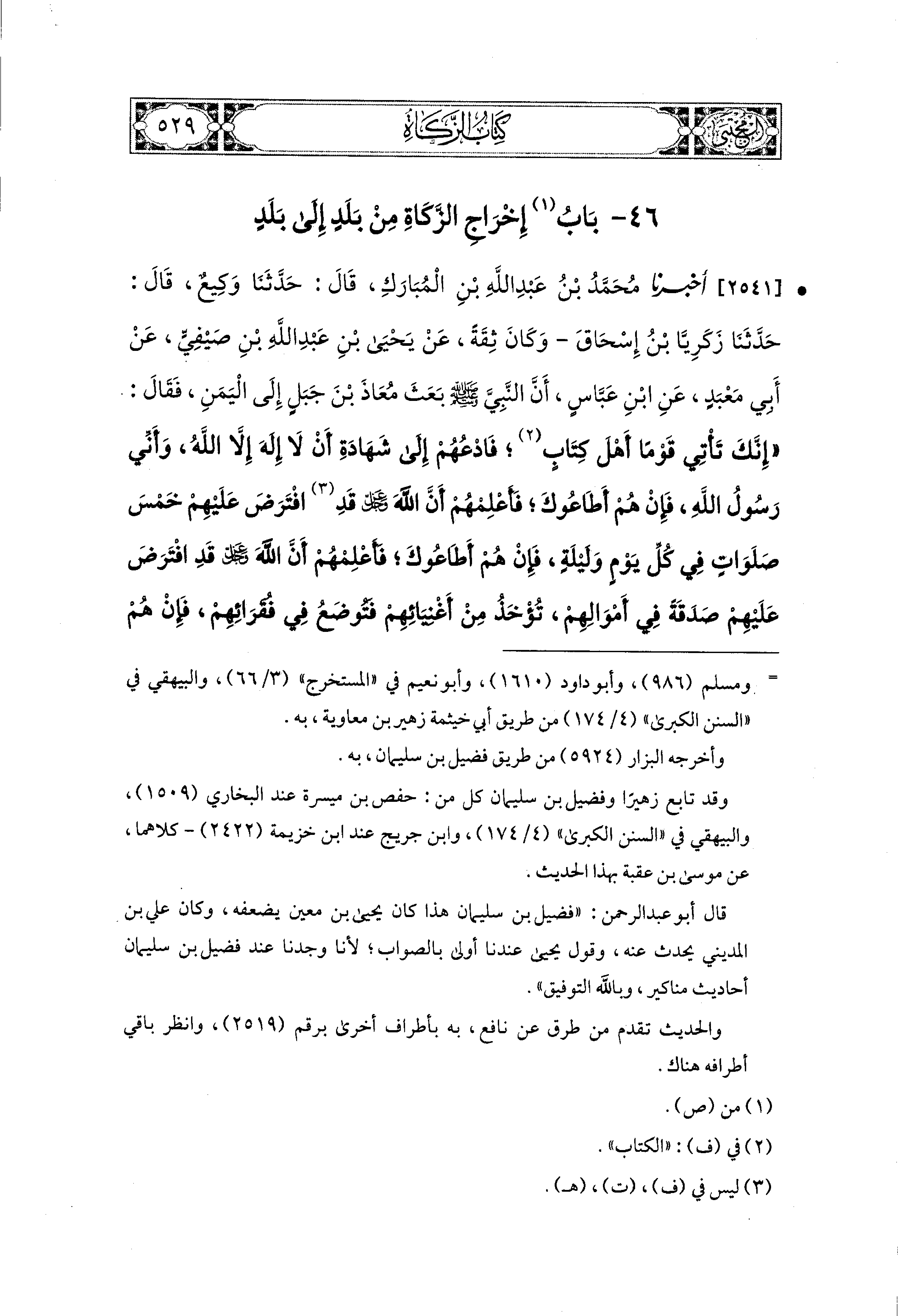 2541- أَخبَرَنا مُحَمد بْنُ عَبدِ اللهِ بْنِ المُبَارَكِ، قال: حَدثنا وَكِيعٌ، قال: حَدثنا زَكَرِيَّا بْنُ إِسحَاقَ، وَكَانَ ثِقَةً، عَن يَحيَى بْنِ عَبدِ اللهِ بْنِ صَيْفِيٍّ، عَن أَبي مَعْبَدٍ، عَنِ ابنِ عَبَّاسٍ، أَنَّ النَّبيَّ صَلى الله عَليه وسَلم بَعَثَ مُعَاذَ بْنَ جَبَلٍ إِلَى اليَمَنِ، فَقَالَ: إِنَّكَ تَأْتِي قَوْمَا أَهْلَ كِتَابٍ فَادْعُهُمْ إِلَى شَهَادَةِ أَنْ لاَ إِلَهَ إِلاَّ اللهُ وَأَنِّي رَسُولُ اللهِ، فَإِنْ هُمْ أَطَاعُوكَ، فَأَعْلِمْهُمْ أَنَّ اللهَ عَزَّ وَجَلَّ قد افْتَرَضَ عَلَيهِمْ: خَمْسَ صَلَوَاتٍ فِي كُلِّ يَوْمٍ وَلَيْلَةٍ، فَإِنْ هُمْ أَطَاعُوكَ، فَأَعْلِمْهُمْ أَنَّ اللهَ عَزَّ وَجَلَّ قَدِ افْتَرَضَ عَلَيهِمْ صَدَقَةً فِي أَمْوَالِهِمْ، تُؤْخَذُ مِنْ أَغْنيَائِهِمْ، فَتُوضَعُ فِي فُقَرَائِهِمْ، فَإِنْ هُمْ أَطَاعُوكَ لِذَلِكَ، فَإِيَّاكَ وَكَرَائِمَ أَمْوَالِهِمْ، وَاتَّقِ دَعْوَةَ المَظْلُومِ، فَإِنَّهَا لَيْسَ بَيْنَهَا وَبَيْنَ اللهِ عَزَّ وَجَلَّ حِجَابٌ.