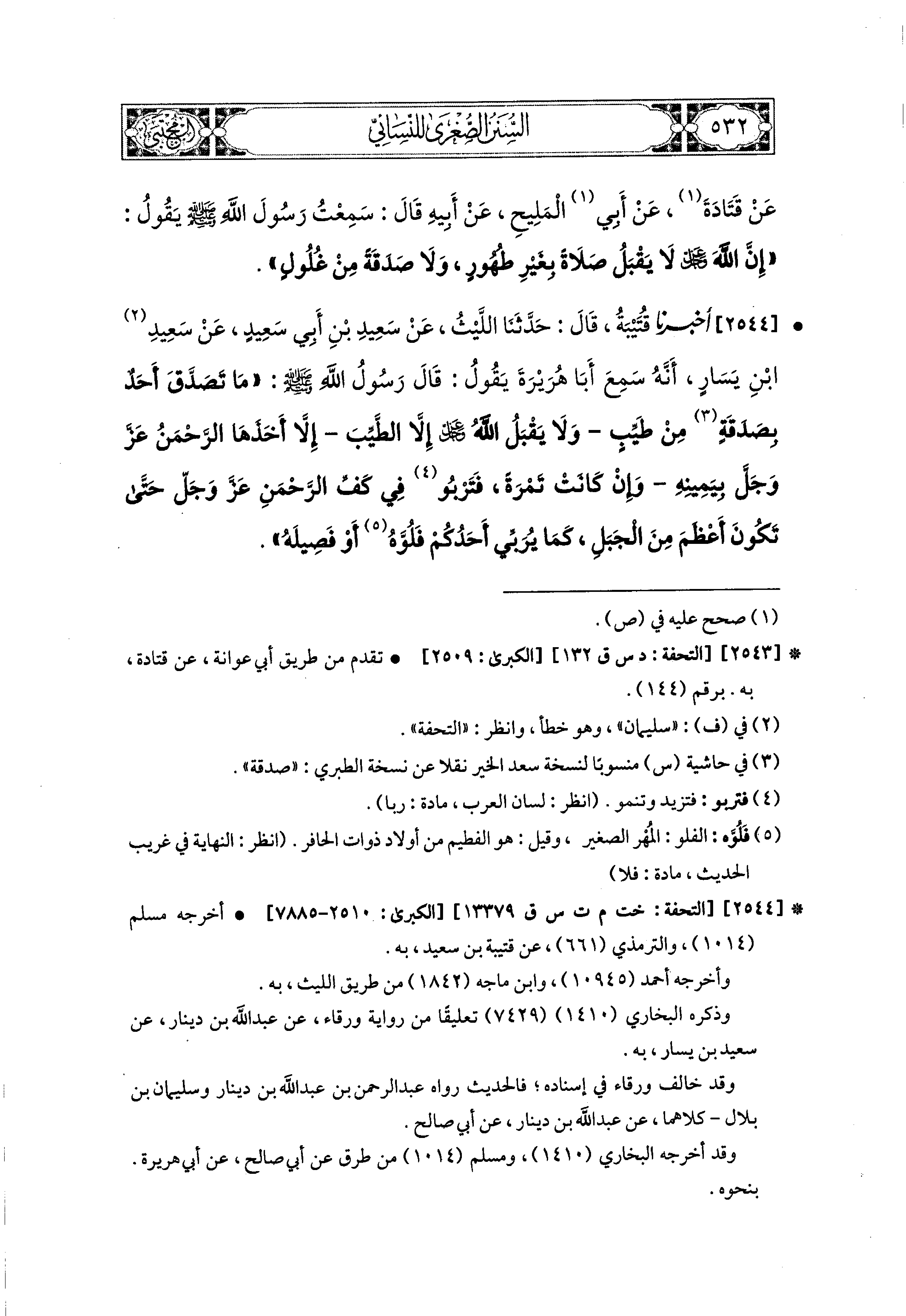 2544- أَخبَرَنا قُتَيبَةُ، قال: حَدثنا اللَّيْثُ، عَن سَعيدِ بْنِ أَبي سَعيدٍ، عَن سَعيدِ بْنِ يَسَارٍ، أَنَّهُ سَمِعَ أَبَا هُرَيرَةَ، يَقُولُ: قَالَ رَسُولُ اللهِ صَلى الله عَليه وسَلم: مَا تَصَدَّقَ أَحَدٌ بِصَدَقَةٍ مِنْ طَيِّبٍ، وَلاَ يَقْبَلُ اللهُ عَزَّ وَجَلَّ إِلاَّ الطَّيِّبَ، إِلاَّ أَخَذَهَا الرَّحمَنُ عَزَّ وَجَلَّ بِيَمينِهِ، وَإِنْ كَانَتْ تَمْرَةً، فَتَرْبُو فِي كَفِّ الرَّحمَنِ عَزَّ وَجَلَّ، حَتَّى تَكُونَ أَعْظَمَ مِنَ الجَبَلِ، كَمَا يُرَبِّي أَحَدُكُمْ فَلُوَّهُ، أَوْ فَصِيلَهُ.