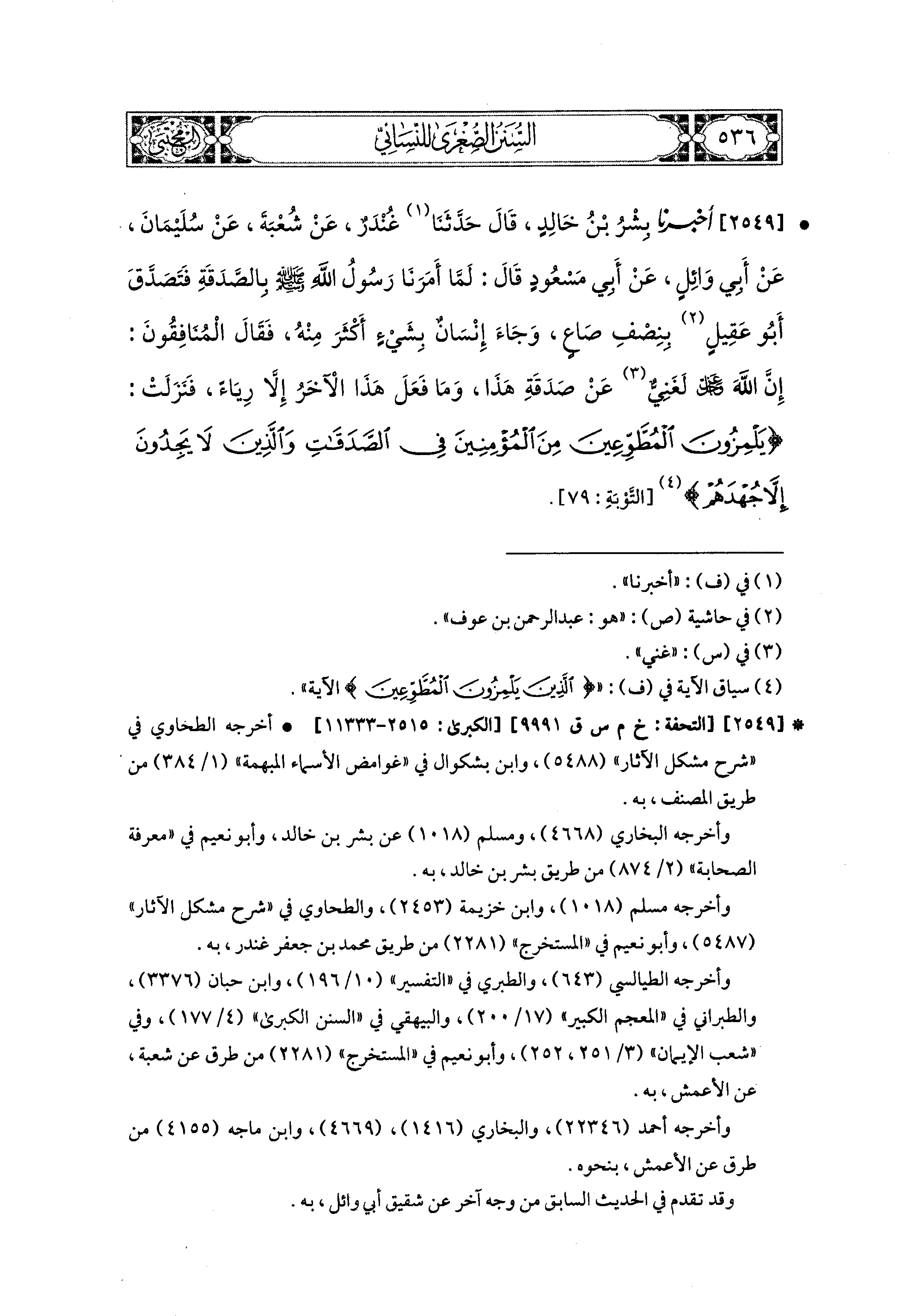 2549- أَخبَرَنا بِشْرُ بْنُ خَالِدٍ، قال: حَدثنا غُنْدَرٌ، عَن شُعبَةَ، عَن سُلَيمَانَ، عَن أَبي وَائِلٍ، عَن أَبي مَسْعُودٍ، قَالَ: لَمَّا أَمَرَنَا رَسُولُ اللهِ صَلى الله عَليه وسَلم بِالصَّدَقَةِ، فَتَصَدَّقَ أَبو عَقِيلٍ بِنِصْفِ صَاعٍ، وَجَاءَ إِنْسَانٌ بِشَيْءٍ أَكْثَرَ مِنْهُ، فَقَالَ المُنَافِقُونَ: إِنَّ اللهَ عَزَّ وَجَلَّ لَغَنيٌّ عَن صَدَقَةِ هَذَا، وَمَا فَعَلَ هَذَا الآخَرُ إِلاَّ رِيَاءً، فَنَزَلَتْ: {الَّذِينَ يَلْمِزُونَ المُطَّوِّعِينَ مِنَ المُؤْمِنينَ فِي الصَّدَقَاتِ وَالَّذِينَ لاَ يَجِدُونَ إِلاَّ جُهْدَهُمْ}.