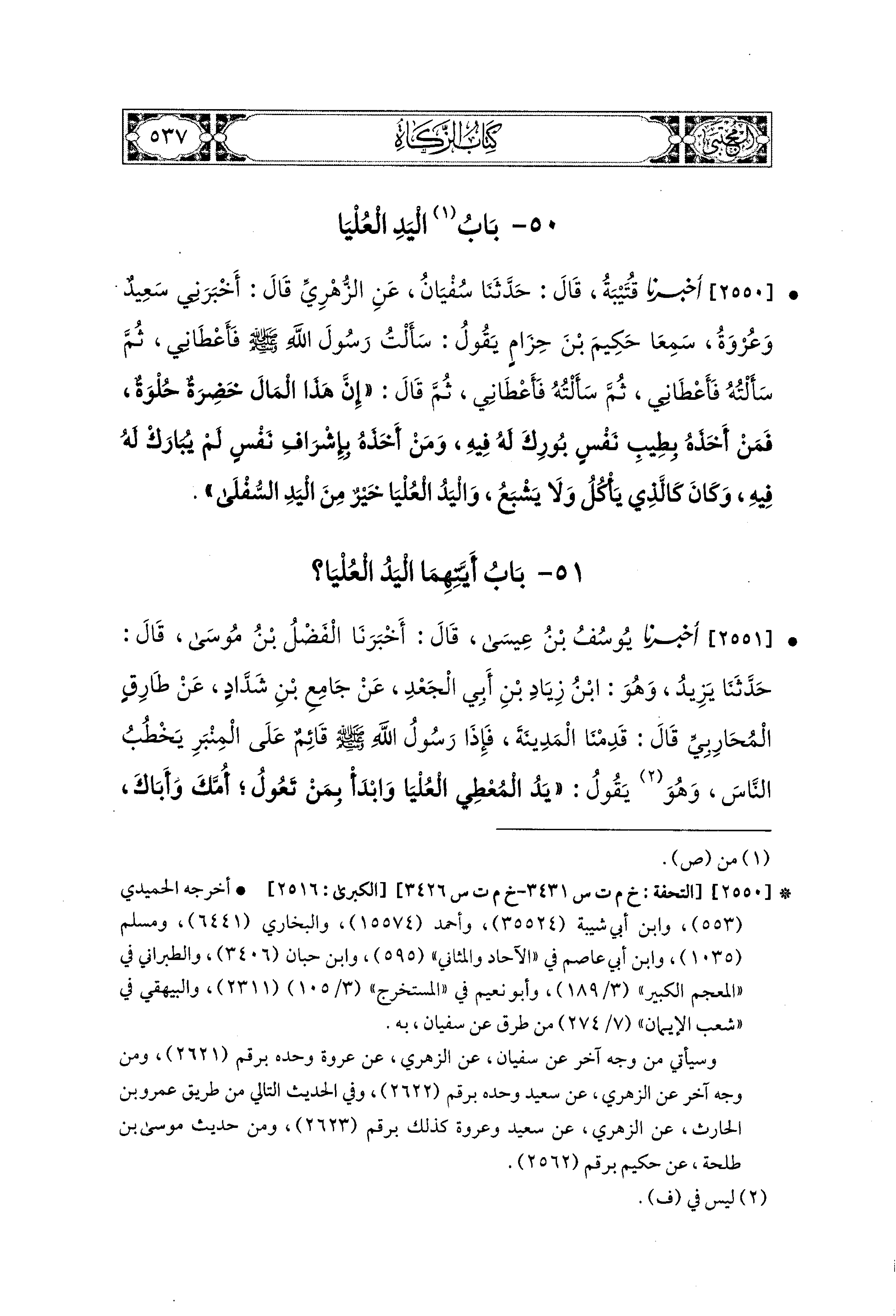 2550- أَخبَرَنا قُتَيبَةُ، قال: حَدثنا سُفيَانُ، عَنِ الزُّهْرِيِّ، قَالَ: أَخبَرني سَعيدٌ، وَعُرْوَةُ، سَمِعَا حَكِيمَ بْنَ حِزَامٍ، يَقُولُ: سَأَلْتُ رَسُولَ اللهِ صَلى الله عَليه وسَلم فَأَعْطَاني، ثُمَّ سَأَلْتُهُ فَأَعْطَاني، ثُمَّ سَأَلْتُهُ فَأَعْطَاني، ثُمَّ قَالَ: إِنَّ هَذَا المَالَ خَضِرَةٌ حُلْوَةٌ، فَمَنْ أَخَذَهُ بِطِيبِ نَفْسٍ، بُورِكَ لَهُ فِيهِ، وَمَنْ أَخَذَهُ بِإِشْرَافِ نَفْسٍ، لَمْ يُبَارَكْ لَهُ فِيهِ، وَكَانَ كَالَّذِي يَأْكُلُ وَلاَ يَشْبَعُ، وَاليَدُ العُلْيَا، خَيْرٌ مِنَ اليَدِ السُّفْلَى.