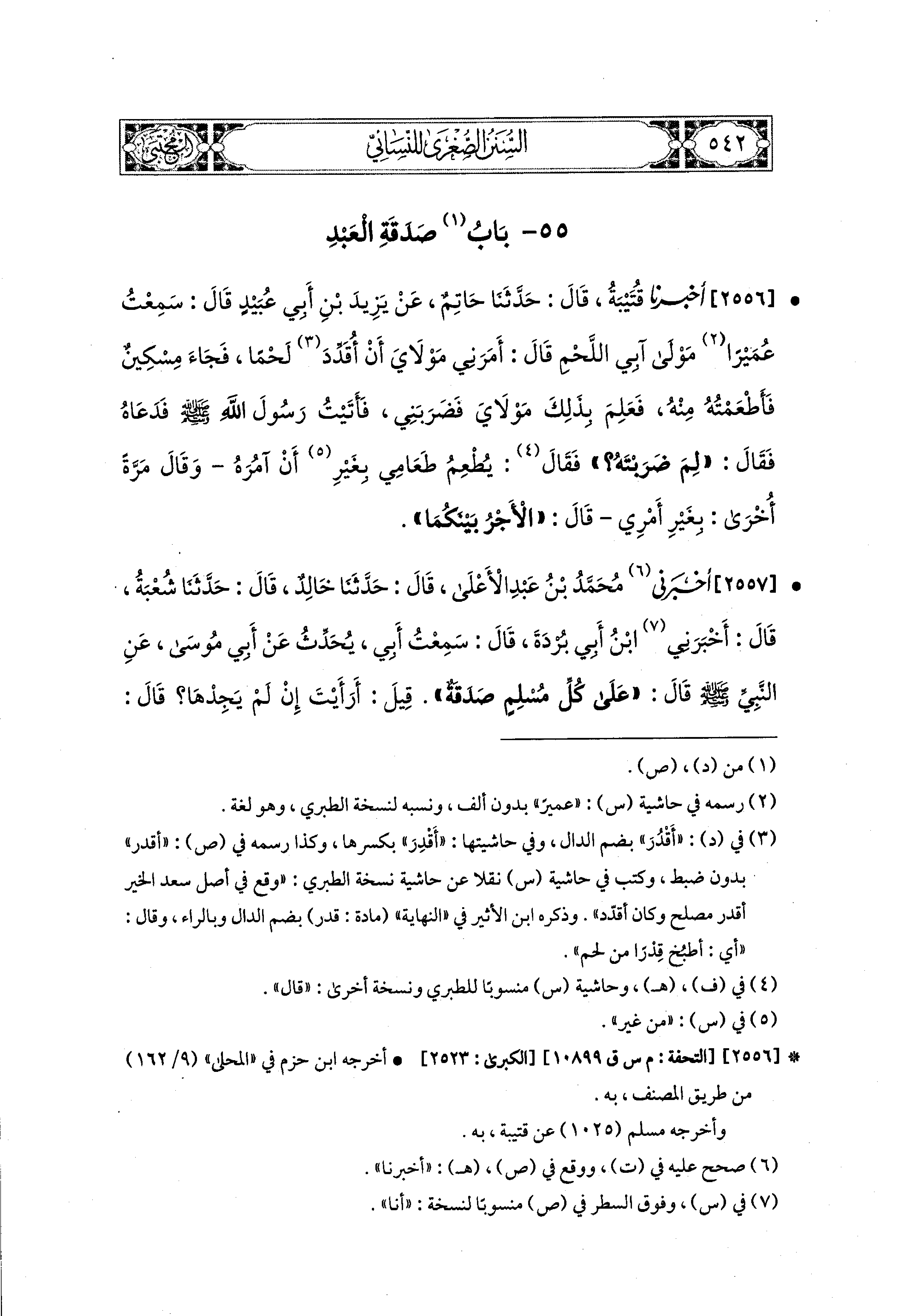 2556- أَخبَرَنا قُتَيبَةُ، قال: حَدثنا حَاتِمٌ، عَن يَزِيدَ بْنِ أَبي عُبَيدٍ، قَالَ: سَمِعْتُ عُمَيْرًا مَوْلَى آبِي اللَّحْمِ، قَالَ: أَمَرَني مَوْلاَيَ أَنْ أُقَدِّدَ لَحْمًا، فَجَاءَ مِسكينٌ، فَأَطْعَمْتُهُ مِنْهُ، فَعَلِمَ بِذَلِكَ مَوْلاَيَ فَضَرَبَني، فَأَتَيْتُ رَسُولَ اللهِ صَلى الله عَليه وسَلم، فَدَعَاهُ، فَقَالَ: لِمَ ضَرَبْتَهُ؟ فَقَالَ: يُطْعِمُ طَعَامي بِغَيْرِ أَنْ آمُرَهُ، وَقَالَ مَرَّةً أُخْرَى: بِغَيْرِ أَمْرِي، قَالَ: الأَجْرُ بَيْنَكُمَا.