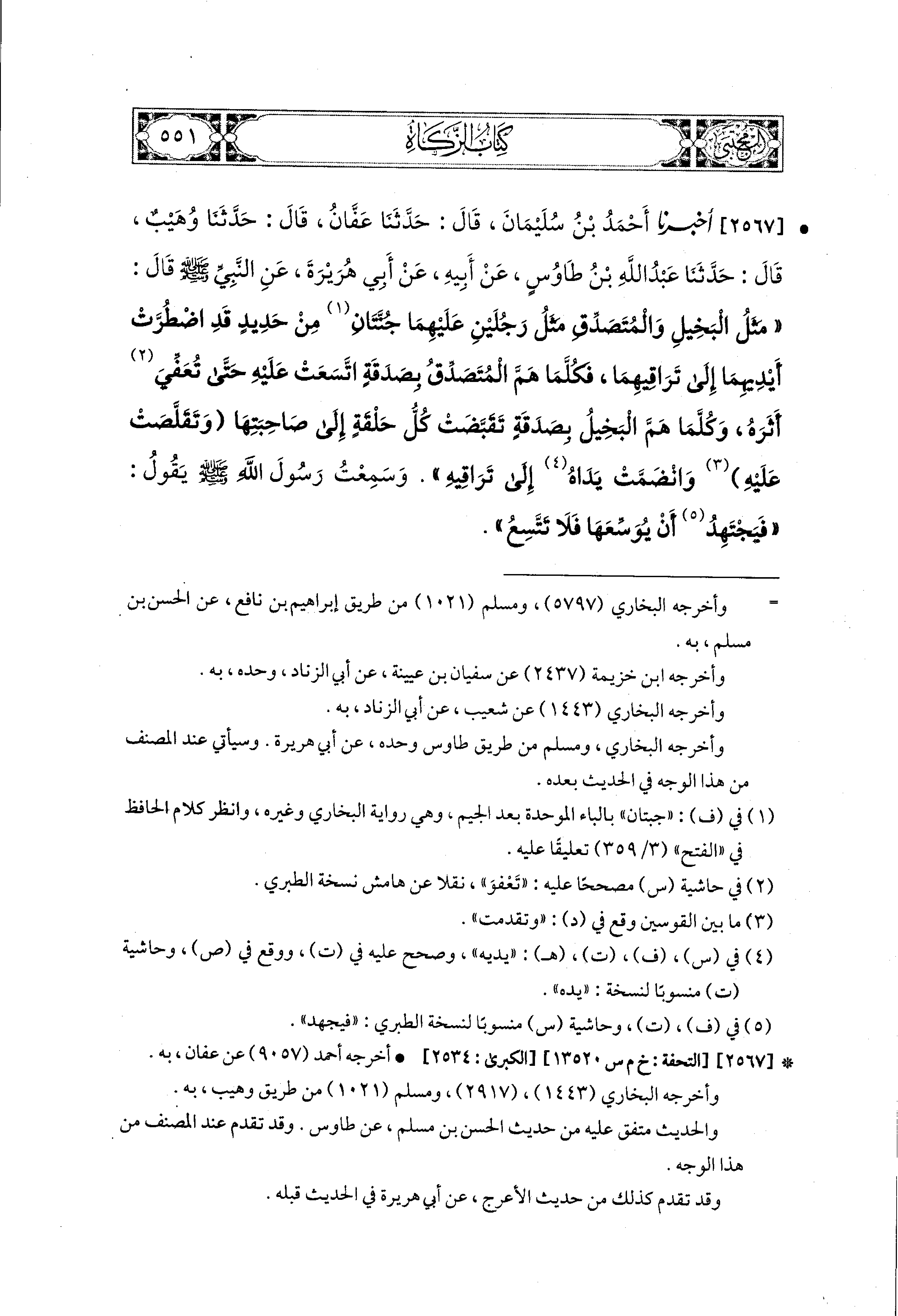 2567- أَخبَرَنا أَحْمَدُ بْنُ سُلَيمَانَ، قال: حَدثنا عَفَّانُ، قال: حَدثنا وُهَيْبٌ، قال: حَدثنا عَبدُ اللهِ بْنُ طَاوُوسٍ، عَن أَبيهِ، عَن أَبي هُرَيرَةَ، عَنِ النَّبيِّ صَلى الله عَليه وسَلم قَالَ: مَثَلُ البَخِيلِ، وَالمُتَصَدِّقِ، مَثَلُ رَجُلَيْنِ عَلَيهِمَا جُنَّتَانِ مِنْ حَدِيدٍ، قَدِ اضْطَرَّتْ أَيْدِيَهُمَا إِلَى تَرَاقِيهِمَا، فَكُلَّمَا هَمَّ المُتَصَدِّقُ بِصَدَقَةٍ، اتَّسَعَتْ عَلَيهِ، حَتَّى تُعَفِّيَ أَثَرَهُ، وَكُلَّمَا هَمَّ البَخِيلُ بِصَدَقَةٍ، تَقَبَّضَتْ كُلُّ حَلْقَةٍ إِلَى صَاحِبَتِهَا، وَتَقَلَّصَتْ عَلَيهِ، وَانْضَمَّتْ يَدَاهُ إِلَى تَرَاقِيهِ، وَسَمِعْتُ رَسُولَ اللهِ صَلى الله عَليه وسَلم يَقُولُ: فَيَجْتَهِدُ أَنْ يُوَسِّعَهَا فَلاَ تَتَّسِعُ.