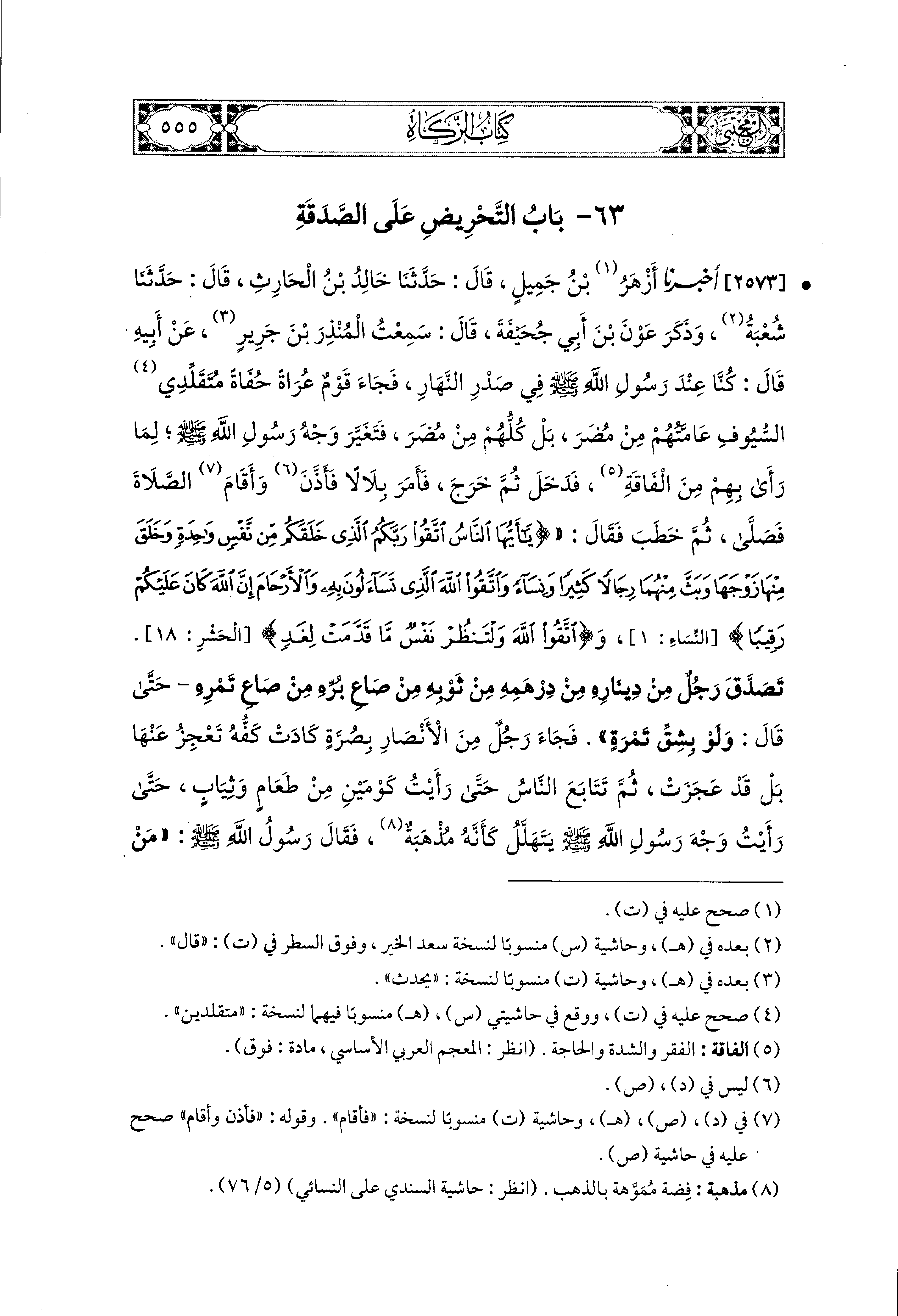 2573- أَخبَرَنا أَزْهَرُ بْنُ جَميلٍ، قال: حَدثنا خَالِدُ بْنُ الحَارِثِ، قال: حَدثنا شُعبَةُ، وَذَكَرَ عَوْنَ بْنَ أَبي جُحَيْفَةَ، قَالَ: سَمِعْتُ المُنْذِرَ بْنَ جَرِيرٍ، عَن أَبيهِ، قَالَ: كُنَّا عِنْدَ رَسُولِ اللهِ صَلى الله عَليه وسَلم، فِي صَدْرِ النَّهَارِ، فَجَاءَ قَوْمٌ عُرَاةً حُفَاةً مُتَقَلِّدِي السُّيُوفِ، عَامَّتُهُمْ مِنْ مُضَرَ، بَلْ كُلُّهُمْ مِنْ مُضَرَ، فَتَغَيَّرَ وَجْهُ رَسُولِ اللهِ صَلى الله عَليه وسَلم لِمَا رَأَى بِهِمْ مِنَ الفَاقَةِ، فَدَخَلَ ثُمَّ خَرَجَ، فَأَمَرَ بِلاَلاً فَأَذَّنَ، وَأَقَامَ الصَّلاَةَ، فَصَلَّى ثُمَّ خَطَبَ، فَقَالَ: {يَا أَيُّهَا النَّاسُ اتَّقُوا رَبَّكُمُ الَّذِي خَلَقَكُمْ مِنْ نَفْسٍ وَاحِدَةٍ، وَخَلَقَ مِنْهَا زَوْجَهَا، وَبَثَّ مِنْهُمَا رِجَالاً كثيرا ونساءً واتقوا الله الَّذِي تَسَاءَلُونَ بِهِ، وَالأَرْحَامَ، إِنَّ اللهَ كَانَ عَلَيْكُمْ رَقِيبًا}