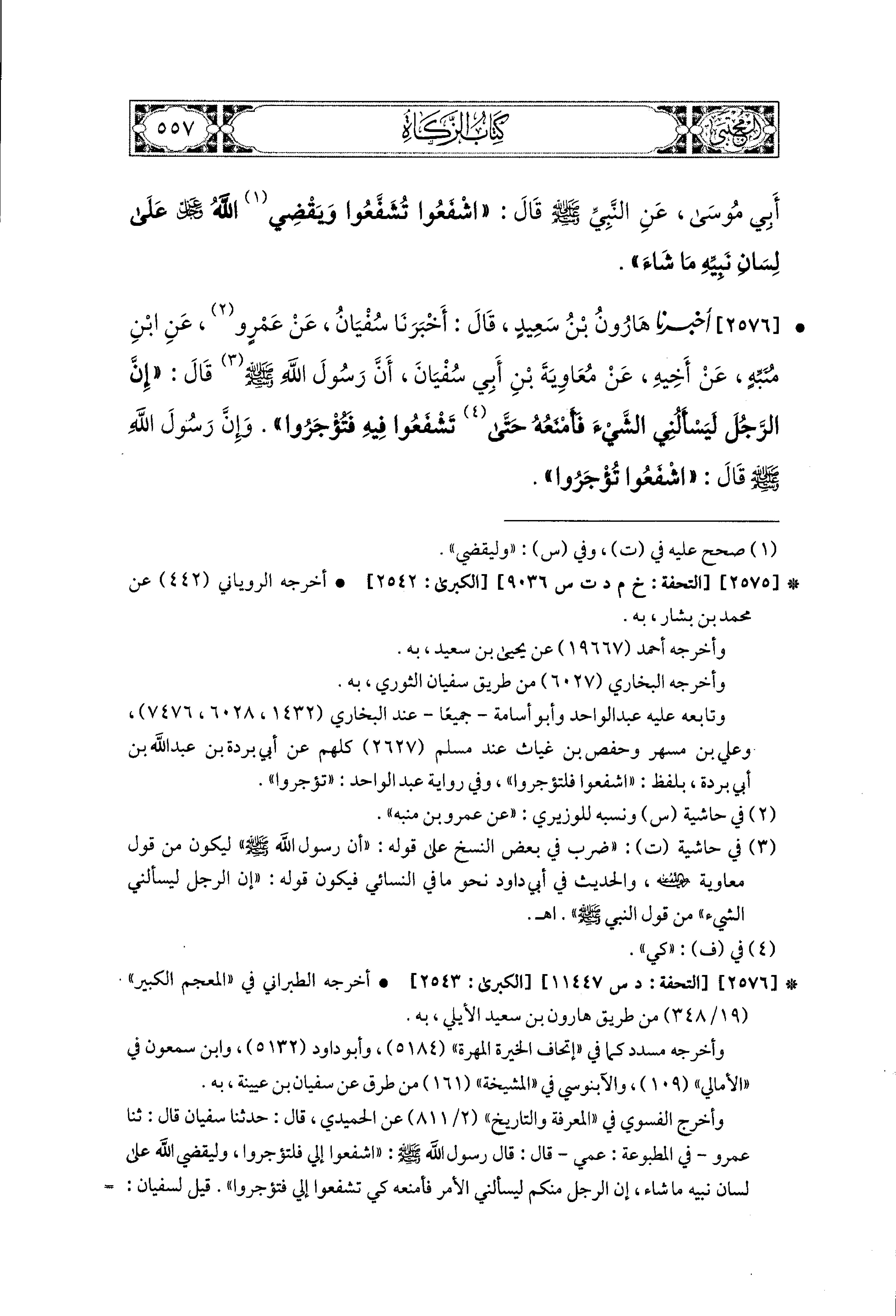 2576- أَخبَرَنا هَارُونُ بْنُ سَعيدٍ، قَالَ: أَخبَرنا سُفيَانُ، عَن عَمْرٍو، عَنِ ابنِ مُنَبِّهٍ، عَن أَخِيهِ، عَن مُعَاوِيَةَ بْنِ أَبي سُفيَانَ، أَنَّ رَسُولَ اللهِ صَلى الله عَليه وسَلم قَالَ: إِنَّ الرَّجُلَ لَيَسْأَلُني الشَّيْءَ فَأَمْنَعُهُ حَتَّى تَشْفَعُوا فِيهِ، فَتُؤْجَرُوا، وَإِنَّ رَسُولَ اللهِ صَلى الله عَليه وسَلم قَالَ: اشْفَعُوا، تُؤْجَرُوا.