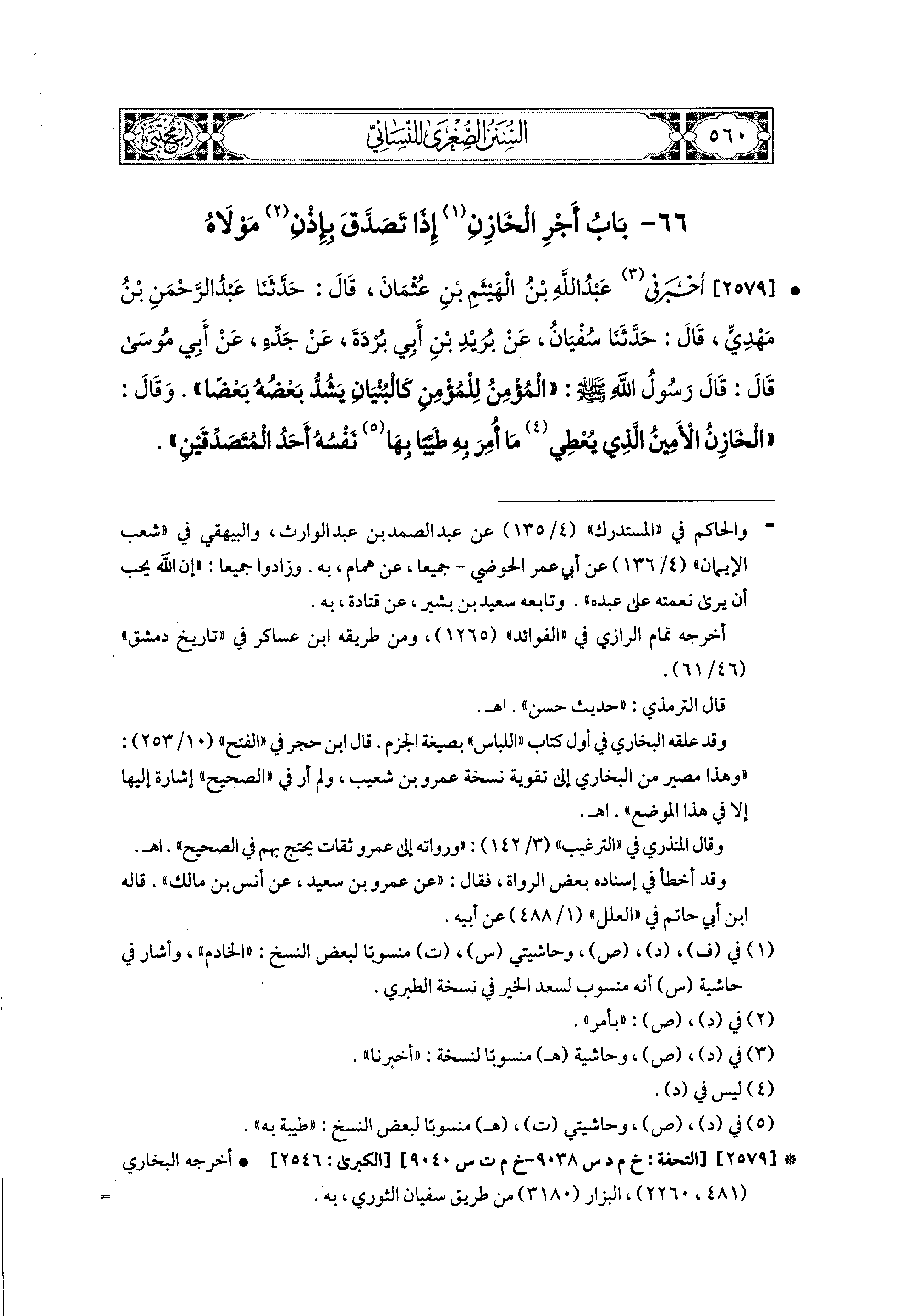 2579- أَخبَرني عَبدُ اللهِ بْنُ الهَيْثَمِ بْنِ عُثمَانَ، قَالَ حَدَّثَنَا عَبدُ الرَّحمَنِ بْنُ مَهْدِيٍّ، قَالَ حَدثنا سُفيان، عَن بُرَيْدِ بْنِ أَبي بُرْدَةَ، عَن جَدِّهِ، عَن أَبي مُوسَى، قَالَ: قَالَ رَسُولُ اللهِ صَلى الله عَليه وسَلم: المُؤْمِنُ لِلْمُؤْمِنِ كَالبُنْيَانِ، يَشُدُّ بَعْضُهُ بَعْضًا، وَقَالَ: الخَازِنُ الأَمينُ: الَّذِي يُعْطِي مَا أُمِرَ بِهِ طَيِّبًا بِهَا نَفْسُهُ أَحَدُ المُتَصَدِّقَيْنِ.